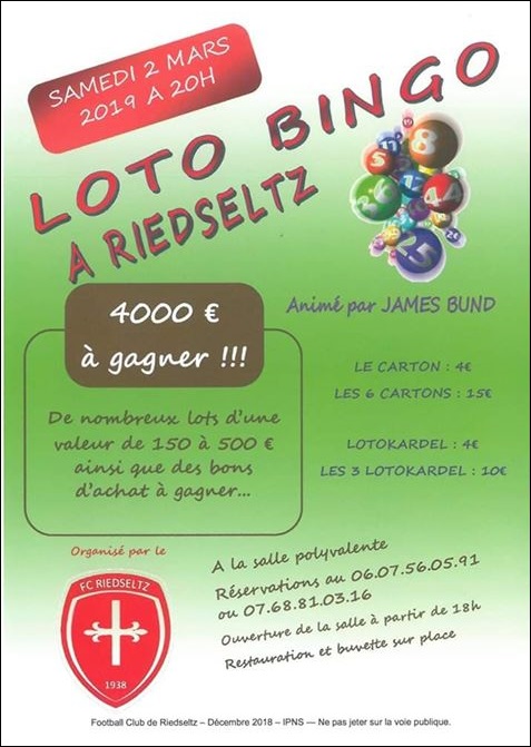 Avant de retrouver les terrains en championnat, le FC Riedseltz vous convie, samedi 2 mars 2019 à partir de 20h00, à un Loto Bingo à la Salle Polyvalente du village sous la direction du fameux James Bund. De nombreux lots d’une valeur de 150 à 500€ sont à gagner tout au long de la soirée. Ouverture de la salle à 18h00. Retrouvez tout autres infos sur le flyer ci-dessous: