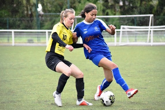 Loin de vouloir se contenter de subir les incursions adverses successives, les protégées de Fall Khady ressortirent de leurs derniers retranchements afin de tenter de surprendre leurs vis-à-vis mais, que ce soit dans l’axe ou par les couloirs, les jaunes et noires ne laissaient rien au hasard au grand dam des assaillantes, ces dernières devant à nouveau se replier suite à cette remontée de balle de Rott Lara sur la gauche l’amenant à décaler le ballon dans l’axe à hauteur des 35m pour Hoffmeyer Kuntz Line, la meneuse de jeu se l’avançant avant de répondre parfaitement à l’appel de Meyer Morgane sur la droite, la défenseuse se prenant le temps de lever la tête avant de remiser le cuir dans l’axe pour Hoffmeyer Kuntz Line qui, en une touche de balle, mit Rott Lara dans de bonnes dispositions dans la zone de vérité afin qu’elle reprenne le cuir d’une frappe croisée s’insérant victorieusement dans le petit filet gauche du but de Ghalman Sarah, on jouait la 26e minute de jeu, 2-0! Accusant le coup suite à ce nouveau but encaissé, les visiteuses engagèrent avant de laisser la libre entreprise à leurs hôtesses, ces dernières redoublant d’énergie sur le front de l’attaque avant que l’arrière-garde bleue ne soit contrainte de jouer le cuir en retrait pour leur gardienne qui, en tergiversant de trop balle au pied, se mit en difficulté sous la pression d’une attaquante adverse et, dans la précipitation, elle parvint tout de même à écarter le cuir sur sa gauche pour Basson Melissia mais ce fut sans compter sur Hoffmeyer Kuntz Line, la meneuse de jeu locale coupant la transmission du cuir avant de s’offrir une percée la conduisant à pénétrer dans la surface de réparation pour finalement conclure sa chevauchée par une frappe passant à droite de la cible, on jouait la 29e minute de jeu. Alors qu’on rentrait dans les dix dernières minutes de jeu de ce premier acte, les jaunes et noires allaient dominer les débats au milieu de terrain avant de faire le siège des derniers retranchements adverses grâce notamment à Schirck Axelle, cette dernière étant idéalement servie dans l’axe avant de lancer Schmitt Clara en profondeur sur la gauche, l’ailière ne se faisant pas prier pour reprendre le ballon d’une frappe étant captée au premier poteau par Ghalman Sarah, on jouait la 32e minute de jeu. Insatiables dans tout ce qu’elles entreprenaient, les Hattenoises allaient continuer de confisquer le ballon à leurs adversaires avant de semer un vent de panique dans leur défense ce qui engendra une erreur de main de Wahibi Kenza intervenant dans l’axe à hauteur des 20m et entraînant un coup franc que Niess Lara se chargea de botter en direction de la niche devant laquelle Ghalman Sarah se troua dans son intervention en manquant de se retourner les doigts, le ballon finissant finalement au fond des filets, on jouait la 36e minute de jeu, 3-0! N’étant plus vraiment dans le coup suite au nouveau coup d’éclat de leurs adversaires, les bleues engagèrent en essayant ensuite de faire bonne figure dans l’entre-jeu mais, face à des jaunes et noires montrant les crocs, elles perdirent la possession du cuir sur la droite avant de voir leurs vis-à-vis développer une action dans le couloir avant, qu’en dernier lieu, Perriot Elsa émette un centre en direction du second poteau pour la reprise de Schmitt Clara passant largement au-dessus de la cible, on jouait la 40e minute de jeu. Dans la foulée de l’exécution du renvoi aux 5.5m précédent, de derniers duels eurent lieu au milieu de terrain avant que l’arbitre ne renvoie les 22 actrices aux vestiaires pour la pause.