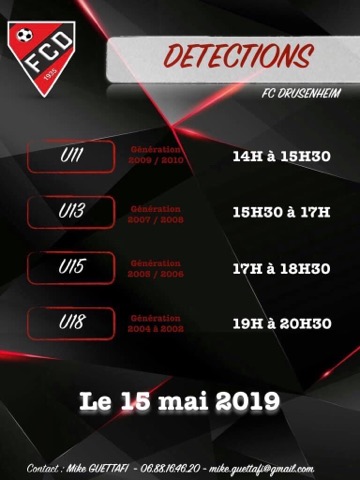 Le FC Drusenheim organise une journée de détection ce mercredi sur leurs installations du Stade Jean Moulin (Avenue Jean-Moulin, 67410 Drusenheim). Aussi le club convie les jeunes de toutes les catégories d’âge à venir participer à l’événement afin d’intégrer les rangs d’ici la reprise des championnats intervenant au courant du mois de septembre. Retrouvez ci-dessous toutes ces catégories par âge et l’heure de passage dédiée à chacune d’entre-elles: