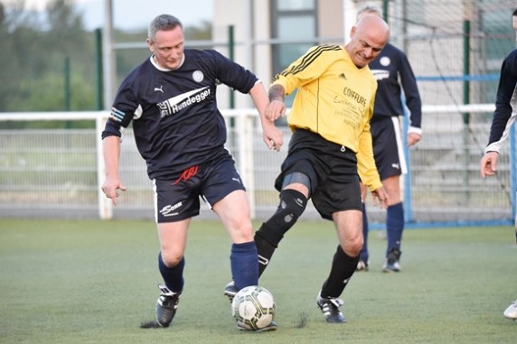 A l’occasion de la 13e journée de championnat chez les Super Vétérans (Gr I), l’AS Hatten 61 accueillait le FCE Schirrhein 61 afin de disputer le titre à une journée du terme de cette saison. C’est dans ce contexte que le coup d’envoi de la rencontre put être donné par Faerber Robert avec, dès la première minute de jeu, une première offensive visiteuse voyant le jour par la droite grâce à cette interception du cuir de Farny Albert précédant une passe lumineuse pour Erbs Jean, ce dernier n’hésitant pas à reprendre le cuir d’une frappe croisée des 13m étant déviée par Lams Jean-Christophe sur l’intérieur du poteau gauche avant que le ballon ne finisse au fond des filets, 0-1! Cueillis à froid dès l’entame, les jaunes et noirs accusaient le coup et ce fait allait avoir des répercutions au cours des minutes suivantes, ces derniers n’arrivant pas à se trouver sur le front de l’attaque, les visiteurs en profitant pour reprendre progressivement le jeu à leur compte à l’image de ce ballon récupéré dans l’entre-jeu par Nedjai Salim, ce dernier se l’avançant sur quelques mètres avant de le décaler sur la gauche et dans la course de Farny Robert qui, des 13m, décocha une frappe passant à gauche de la cible, on jouait la 4e minute de jeu. Suite au renvoi aux 13m effectué par le portier local, les deux équipes se retrouvèrent au milieu de terrain pour une série de duels se soldant par une faute de Nedjai Salim sur Caille Hervé à hauteur de la ligne médiane, ce qui occasionna un coup franc que Matusevich Gennady se chargea de jouer court avec Nevzat Aydin, l’attaquant n’hésitant pas à envoyer Heintz Marcel au charbon dans l’axe avant de le voir perdre le contrôle du cuir face à Mosser Christophe, on jouait la 5e minute de jeu. Consécutivement à la relance de ce dernier, Schitter Damien hérita du ballon sur la gauche avant d’initier un une/deux avec Erbs Jean, l’attaquant lui remisant parfaitement le ballon dans sa course pour finalement voir Forster Christian couper la transmission avant qu’il ne remise le ballon en retrait vers son gardien qui put le distribuer sur sa droite pour Matusevich Gennady, on jouait la 6e minute de jeu. Dans la foulée de la relance précédente, les deux formations allaient se neutraliser un court instant dans l’entre jeu avant qu’un très bon décalage sur la gauche n’intervienne en faveur de Schneider Daniel, ce dernier déboulant dans le couloir afin d’expédier un centre en direction du second poteau pour la tête de Vermon Franck filant à droite de la cible, on jouait la 8e minute de jeu. Alors qu’on atteignait progressivement le premier quart d’heure de jeu, les jaunes et noirs allaient faire le nécessaire pour contenir la fougue adverse assez loin de leur but et, après avoir bataillés durement pour ce faire, une faute de Schitter Damien sur Vermon Franck intervint à hauteur des 18m, ce qui occasionna un coup franc que Schneider Daniel se chargea de botter directement dans un mur de trois joueurs avant d’être en mesure de reprendre le cuir d’une frappe forçant Sutter Rémi à la parade pour écarter le ballon en corner pour un coup de pied de coin que Schneider Daniel se chargea de botter de la droite en direction du premier poteau devant lequel Strebler Dominique veillait au grain en pouvant dégager le danger. Les débats tendants à s’équilibrer au milieu de terrain, les locaux allaient pouvoir enfin rivaliser avec leurs adversaires et, après quelques minutes passées à se jeter sur tous les ballons, ils trouvèrent une ouverture dans l’axe par l’intermédiaire de Heintz Marcel, ce dernier contraignant la défense visiteuse à concéder un corner que Schneider Daniel se chargea de botter tendu de la droite mais sa remise transperça la meute de joueurs présente au point de penalty avant de mourir en touche sur le côté gauche, on jouait la 18e minute de jeu.