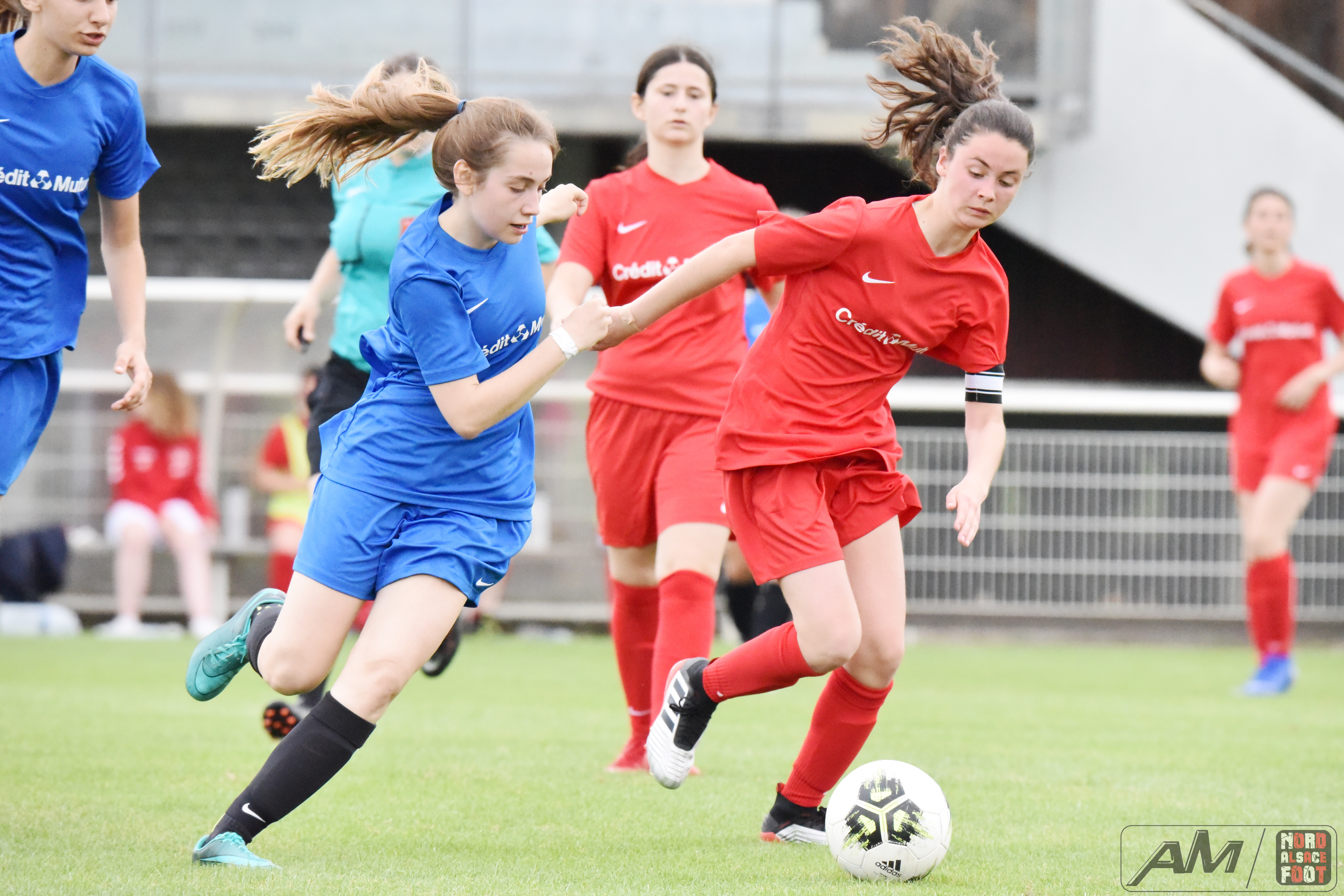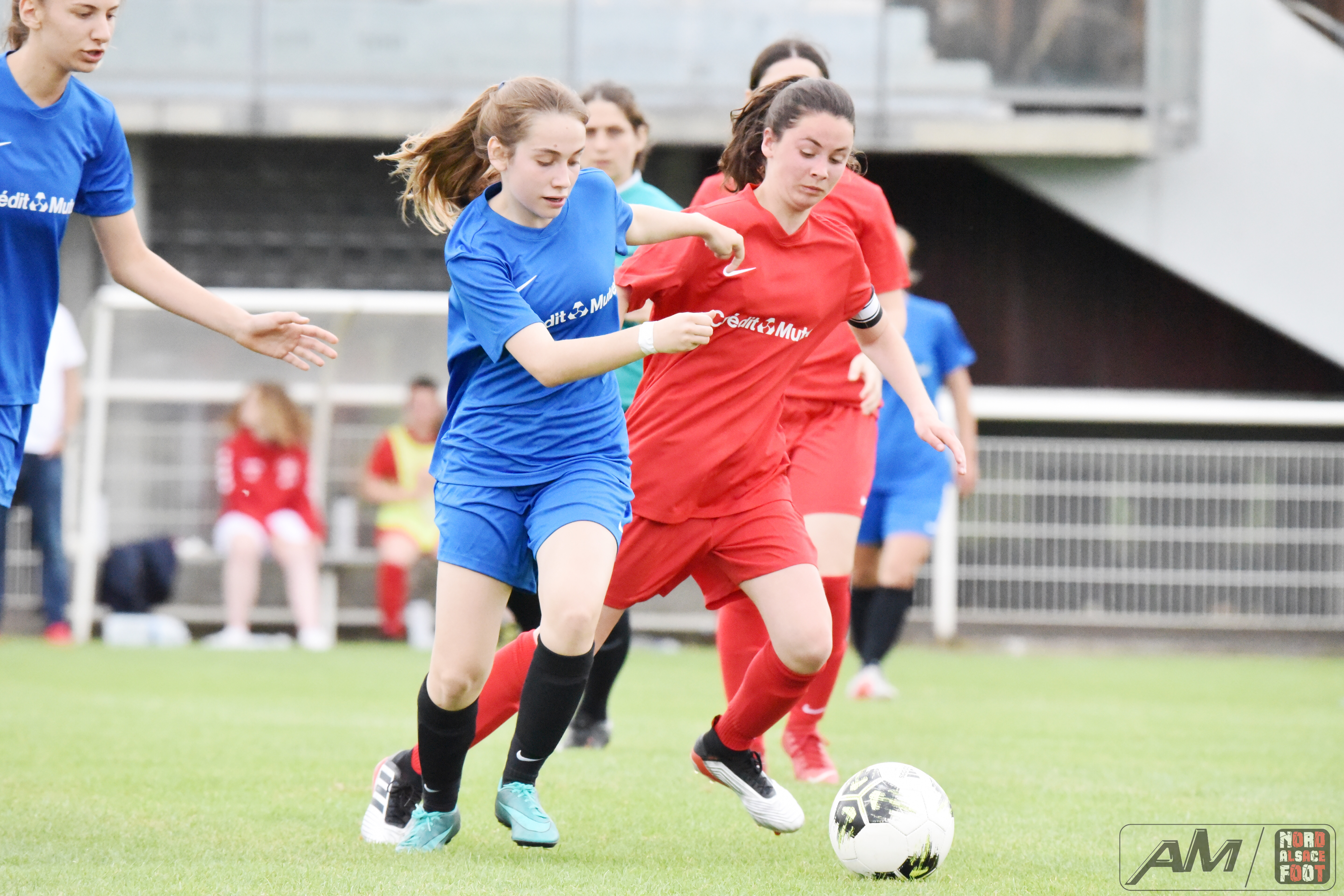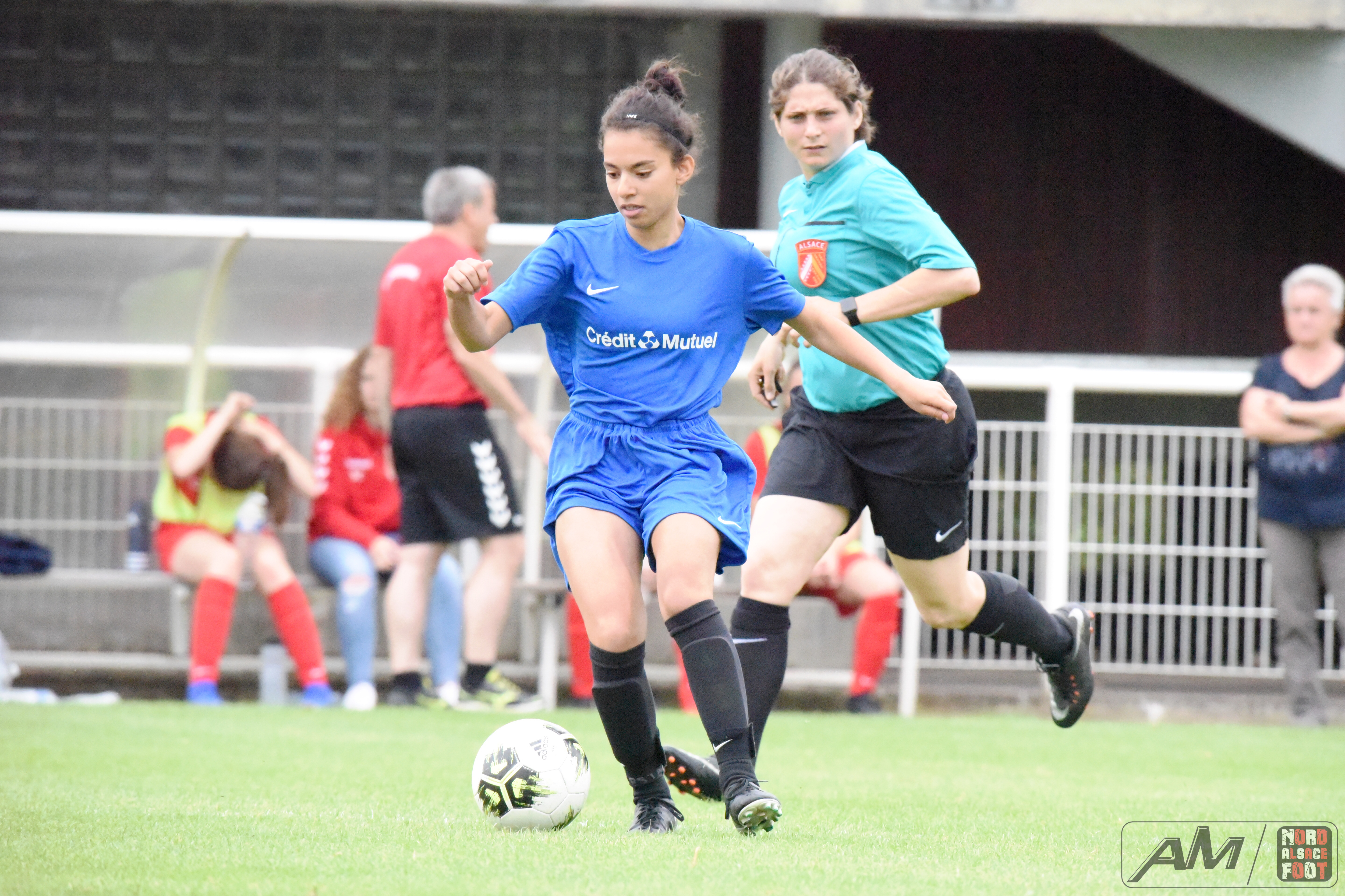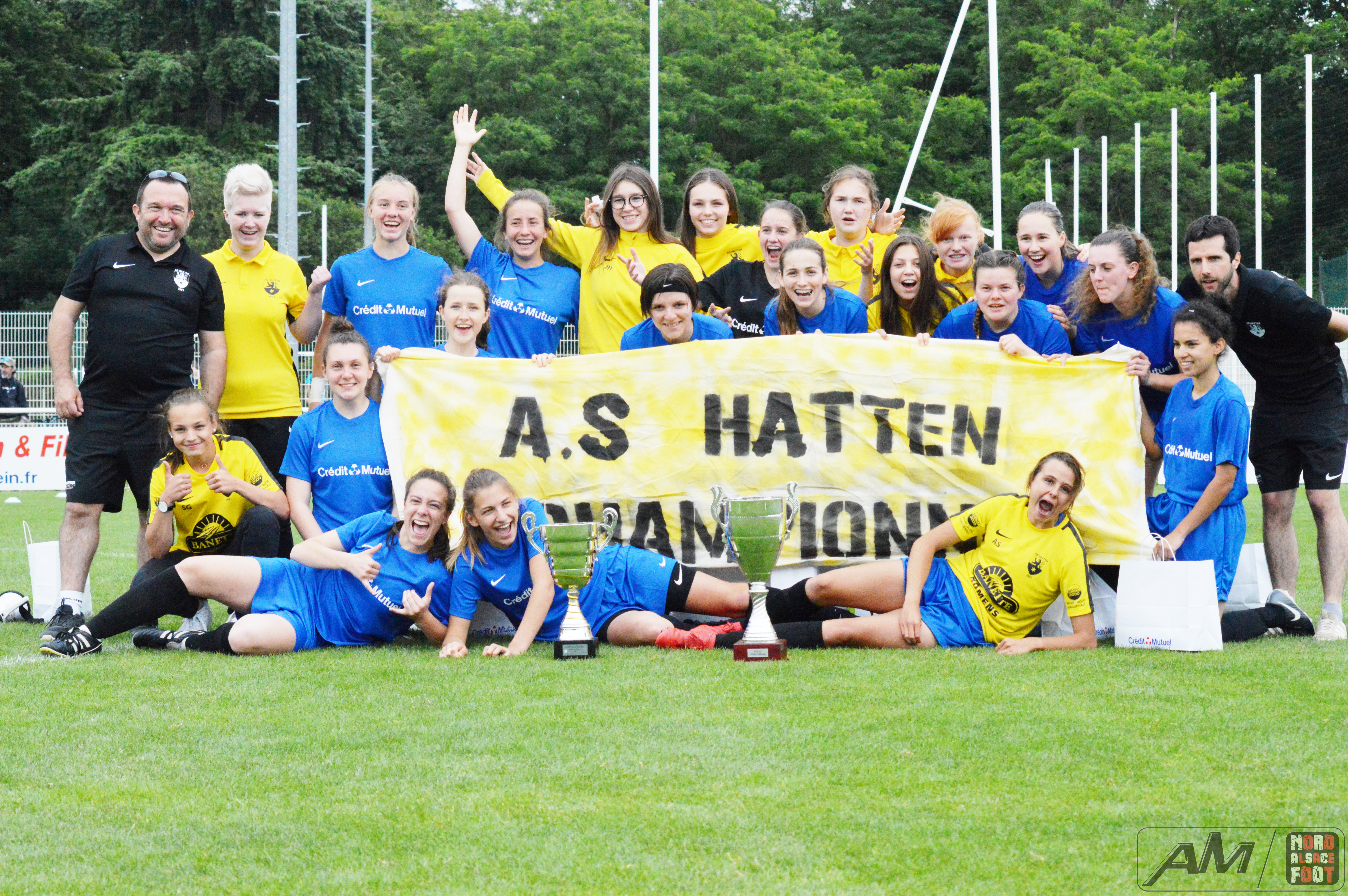 A l’occasion de la finale de la Coupe d’Encouragement Crédit Mutuel des U18/F, l’AS Hatten F et l’entente Kochersberg/Stutzheim F se sont données rendez-vous à Eckbolsheim ce dimanche afin de tenter de finir la saison en apothéose en se disputant le titre dans la plus prestigieuse des coupes de cette catégorie. Après une première période se soldant par un score nul et vierge malgré la pléiade d’occasions manquées par les Hattenoises, les débats s’équilibrèrent lors du second acte sans toutefois voir les filets trembler de part ou d’autre avant que la séance de tirs-au-but ne permette aux protégées du duo Bonnet/Ortega de soulever le trophée au terme d’une séance de loterie haletante. Retrouvez quelques images de cette rencontre et, pour en apprécier le contenu, veuillez cliquer sur l’une d’entre-elles pour afficher le diaporama.
