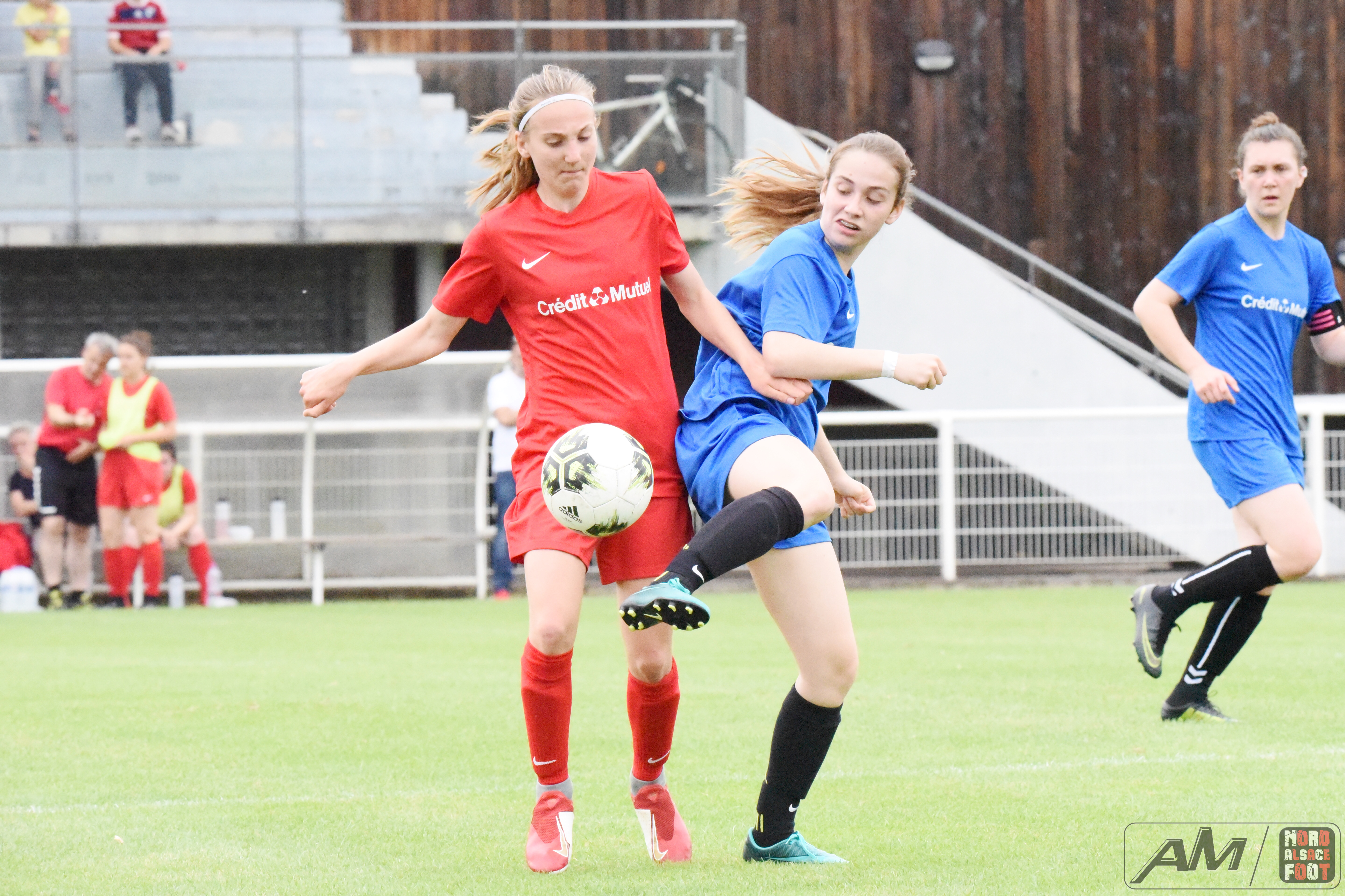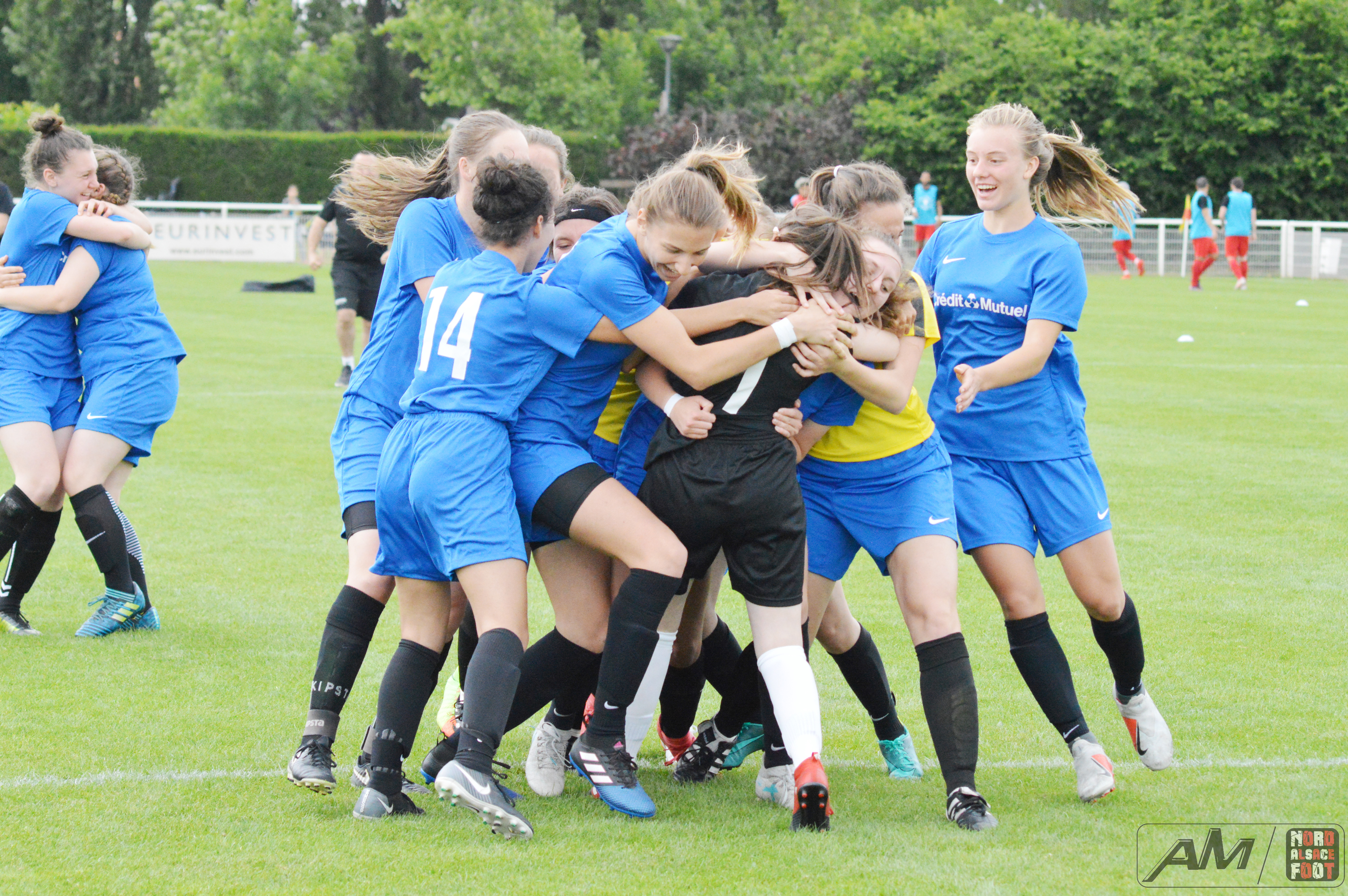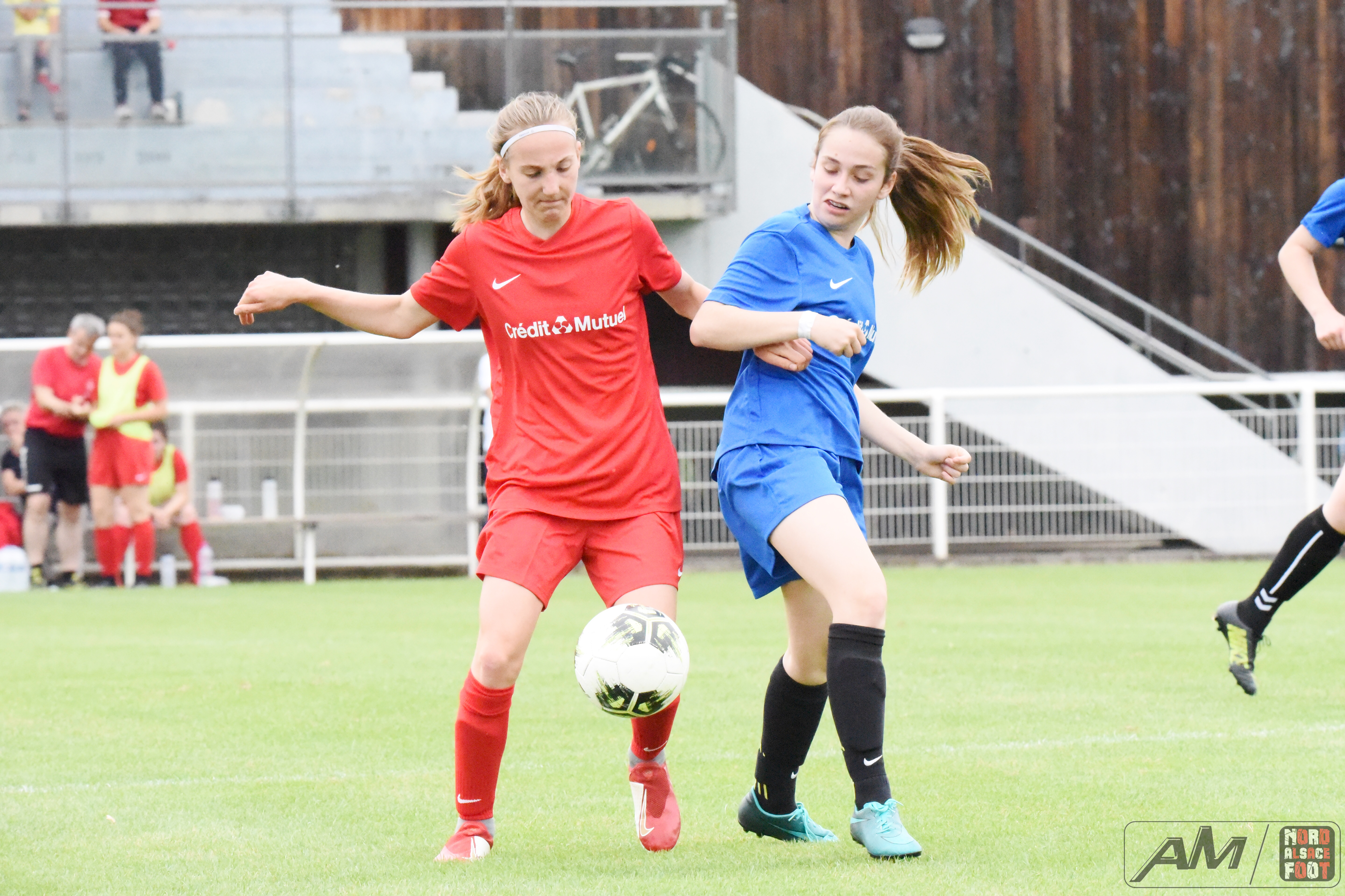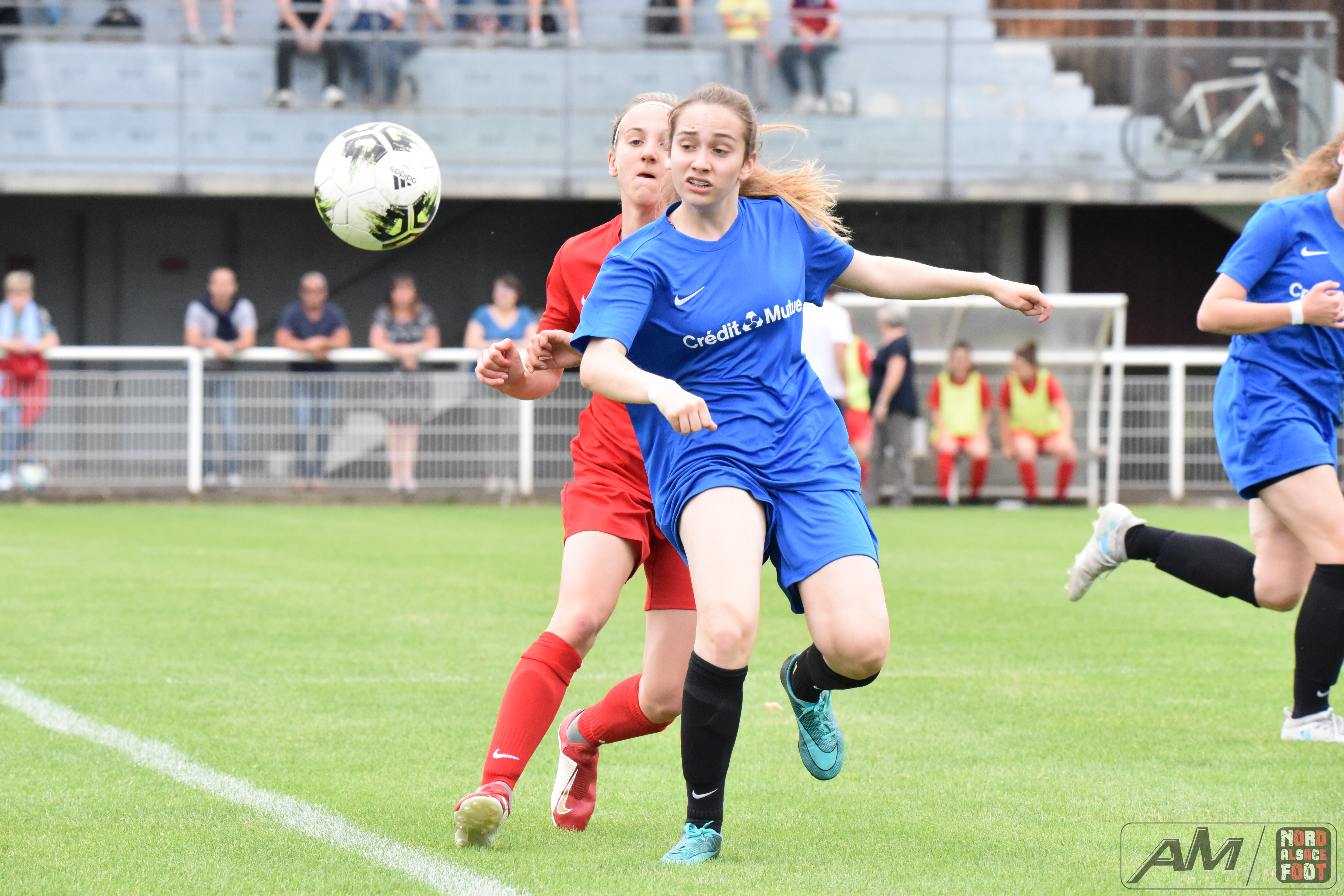 A l’occasion de la finale de la Coupe d’Encouragement Crédit Mutuel des U18/F, l’AS Hatten F et l’entente Kochersberg/Stutzheim F se sont données rendez-vous à Eckbolsheim ce dimanche afin de tenter de finir la saison en apothéose en se disputant le titre dans la plus prestigieuse des coupes de cette catégorie. Après une première période se soldant par un score nul et vierge malgré la pléiade d’occasions manquées par les Hattenoises, les débats s’équilibrèrent lors du second acte sans toutefois voir les filets trembler de part ou d’autre avant que la séance de tirs-au-but ne permette aux protégées du duo Bonnet/Ortega de soulever le trophée au terme d’une séance de loterie haletante. Retrouvez quelques images de cette rencontre et, pour en apprécier le contenu, veuillez cliquer sur l’une d’entre-elles pour afficher le diaporama.