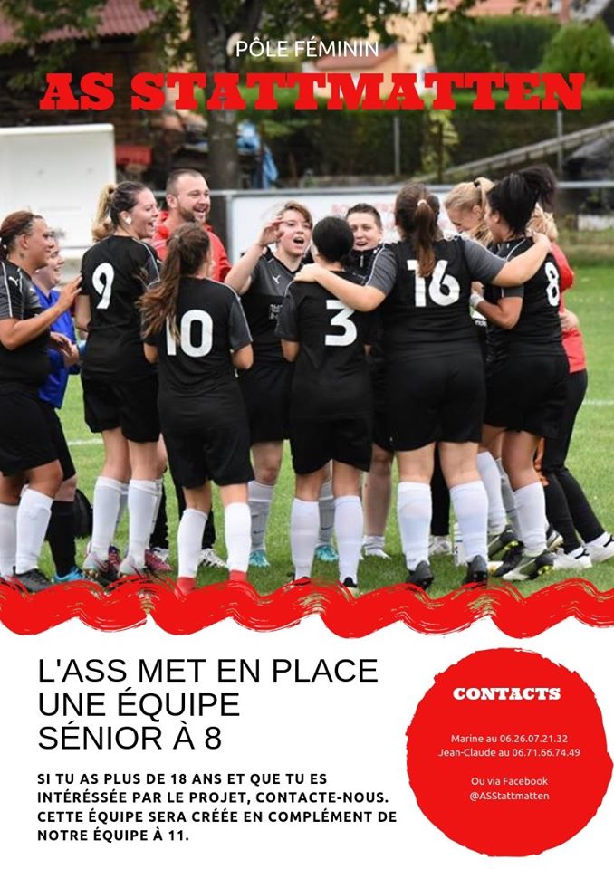 Dans le cadre de son développement, l’AS Stattmatten – Pôle Féminin recrute des joueuses en vue de recréer une équipe de Seniors Féminines à 8 pour une inscription en championnat dès la saison à venir. Aussi, si vous êtes âgée de plus de 18 ans et que l’aventure vous tente, veuillez prendre contact avec Marine au 0626072132 ou avec Jean-Claude au 0671667449 mais vous pouvez aussi vous manifester en vous rendant sur la Page Facebook de l’AS Stattmatten-Pôle Féminin