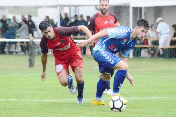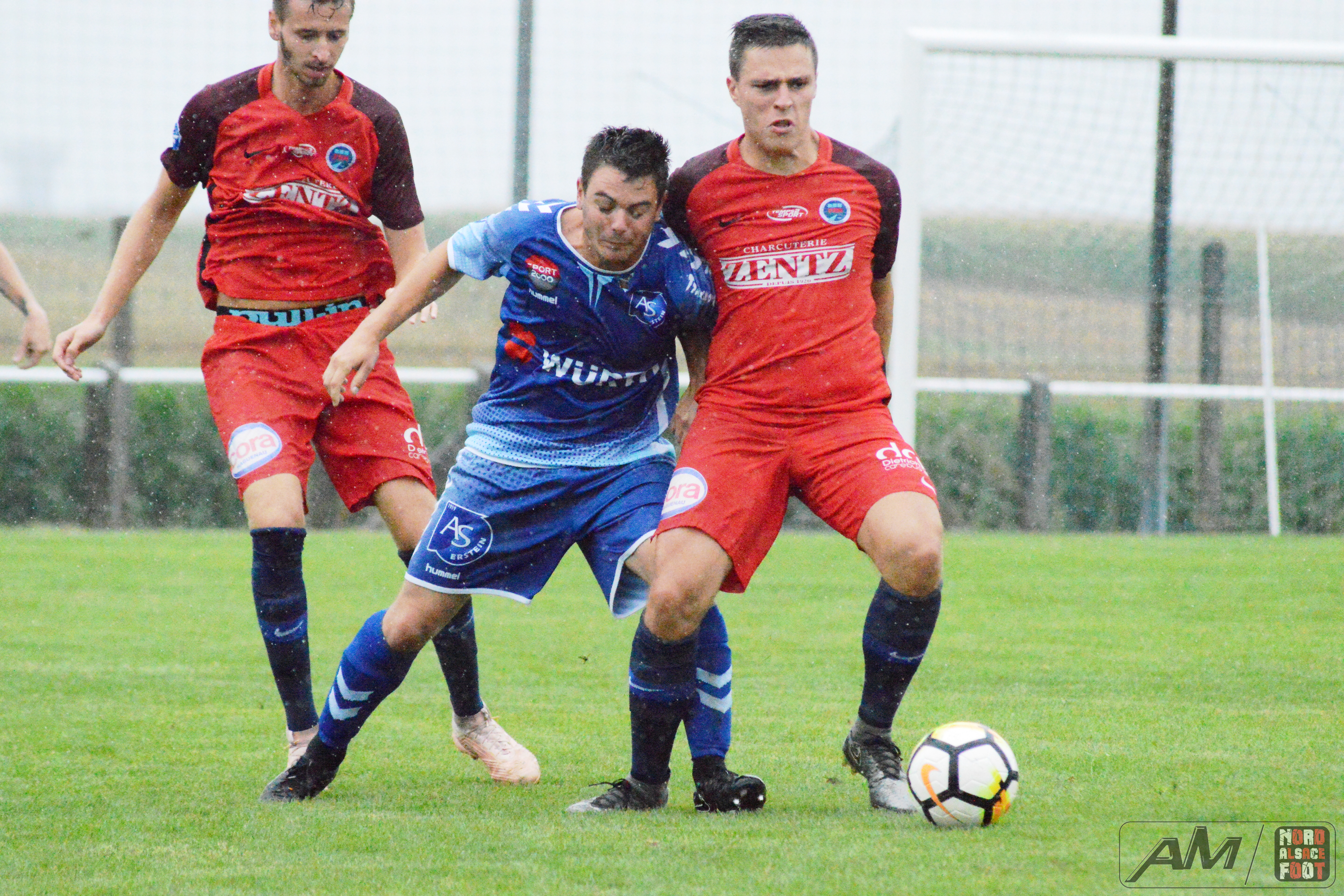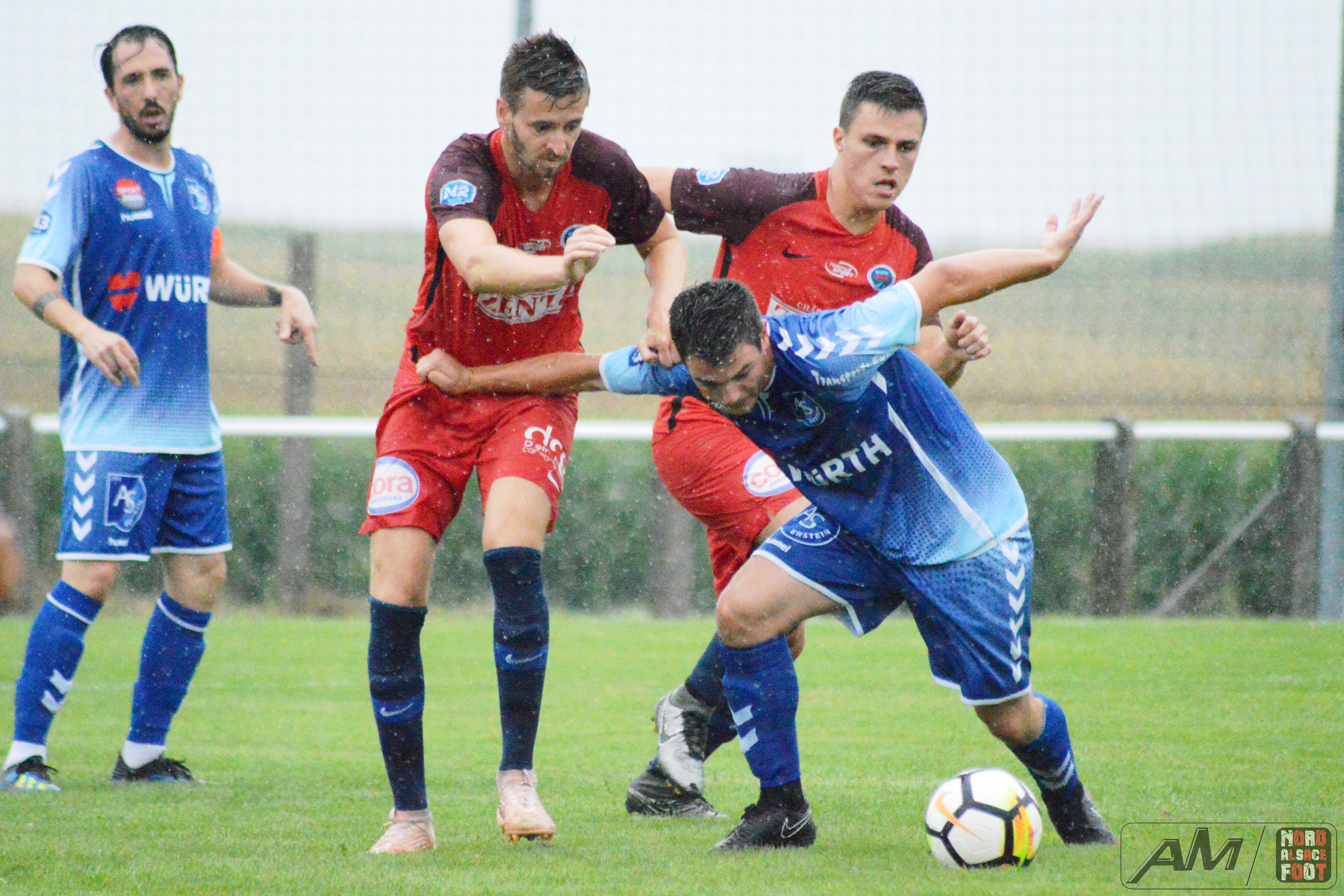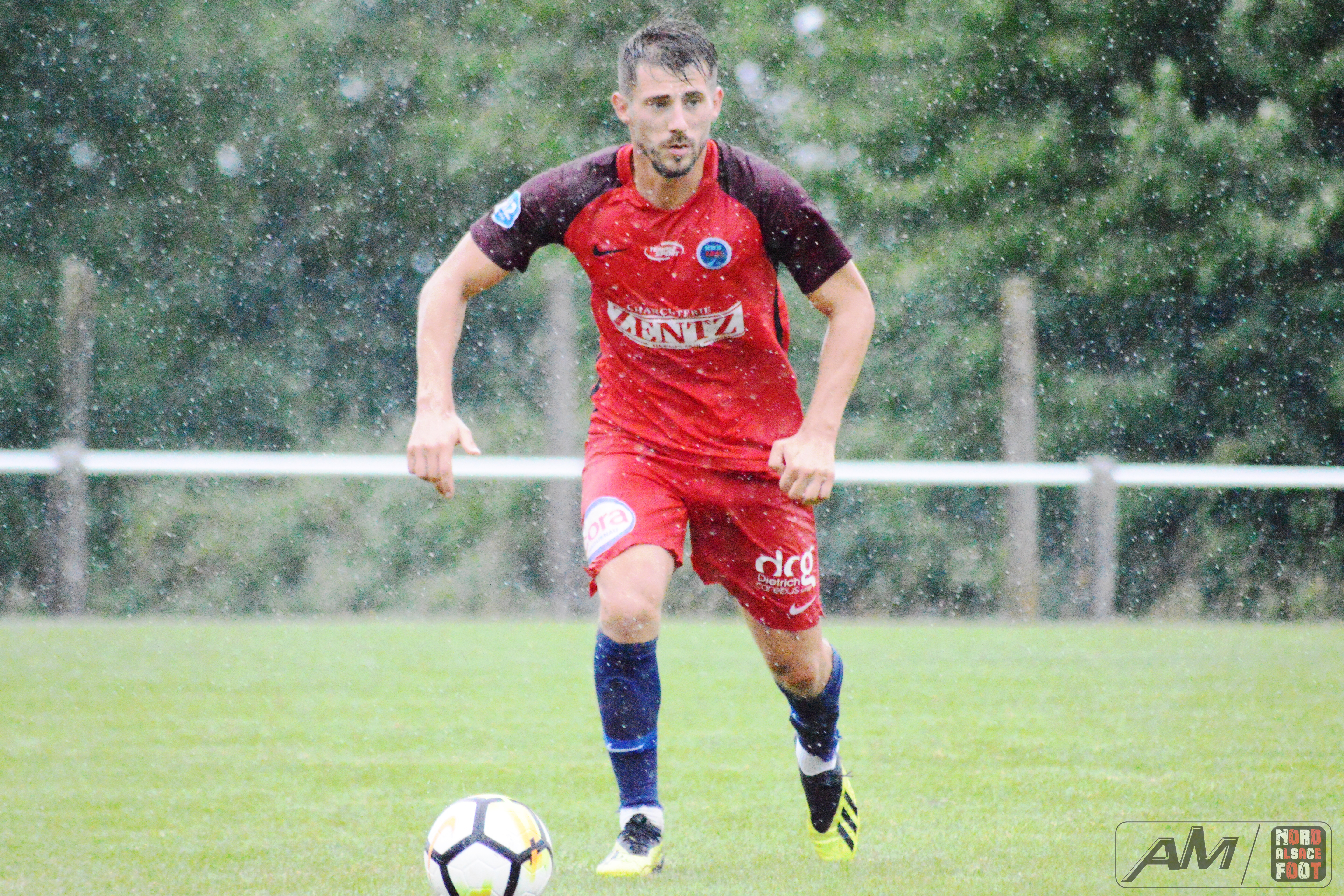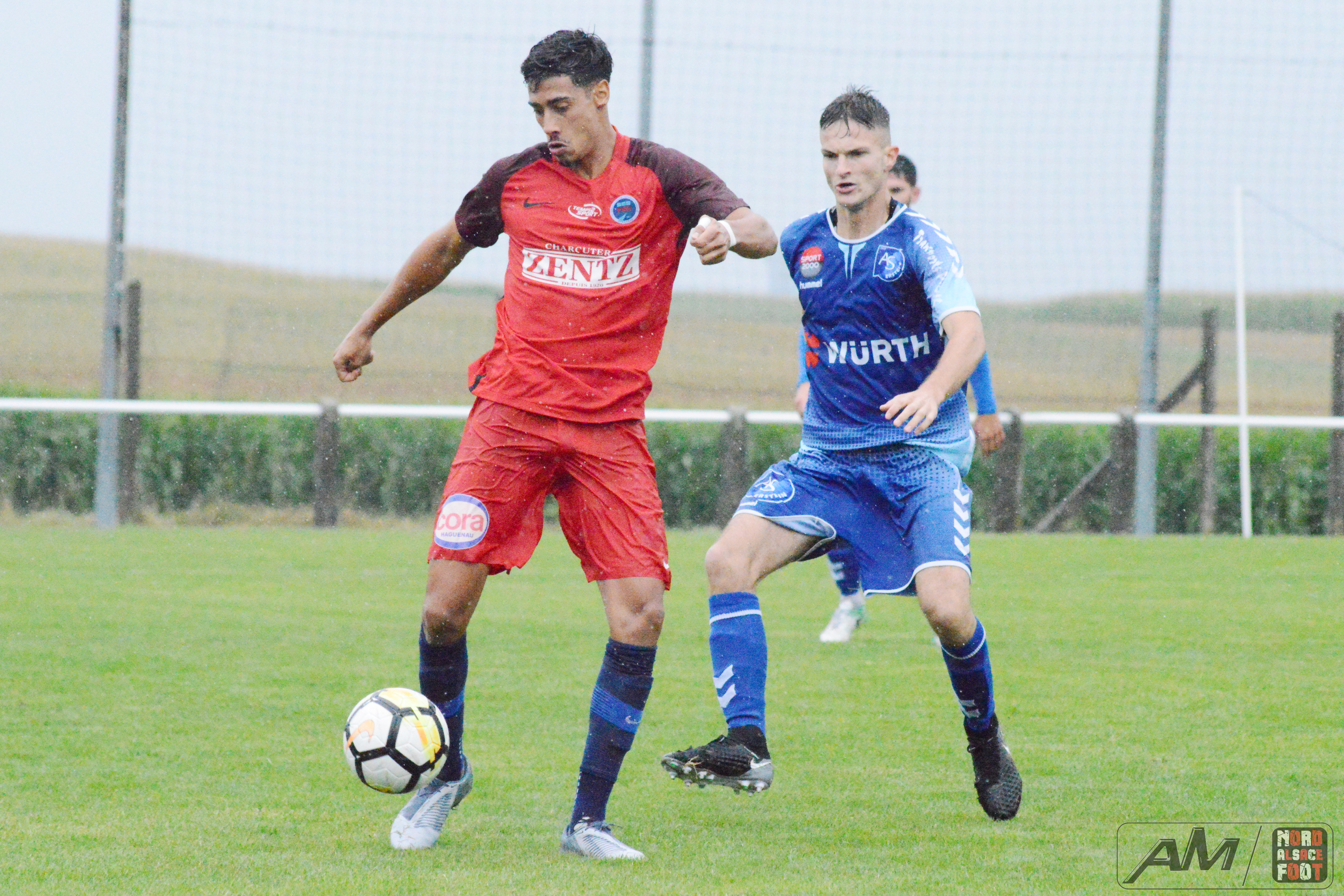 A l’occasion d’un match de gala clôturant les festivités entourant le 65e anniversaire du SC Rittershoffen, le FCSR Haguenau 2 affrontait l’AS Erstein 1 afin de poursuivre leur préparation estivale avant que les deux équipes ne se retrouvent en championnat le 1er septembre prochain du côté d’Erstein. Après une première période se soldant par un score de parité grâce à l’ouverture du score haguenovienne signée Diebold Yann (37e) suivie de l’égalisation de Sabo Jean-Philippe (41e), les rouges allaient finir par prendre définitivement l’avantage à la 67e minute de jeu grâce à un coup franc victorieux signé Hintenoch Nicolas. Retrouvez quelques images de cette rencontre et, pour en apprécier le contenu, veuillez cliquer sur l’une d’entre-elles pour afficher le diaporama.