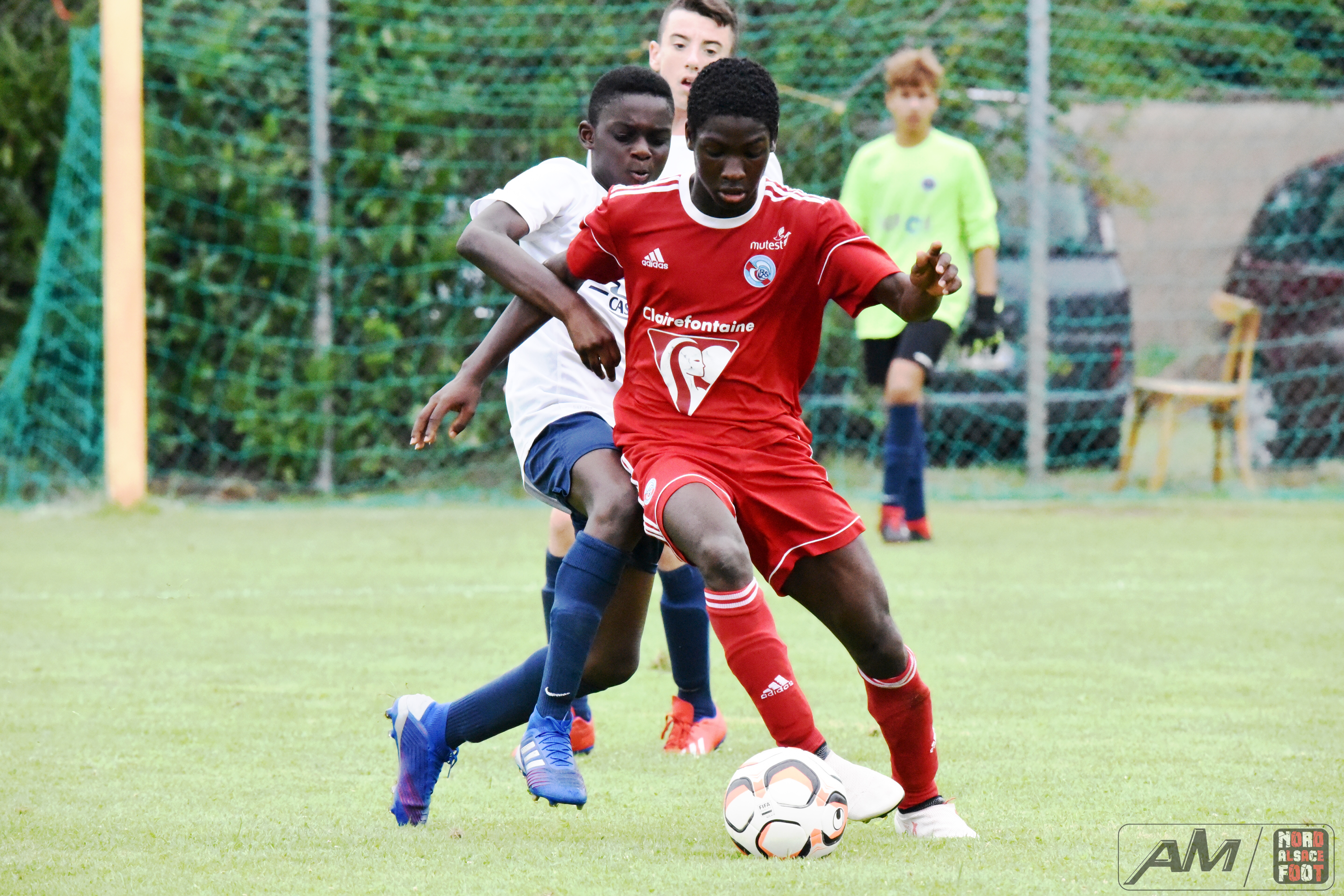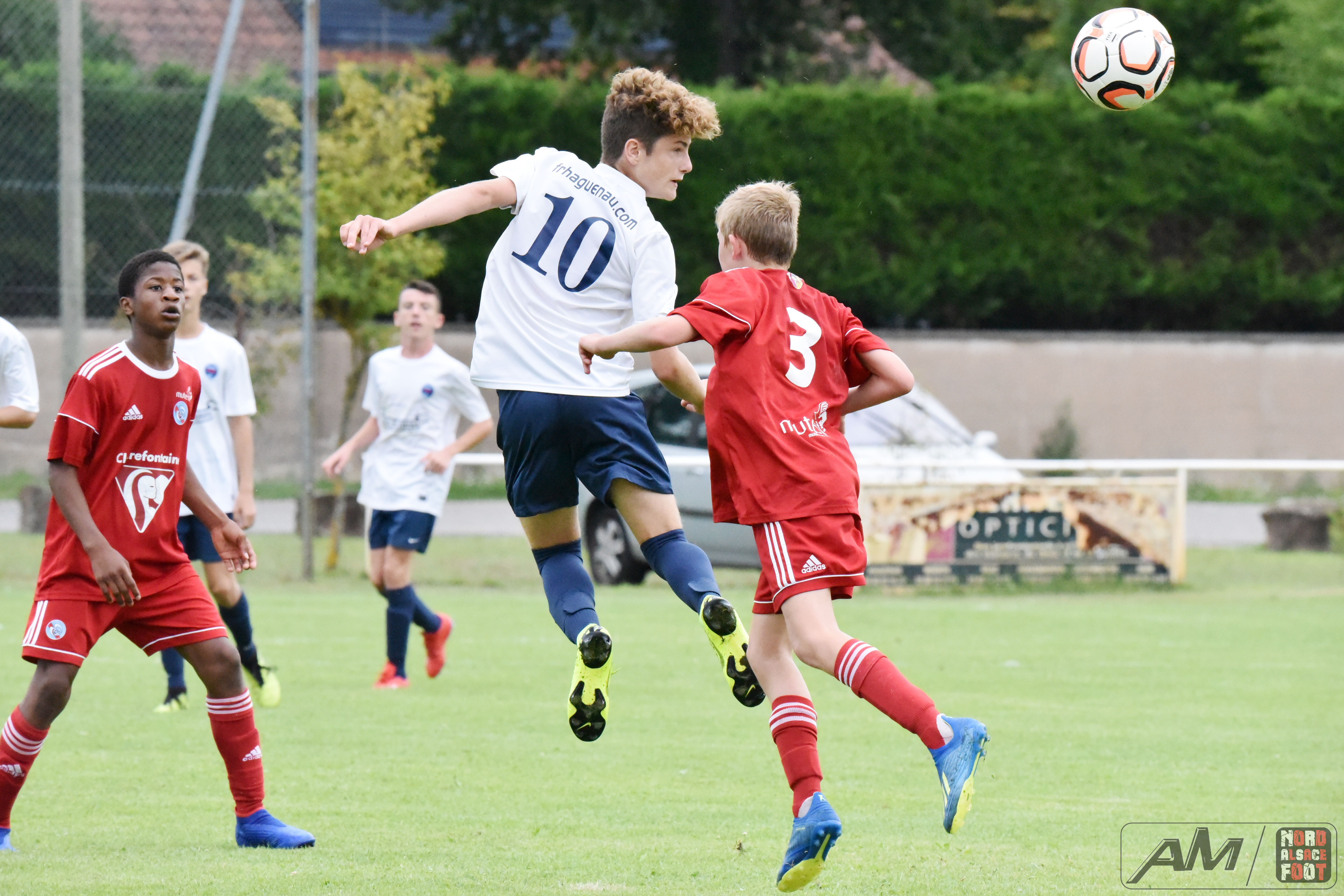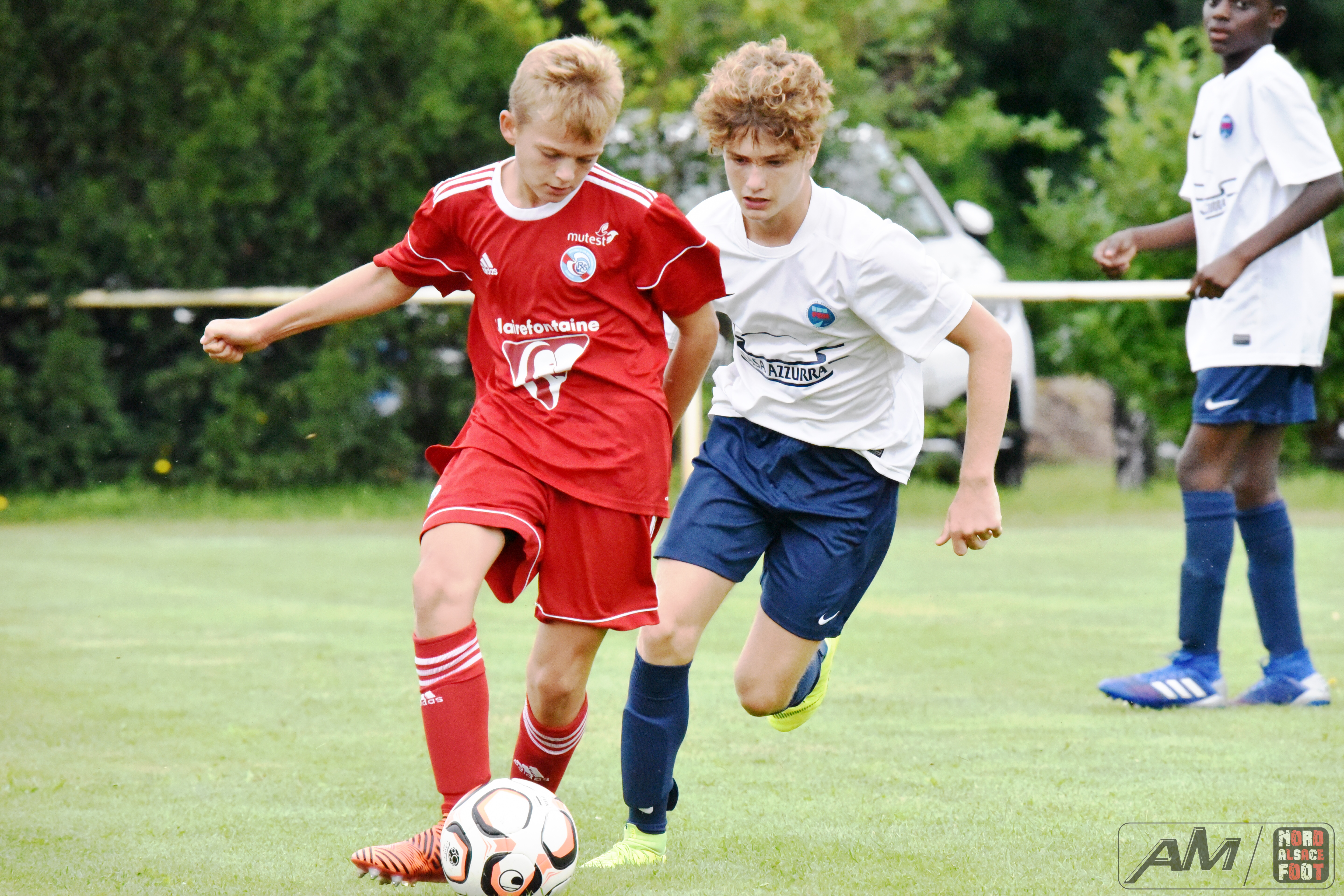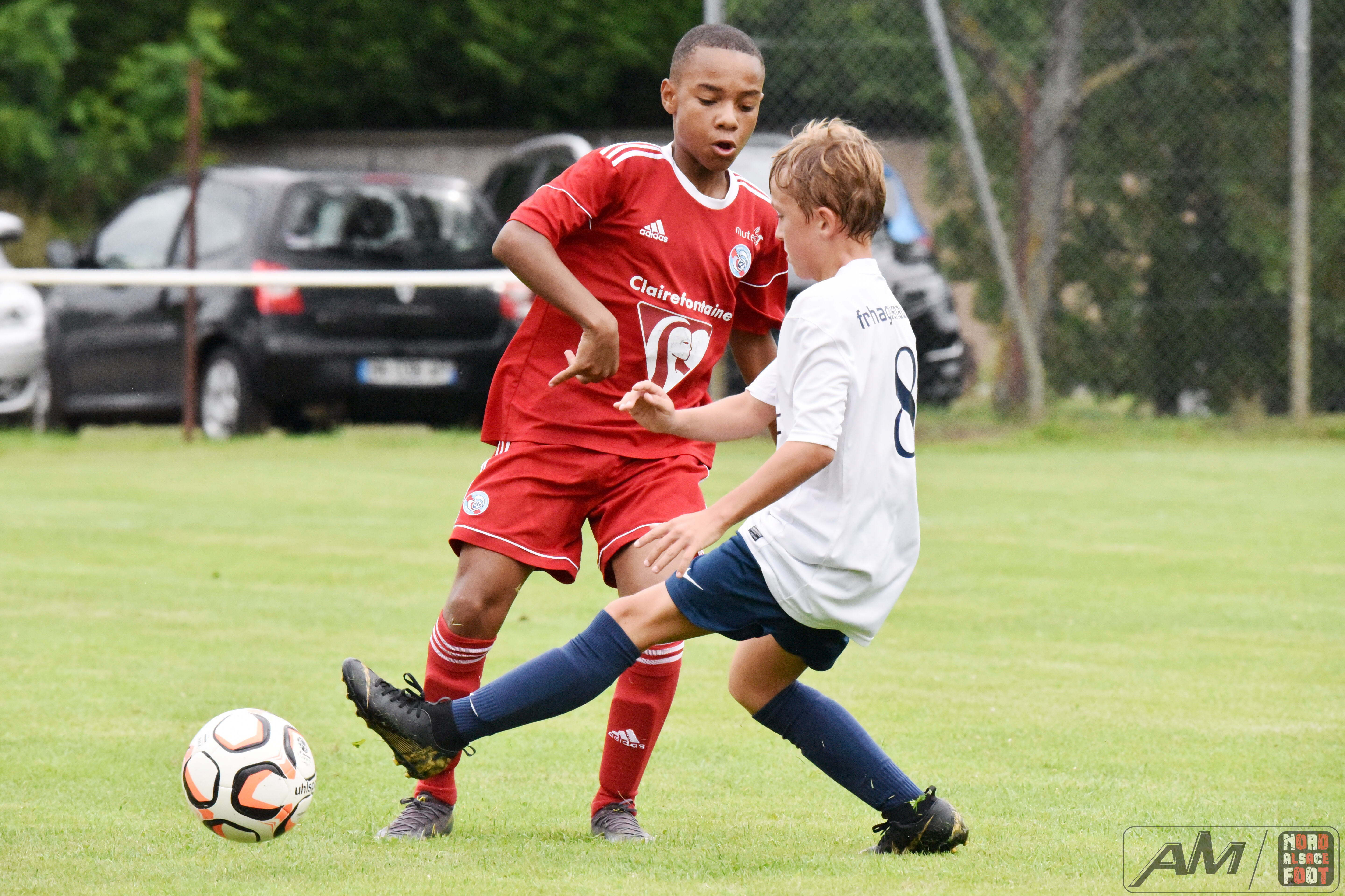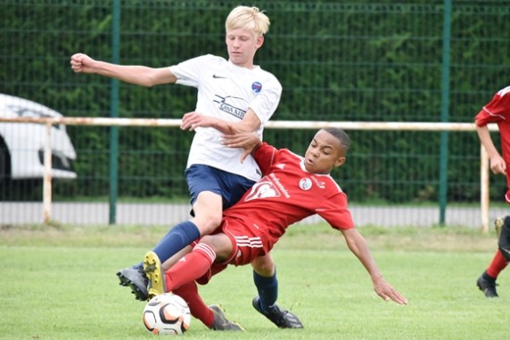 A l’occasion de la première “Journée de Foot” organisée par le Real Schloessel, les U15 du FCSR Haguenau (blancs et bleus) affrontaient ceux du RC Strasbourg Alsace (Rouges) afin de peaufiner les premiers automatismes avant la reprise de la compétition intervenant dans deux semaines. Après une première période se soldant par un net avantage en faveur des Strasbougeois grâce à une réalisation inscrite par Stroh Maxence (4e) suivi d’un doublé de Pelletier Romain (10e et 12e), le tout agrémenté d’un but de Handwerk Mattéo (27e) contre une réduction du score signée Mockers Ludovic (37e) pour les Haguenoviens, les rouges allaient aggraver la marque grâce à un doublé de Handwerk Mattéo (44e) avant que Abakar Youssouf ne lui emboîte le pas à la 50e minute de jeu pour finalement voir Wagner Nathan réduire la marque à la 53e minute de jeu, Maliska Nicolas (60e) et Abakar Youssouf enfonçant ensuite le clou afin de permettre à leur équipe de s’imposer sur ce score sans appel de 8-2! Retrouvez quelques images de cette rencontre et, pour en apprécier le contenu, veuillez cliquer sur l’une d’entre-elle pour afficher le diaporama.