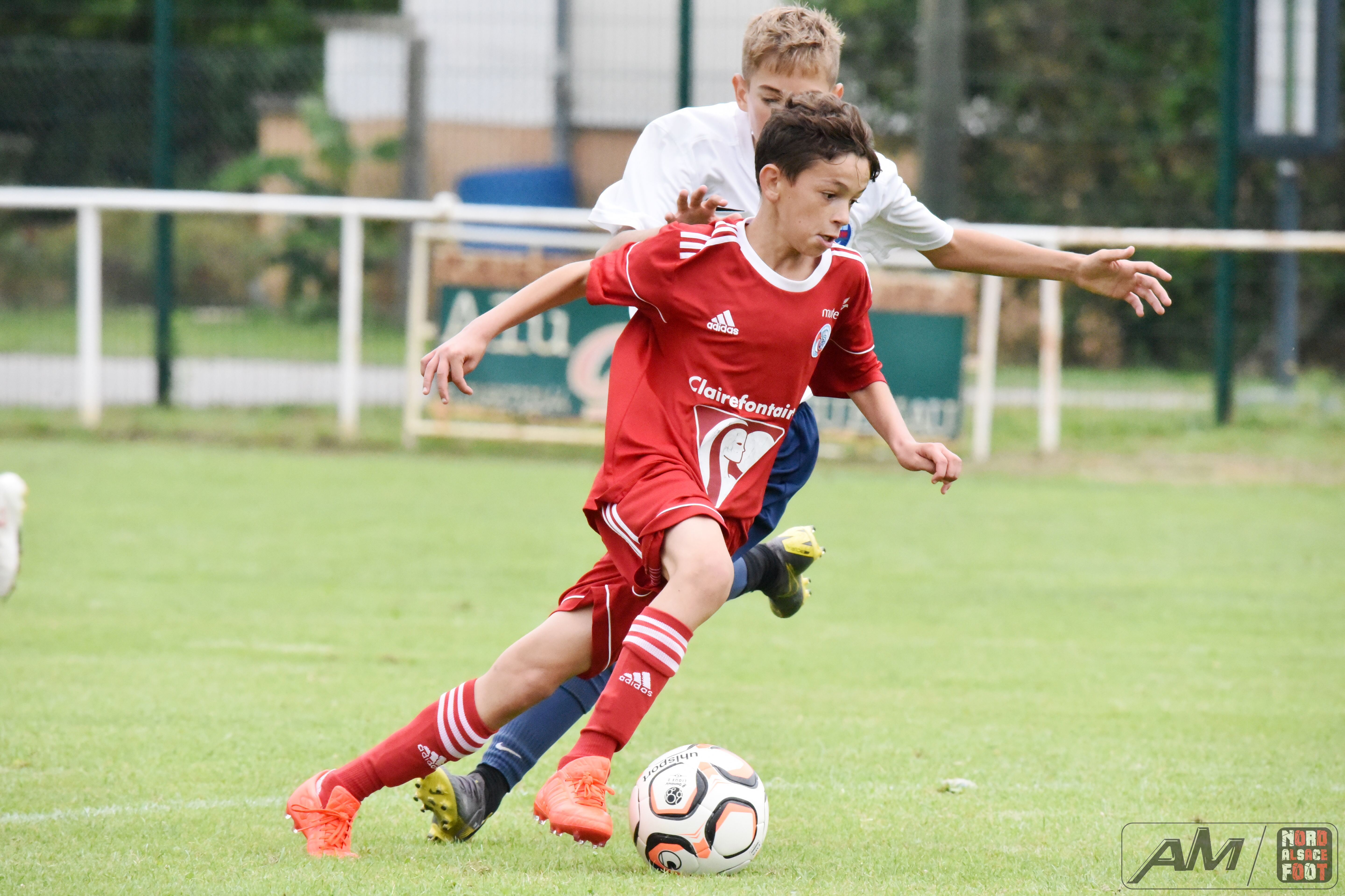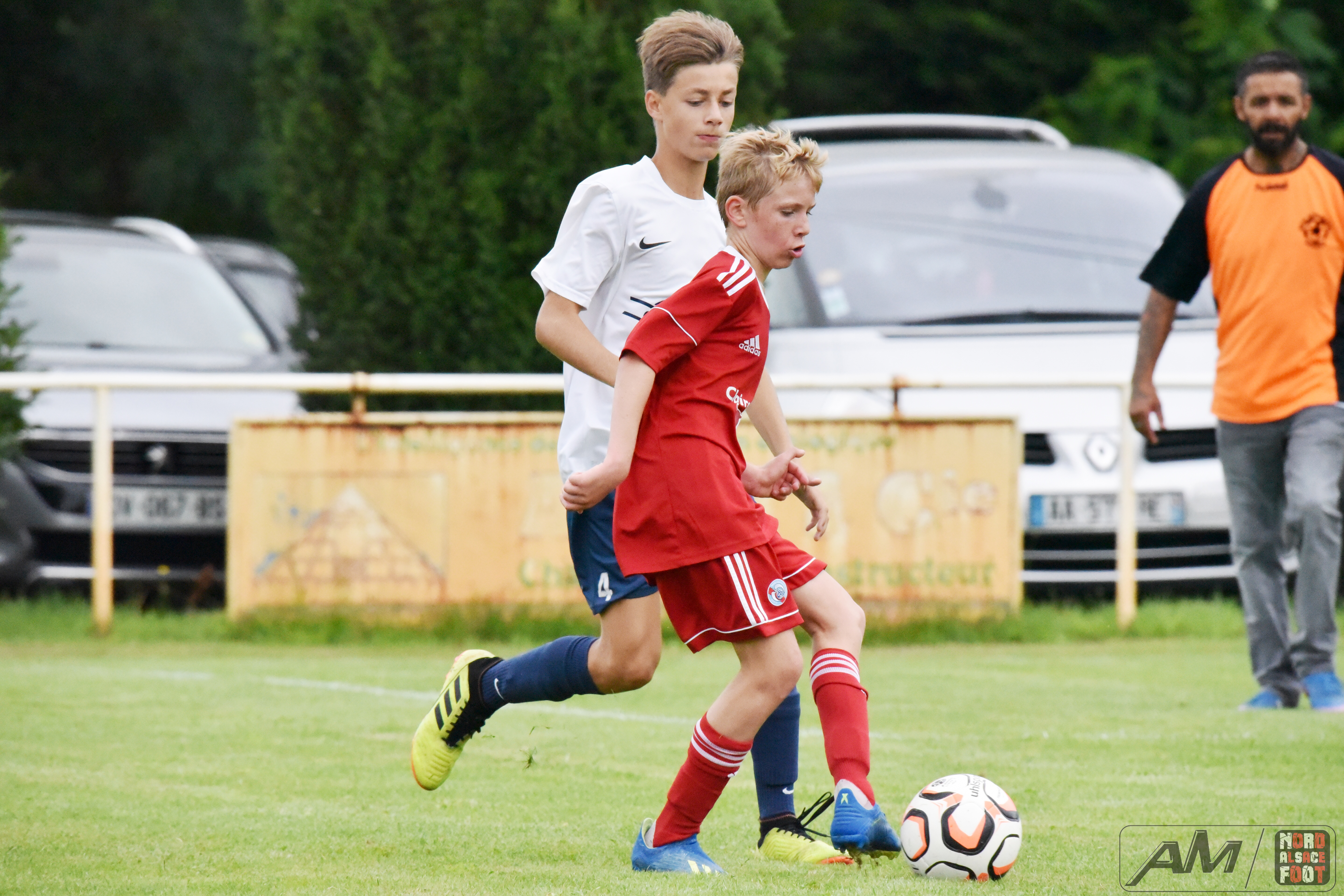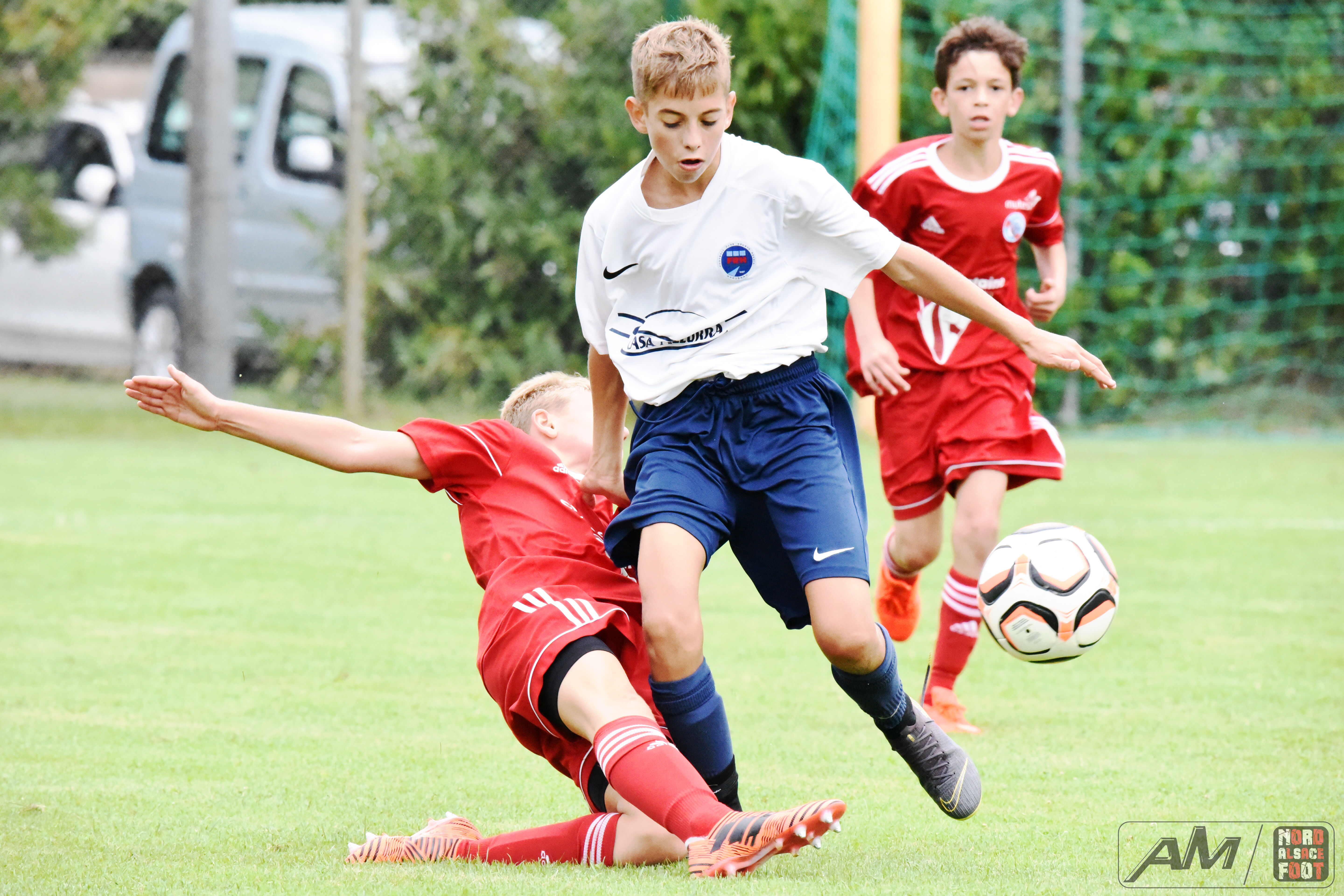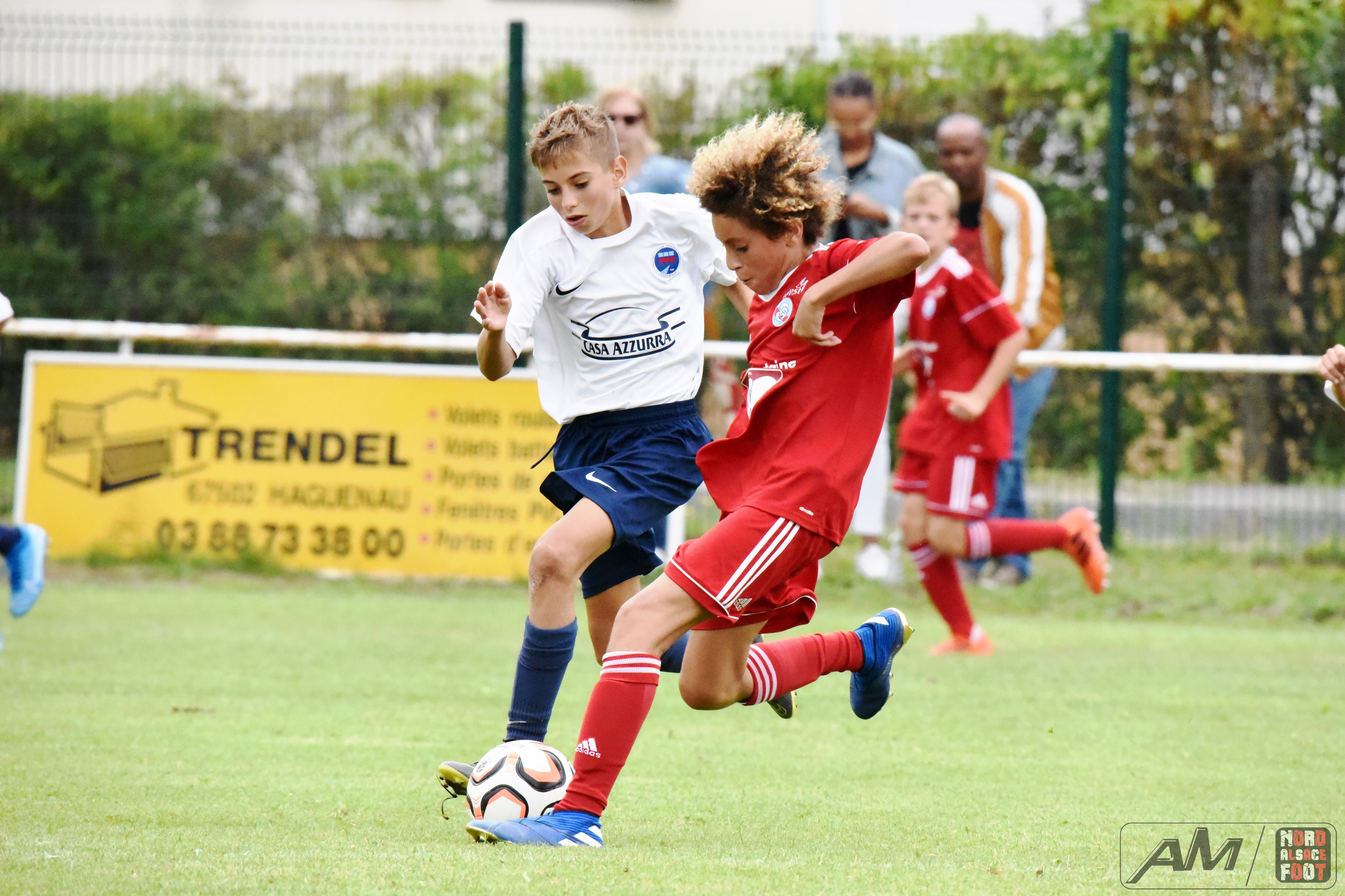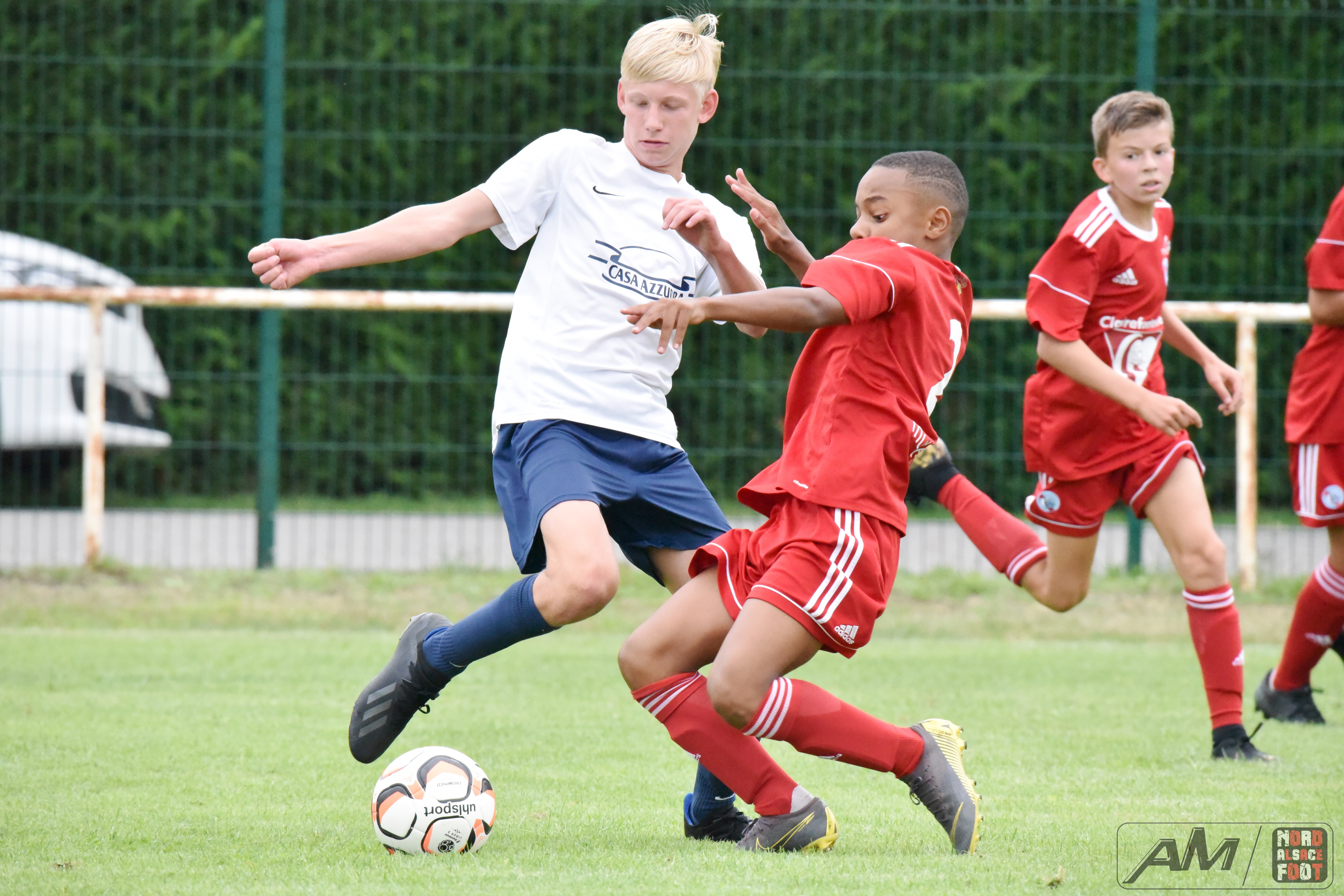 A l’occasion de la première “Journée de Foot” organisée par le Real Schloessel, les U15 du FCSR Haguenau (blancs et bleus) affrontaient ceux du RC Strasbourg Alsace (Rouges) afin de peaufiner les premiers automatismes avant la reprise de la compétition intervenant dans deux semaines. Après une première période se soldant par un net avantage en faveur des Strasbougeois grâce à une réalisation inscrite par Stroh Maxence (4e) suivi d’un doublé de Pelletier Romain (10e et 12e), le tout agrémenté d’un but de Handwerk Mattéo (27e) contre une réduction du score signée Mockers Ludovic (37e) pour les Haguenoviens, les rouges allaient aggraver la marque grâce à un doublé de Handwerk Mattéo (44e) avant que Abakar Youssouf ne lui emboîte le pas à la 50e minute de jeu pour finalement voir Wagner Nathan réduire la marque à la 53e minute de jeu, Maliska Nicolas (60e) et Abakar Youssouf enfonçant ensuite le clou afin de permettre à leur équipe de s’imposer sur ce score sans appel de 8-2! Retrouvez quelques images de cette rencontre et, pour en apprécier le contenu, veuillez cliquer sur l’une d’entre-elle pour afficher le diaporama.