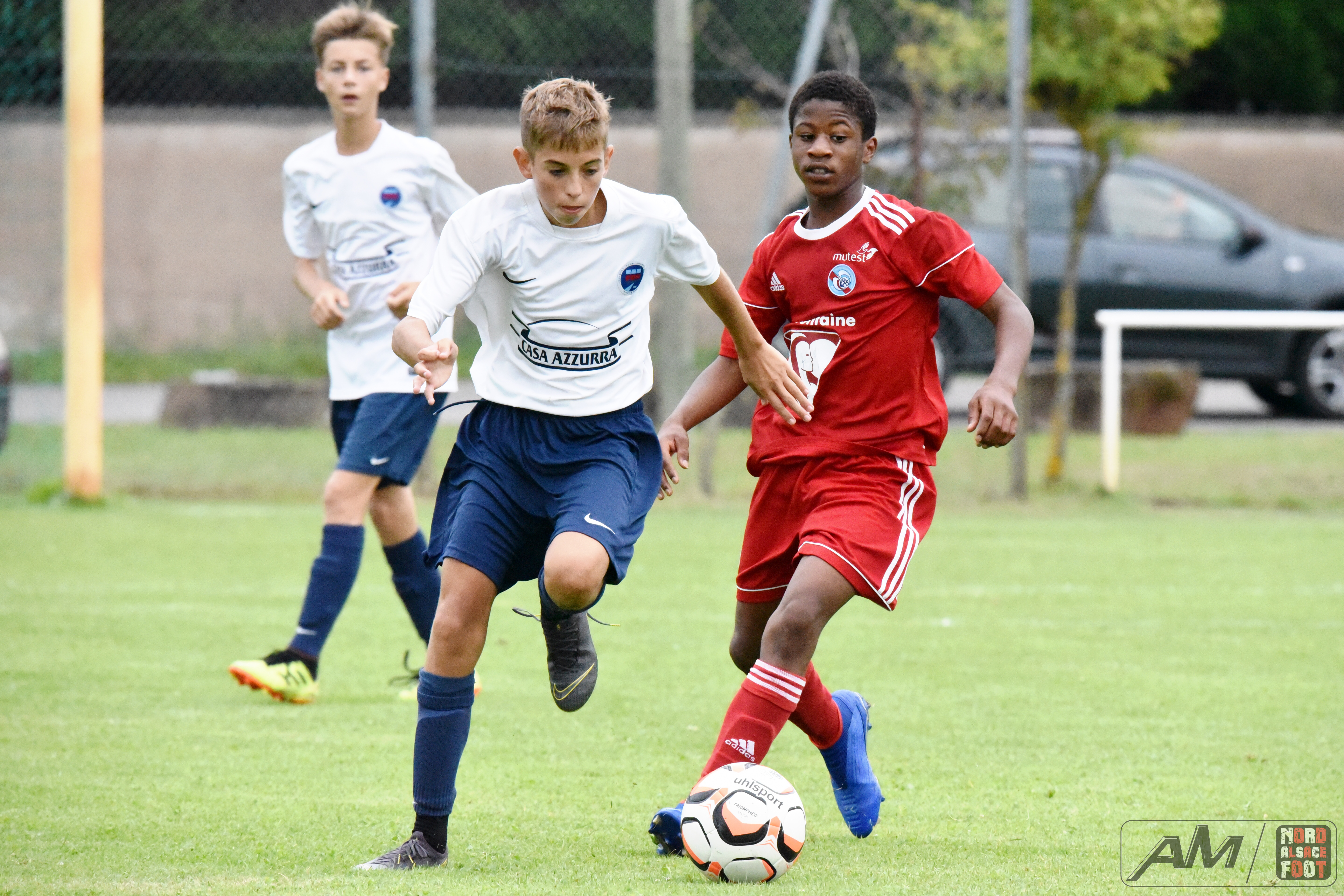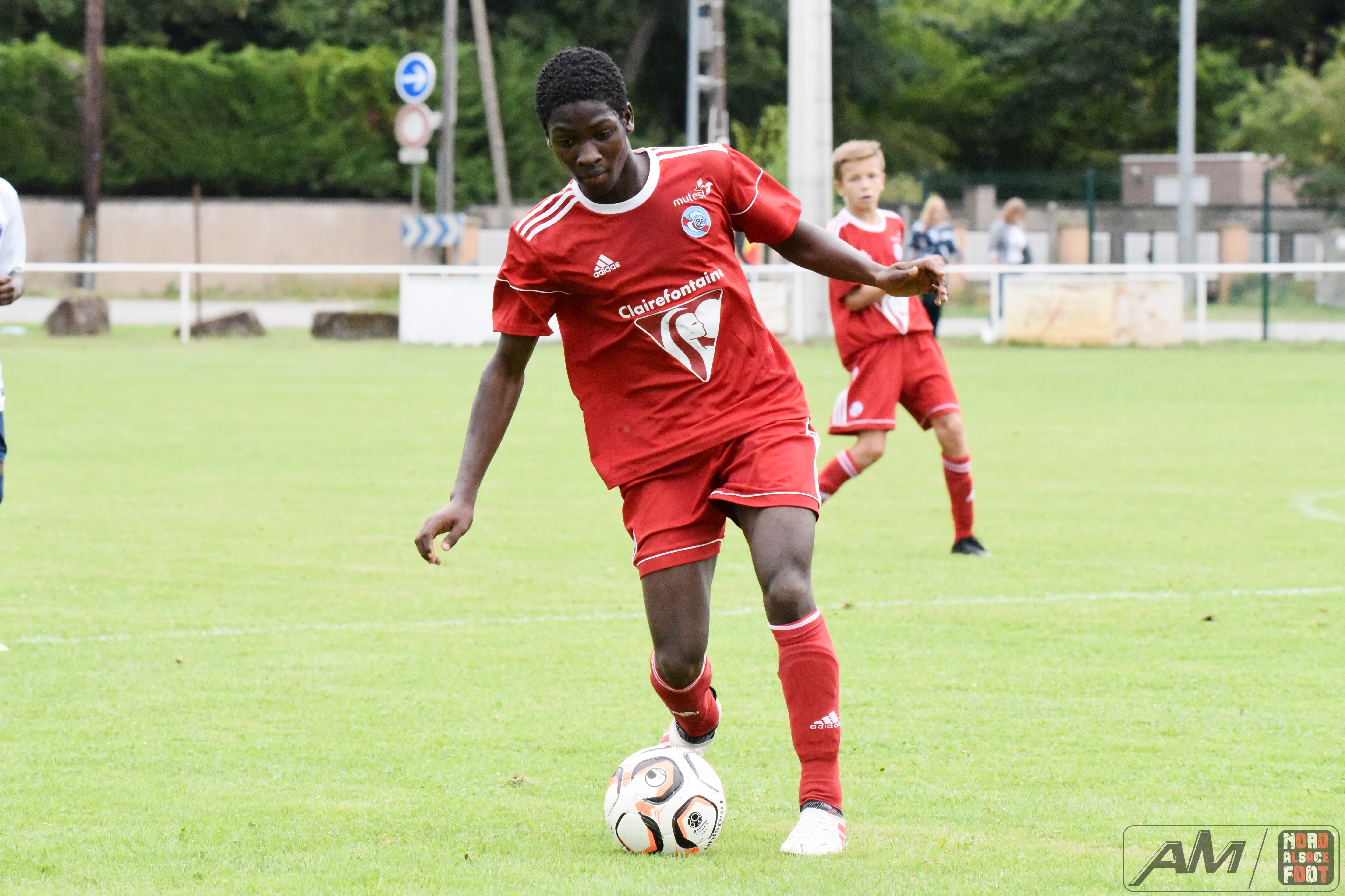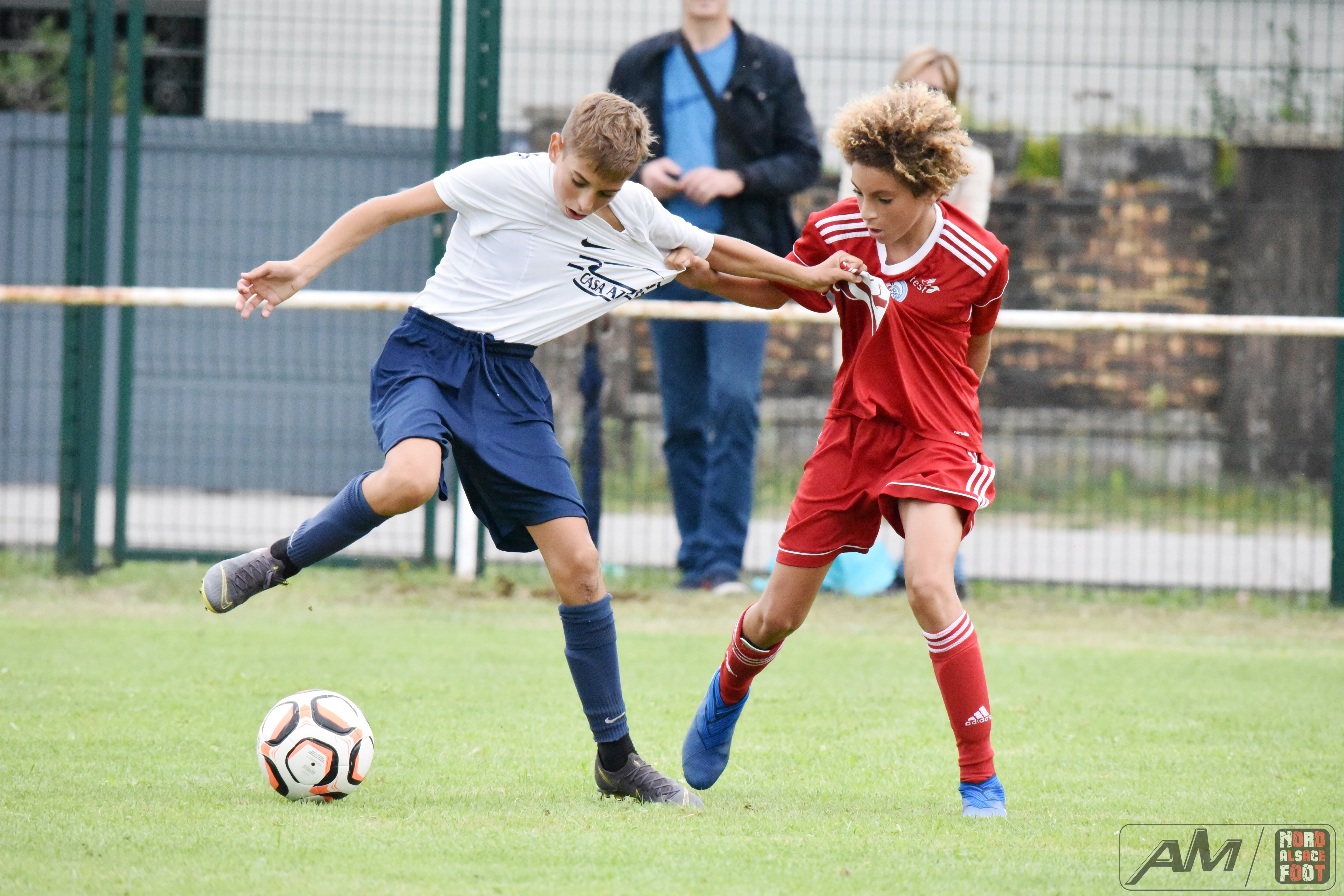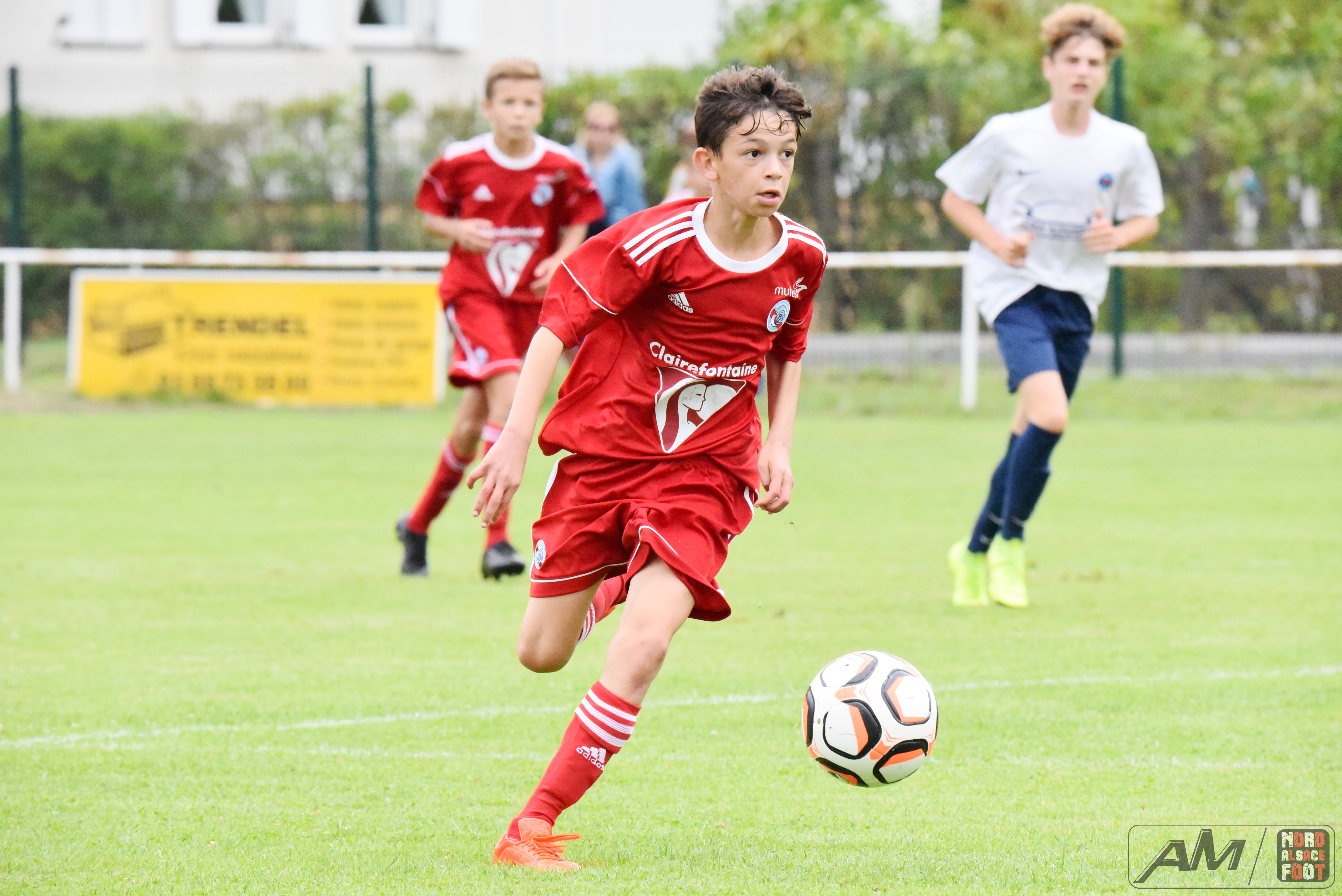 A l’occasion de la première “Journée de Foot” organisée par le Real Schloessel, les U15 du FCSR Haguenau (blancs et bleus) affrontaient ceux du RC Strasbourg Alsace (Rouges) afin de peaufiner les premiers automatismes avant la reprise de la compétition intervenant dans deux semaines. Après une première période se soldant par un net avantage en faveur des Strasbougeois grâce à une réalisation inscrite par Stroh Maxence (4e) suivi d’un doublé de Pelletier Romain (10e et 12e), le tout agrémenté d’un but de Handwerk Mattéo (27e) contre une réduction du score signée Mockers Ludovic (37e) pour les Haguenoviens, les rouges allaient aggraver la marque grâce à un doublé de Handwerk Mattéo (44e) avant que Abakar Youssouf ne lui emboîte le pas à la 50e minute de jeu pour finalement voir Wagner Nathan réduire la marque à la 53e minute de jeu, Maliska Nicolas (60e) et Abakar Youssouf enfonçant ensuite le clou afin de permettre à leur équipe de s’imposer sur ce score sans appel de 8-2! Retrouvez quelques images de cette rencontre et, pour en apprécier le contenu, veuillez cliquer sur l’une d’entre-elle pour afficher le diaporama.