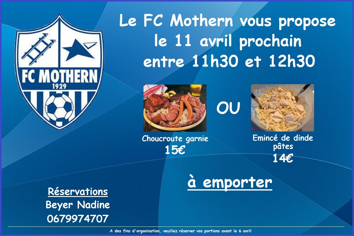 Avec la crise sanitaire du moment privant les amateurs de football de leur sport favori, la solidarité est le maître mot pour sauver ce qui peut l’être et c’est dans cette démarche que le FC Mothern vous propose, le 11 avril prochain entre 11h30 et 12h30, deux menus au choix entre de la choucroute garnie (15€) ou de l’émincé de dinde accompagné de pâtes (14€). La clôture des réservations interviendra le 6 avril prochain. Si vous êtes intéressé(e)s par l’un de ces menus, veuillez vous référer aux coordonnées fournies ci-dessous.