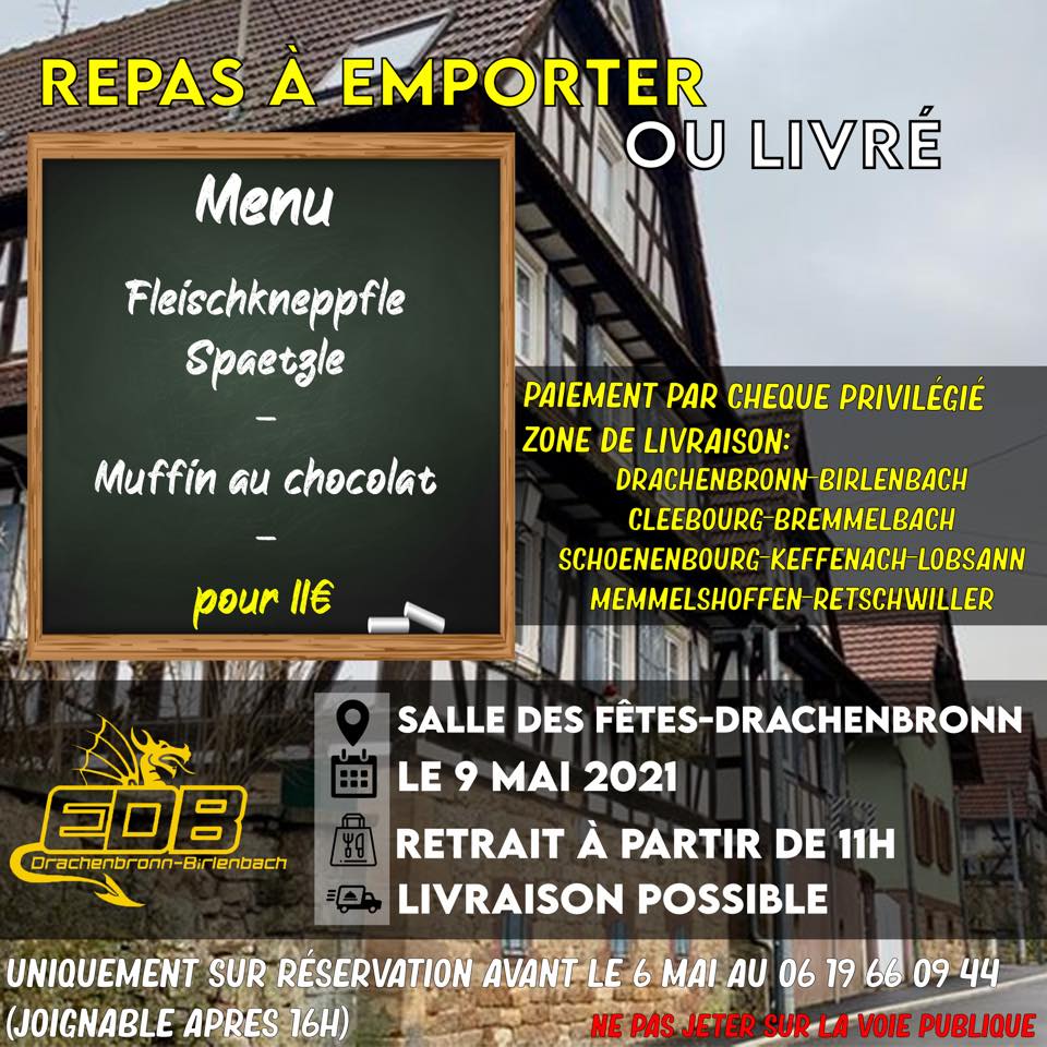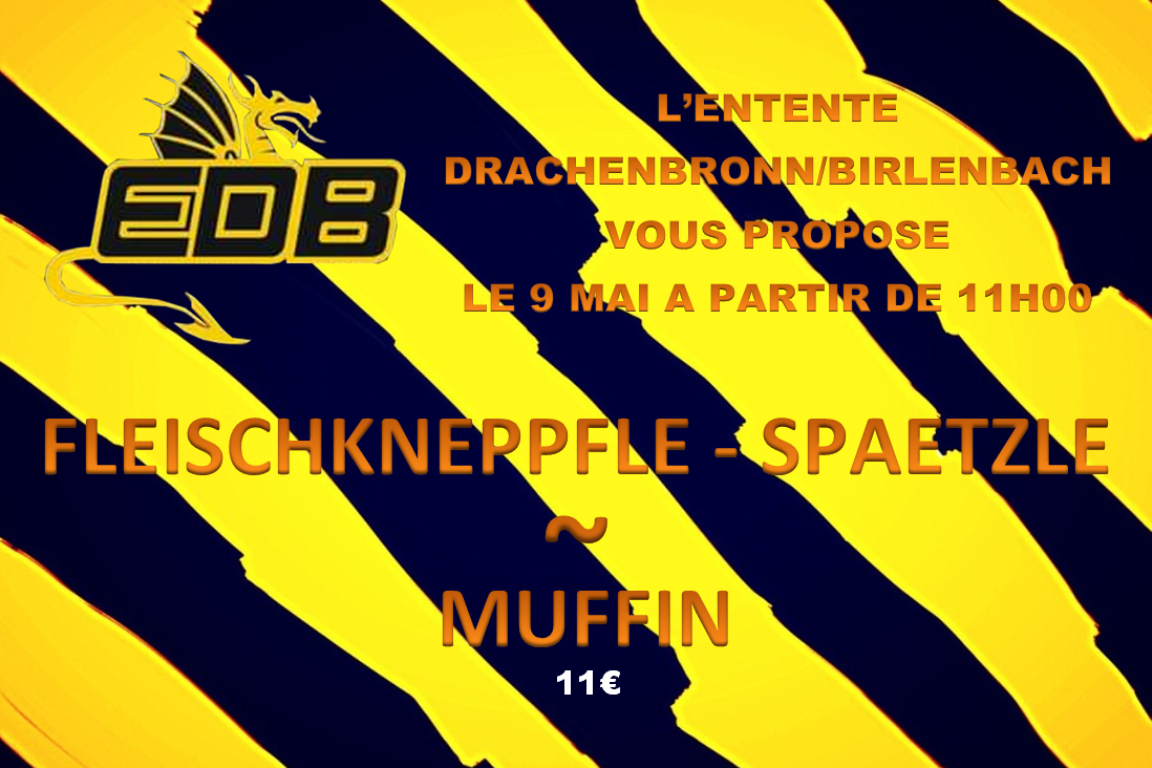 Avec la crise sanitaire du moment privant les amateurs de football de leur sport favori, la solidarité est le maître mot pour sauver ce qui peut l’être et c’est dans cette démarche que l’entente Drachenbronn/Birlenbach vous propose, le 9 mai prochain à partir de 11h00, des Fleischkneppfle accompagnés de spaetzle avec un Muffin en dessert (11€). Si vous êtes intéressé(e)s par ce menu, veuillez vous référer aux coordonnées fournies ci-dessous.