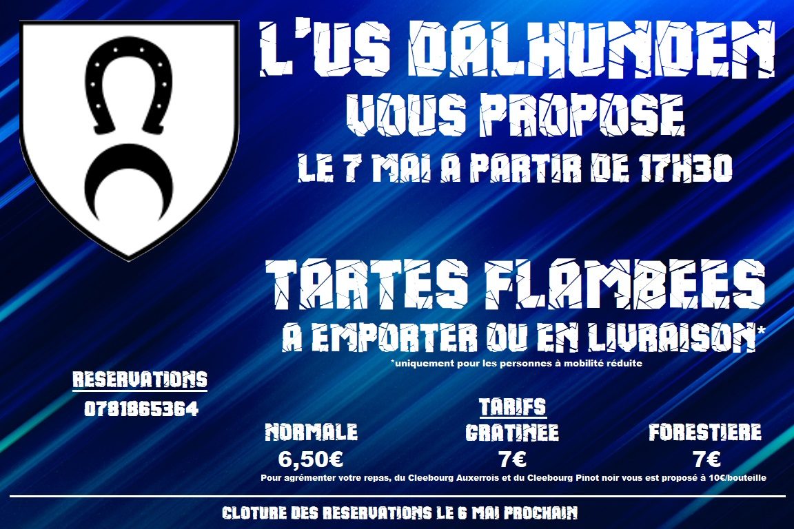 Avec la crise sanitaire du moment privant les amateurs de football de leur sport favori, la solidarité est le maître mot pour sauver ce qui peut l’être et c’est dans cette démarche que l’US Dalhunden vous propose, le 7 mai prochain à partir de 17h30, un “Tarte Flambée Drive” avec la normale à 6,50€, la gratinée à 7€ et la forestière à 7€ (à préciser lors de votre commande). Du Cleebourg Auxerrois ou du Cleebourg Pinot noir vous sont également proposés au tarif de 10€/bouteille. Pour commander, veuillez vous référer aux coordonnées mentionnées ci-dessous.