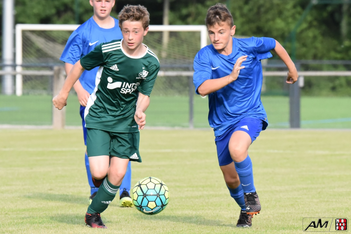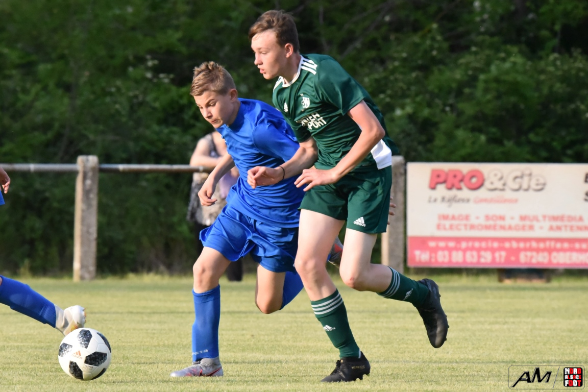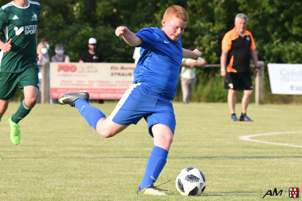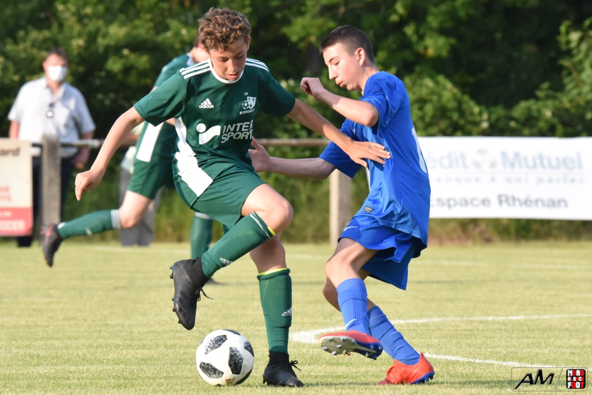 A l’occasion d’une première rencontre amicale post-COVID, les U15 de l’entente Rohrwiller/Drusenheim accueillaient les U15 de l’US Eckwersheim avec la ferme intention de mettre en pratique les enseignements tirés des entraînement au cours des mois précédents. Après un premier quart-temps se soldant par un court avantage en faveur des visiteurs grâce à une réalisation signée Hemmerle Thomas (3e), les ententistes allaient bien entamer le second quart-temps jusqu’à parvenir à égaliser par l’intermédiaire de Mehl Nathan (26e) avant que les verts ne reprennent l’avantage grâce à une réalisation inscrite par Jost Maxime (35e). De retour sur la pelouse pour le troisième quart-temps, les locaux allaient pousser leurs adversaires jusque dans leurs derniers retranchement et, avec le coup de pouce de Leon Daniel (ASW), ils allaient remettre les pendules à l’heure (42e) avant que Hemmerle Thomas ne permette aux visiteurs de reprendre l’avantage à la 48e minute de jeu. Enfin, au cours du dernier quart-temps, la défense locale allait finir par plier, les verts en profitant pour enfiler les buts comme des perles grâce à des réalisations signées Hemmerle Thomas (64e, 70e, 78e), Jost Maxime (73e) et Farria Guerra Mickaël (67e), les bleus s’en remettant à un nouveau CSC adverse inscrit par Rauel Hugo (77e) pour réduire la marque, les deux formations finissant finalement par se quitter sur ce score sans appel de 3-8! Retrouvez, ci-dessous, quelques images de cette rencontre et, pour en apprécier le contenu, veuillez cliquer sur l’une d’entre-elles pour afficher le diaporama.