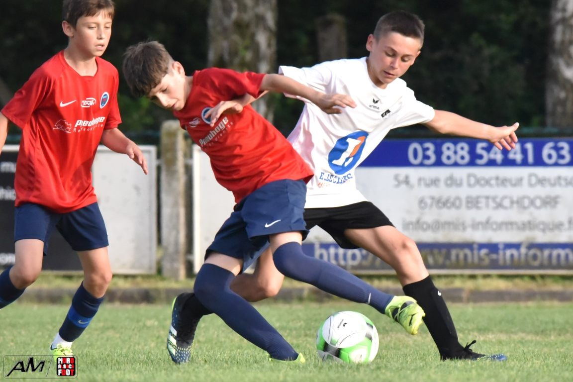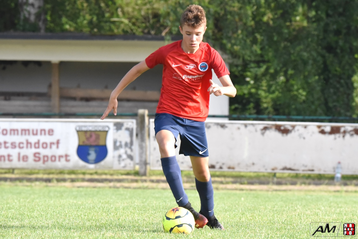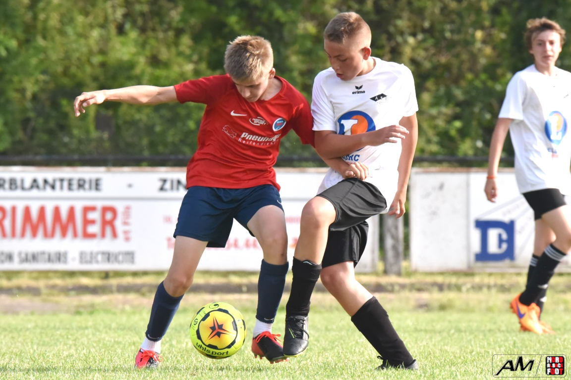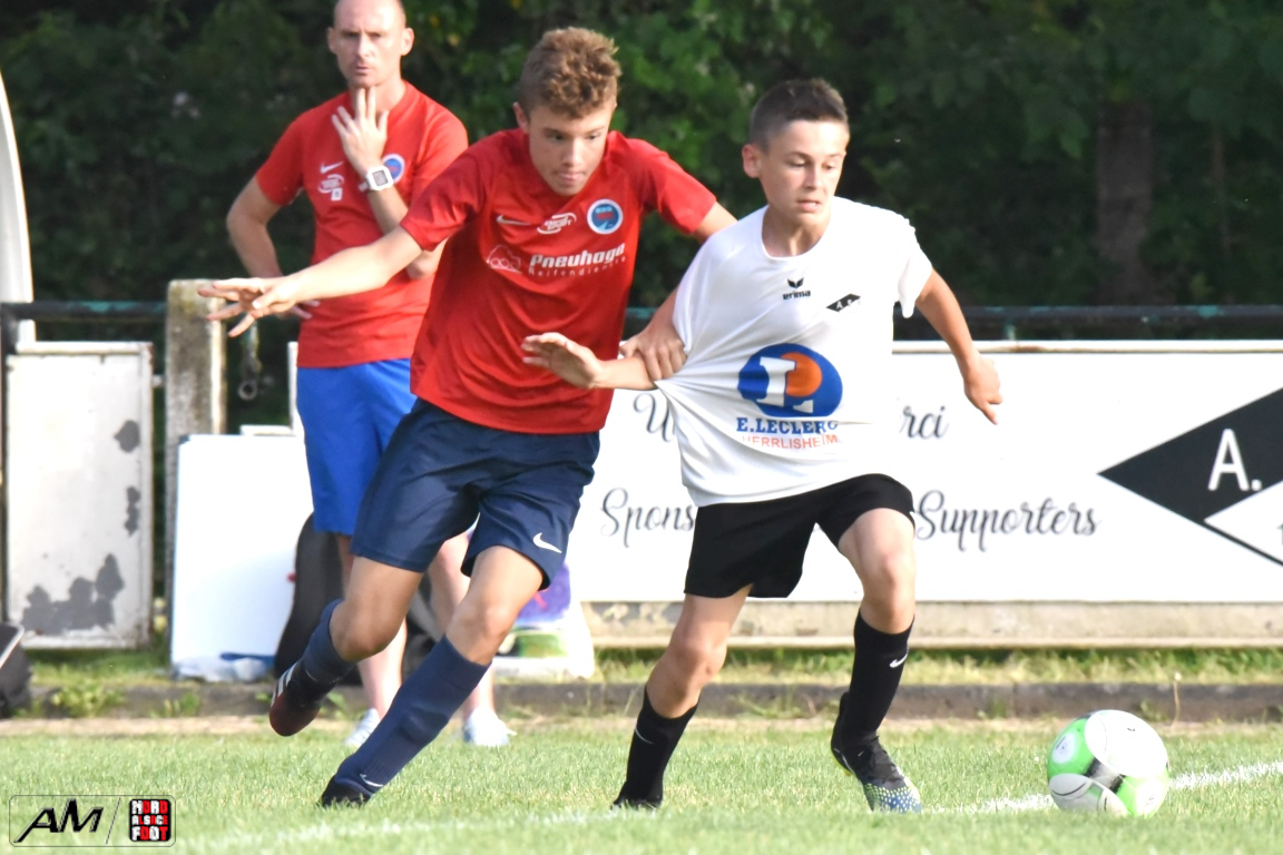 En clôture du Tournoi Gerard Zillox organisé par l’AS Betschdorf, les U15 du club offraient l’hospitalité aux U14 du FCSR Haguenau avec la ferme intention d’offrir une belle parenthèse au public resté en nombre pour assister à la rencontre. Après une première période se soldant par un large avantage en faveur des Haguenoviens grâce à des réalisations signées Ladoire Botelho Eliot (19e), Fornecker Tom (22e), Schmitzer Lucas (33e et 35e) et Tillmann Victor (39e), les blancs et noirs allaient nous proposer du mieux en seconde période mais, malgré toutes les forces jetées dans la bataille, les rouges et bleus allaient corser l’addition à trois reprises grâce à une réalisation signée Ferbach Mathis (47e) et grâce à un doublé signé Condemi Giani (56e et 90e), cette avalanche de buts permettant finalement au U14 du FCSR Haguenau de s’imposer sur ce score sans appel de 0-8! Retrouvez, ci-dessous, quelques images de cette rencontre et, pour en apprécier le contenu, veuillez cliquer sur l’une d’entre-elles pour afficher le diaporama.