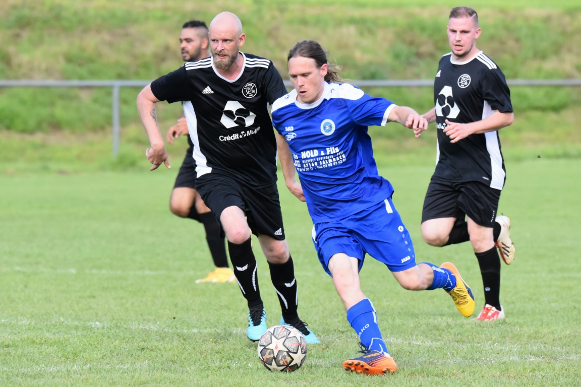 L'ASSE Salmbach de Christmann Olivier (en bleu) obtient le dernier ticket pour les demi-finales du Challenge Nord Alsace Foot - Photo NAF