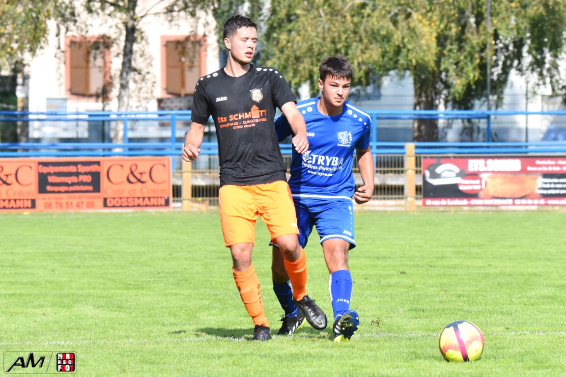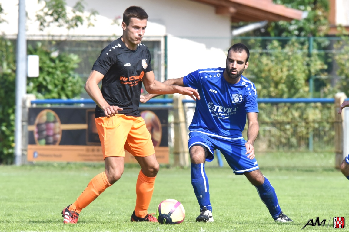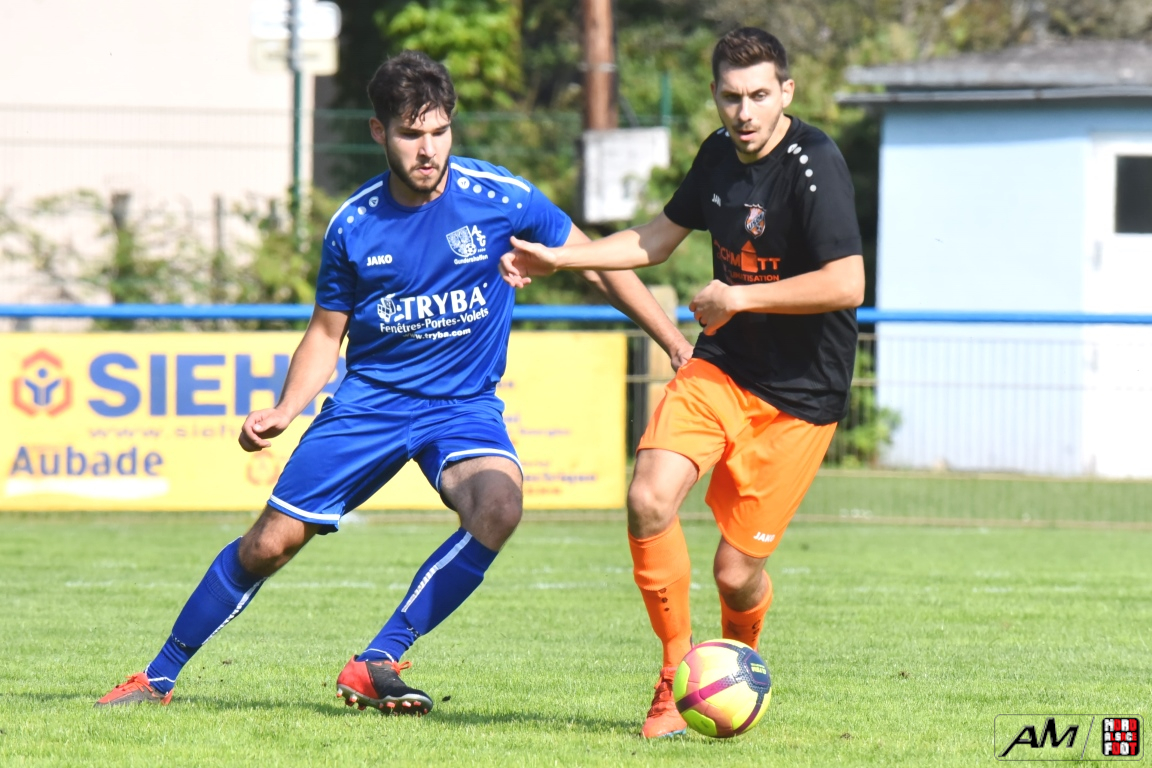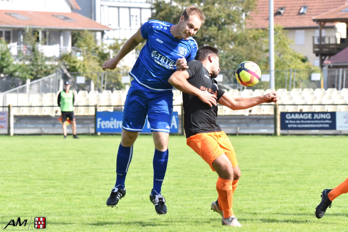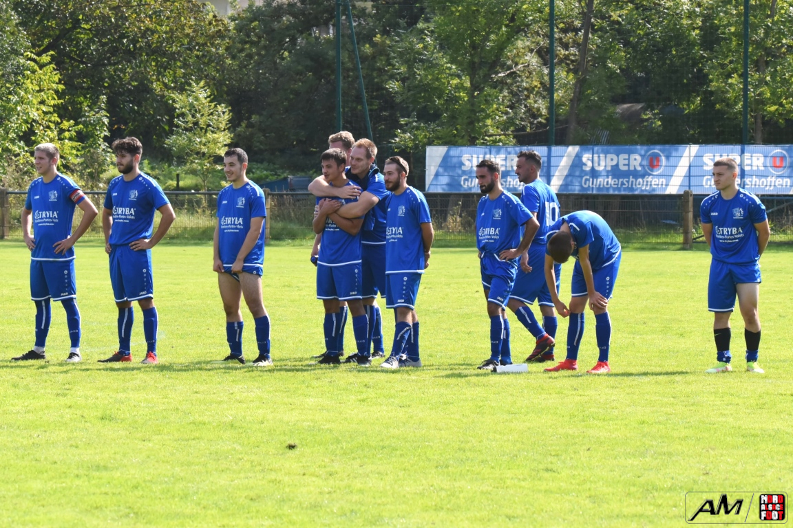 A l’occasion du premier tour de la Coupe des équipes secondes, l’AS Gundershoffen 2 (District 3) accueillait l’US Oberlauterbach 2 (District 1) afin de tenter d’effacer les deux division d’écart, notamment dans leur antre et devant un public ne s’étant pas déplacé en grand nombre pour cette affiche. Après une première période se soldant par un un score de parité grâce à l’ouverture du score des visiteurs signée Joerger Cédric (31e) contre une égalisation locale signée Eksin Sinan (40e), les bleus allaient prendre l’avantage à la 67e minute de jeu grâce à but inscrit par Michalczyk Hervé avant que les doublures oberlauterbachoises ne parviennent à égaliser à la 78e minute de jeu grâce à l’opportunisme de Reichert Julien, les deux équipes finissant par disputer la qualification lors de la séance de tirs-au-but, cette dernière finissant par tourner à l’avantage de l’AS Gundershoffen 2, les bleus s’imposant finalement sur ce score de 2-2 (3-2 tab). Retrouvez, ci-dessous, quelques images de cette rencontre et, pour en apprécier le contenu, veuillez cliquer sur l’une d’entre-elles pour afficher le diaporama.
