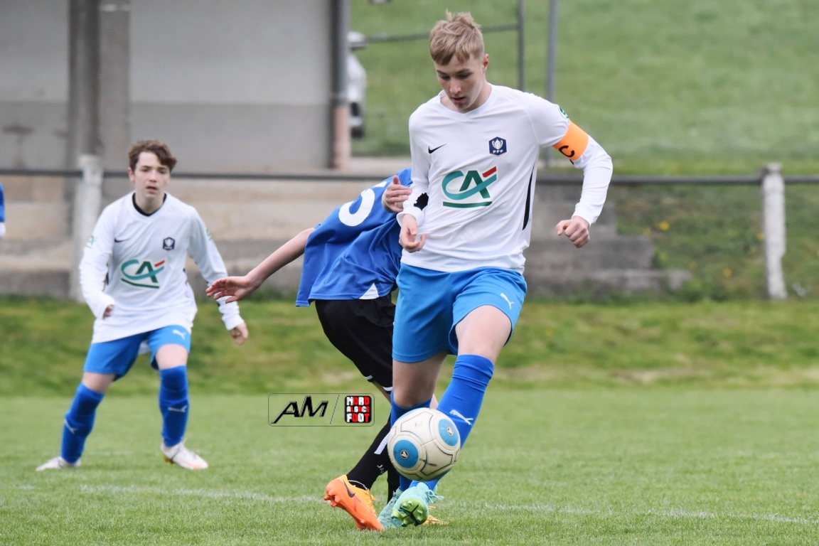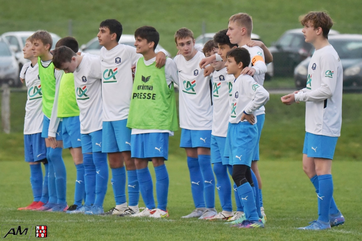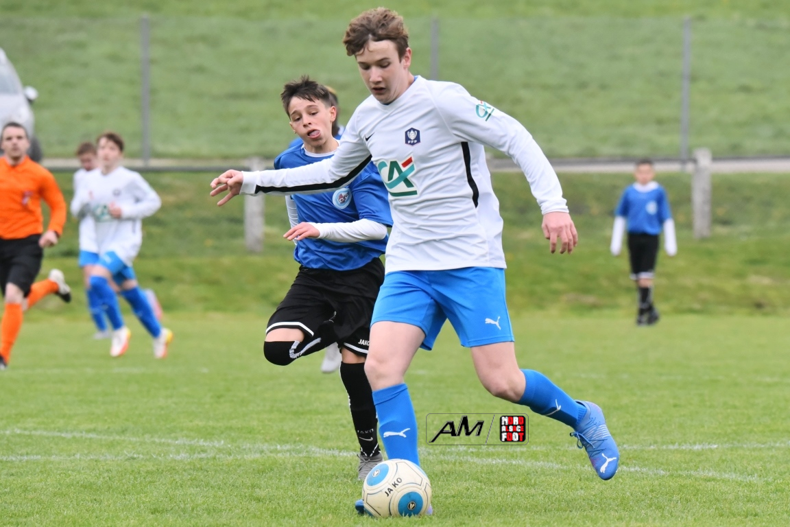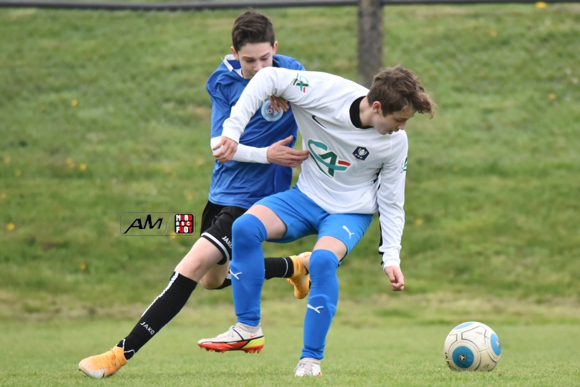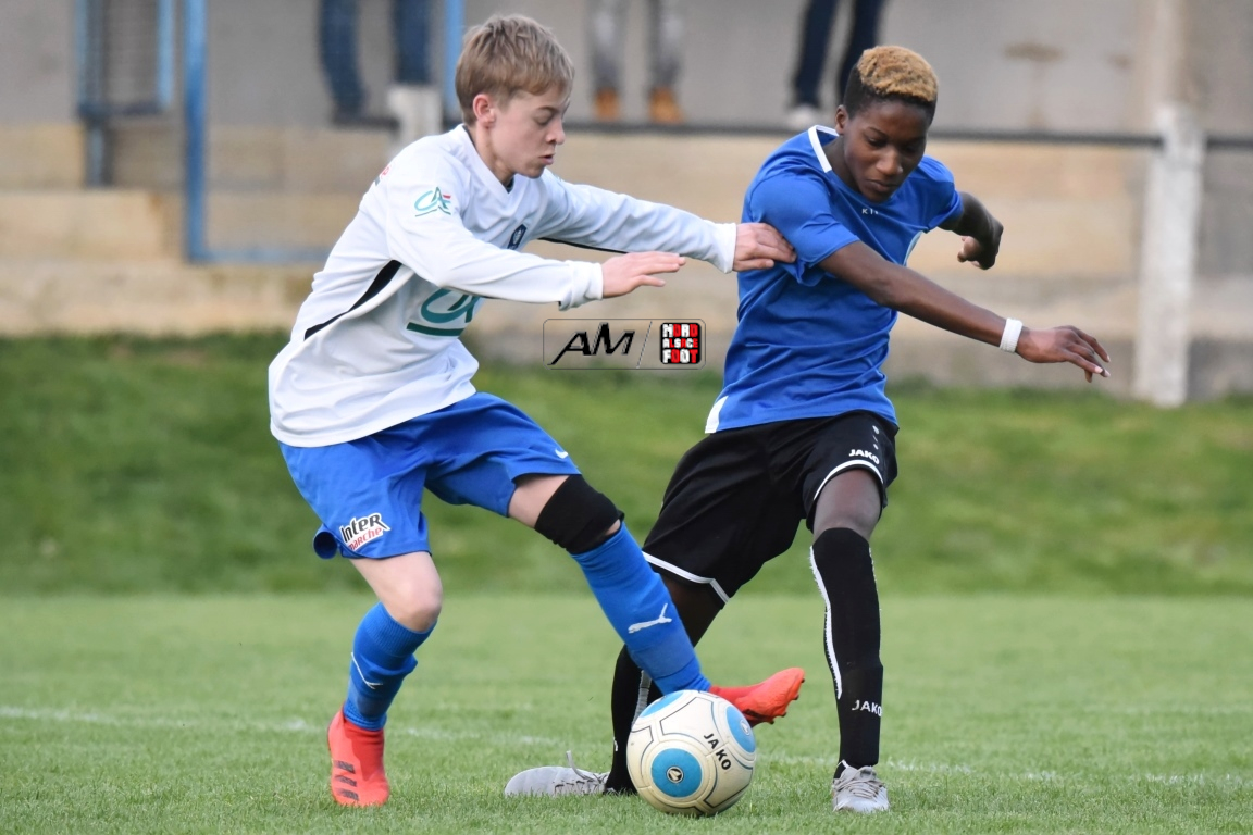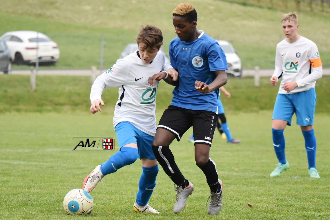 A l’occasion des quarts de finale de la Coupe d’Encouragement – Crédit Mutuel de la catégorie U15, le Groupement Jeunes d’Alsace du Nord (District 1) accueillait l’US Sarre-Union (District 3) afin de tenter de s’adjuger l’un des quatre ticket pour le dernier carré de cette compétition. Après une première période se soldant par un score de parité grâce à l’ouverture du score des locaux signée Schucke Pierre (25e) contre une égalisation des visiteurs signée Mahraoui Naël (30e), les protégés de Treger Yannick allaient reprendre l’avantage à la 45e minute de jeu par l’intermédiaire de Lusumbu Luvumbu Donald avant que les visiteurs ne parviennent à égaliser à la 65e minute de jeu par l’intermédiaire de Emanuele David, les deux formations se neutralisant ensuite jusqu’au coup de sifflet final les envoyant tout droit à la séance de tirs-au-but. Lors du premier tir, Schucke Quentin (GJAN) répondit à Rostoucher Luc. Lors du second tir, Boheim Mathieu (GJAN) répondit à Mahraoui Naël. Lors du troisième tir, Schorn Noah (GJAN) répondit à Leyser Simon. Lors du quatrième tir, Schucke Pierre (GJAN) loupa son face-à-face et Emanuele David transforma parfaitement son penalty. Lors du cinquième tir, Jautzy Maxime (GJAN) convertit son penalty tandis que Schneider Nicolas loupa son face-à-face avec Hoffschier Baptiste. Lors du sixième tir, Lusumbu Luvumbu Donald (GJAN) répondit à Bleichner Noah. Lors du septième tir, Laffitte Leopoldes Kylian (USSU) loupa son face-à-face avant que Khalaf Omar n’offre la qualification au GJAN après avoir pris Bleichner Noah à contre-pied. Retrouvez, ci-dessous, quelques images de cette rencontre et, pour en apprécier le contenu, veuillez cliquer sur l’une d’entre-elles pour afficher le diaporama.