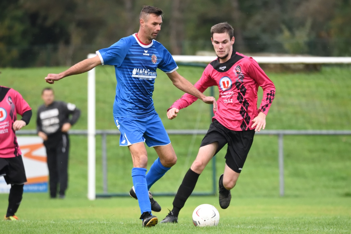 | 52′ | Suite à une action ayant été rondement menée par les visiteurs, ces derniers finirent par obtenir une touche à dix mètres du poteau de corner droit et c’est Dorsch Lionel qui se chargea de l’exécuter en retrait en faveur de Haar Sébastien, de dernier ne se faisant pas prier pour prendre sa chance d’une frappe des 20m passant à gauche du but gardé par Kempf Régis. | |
