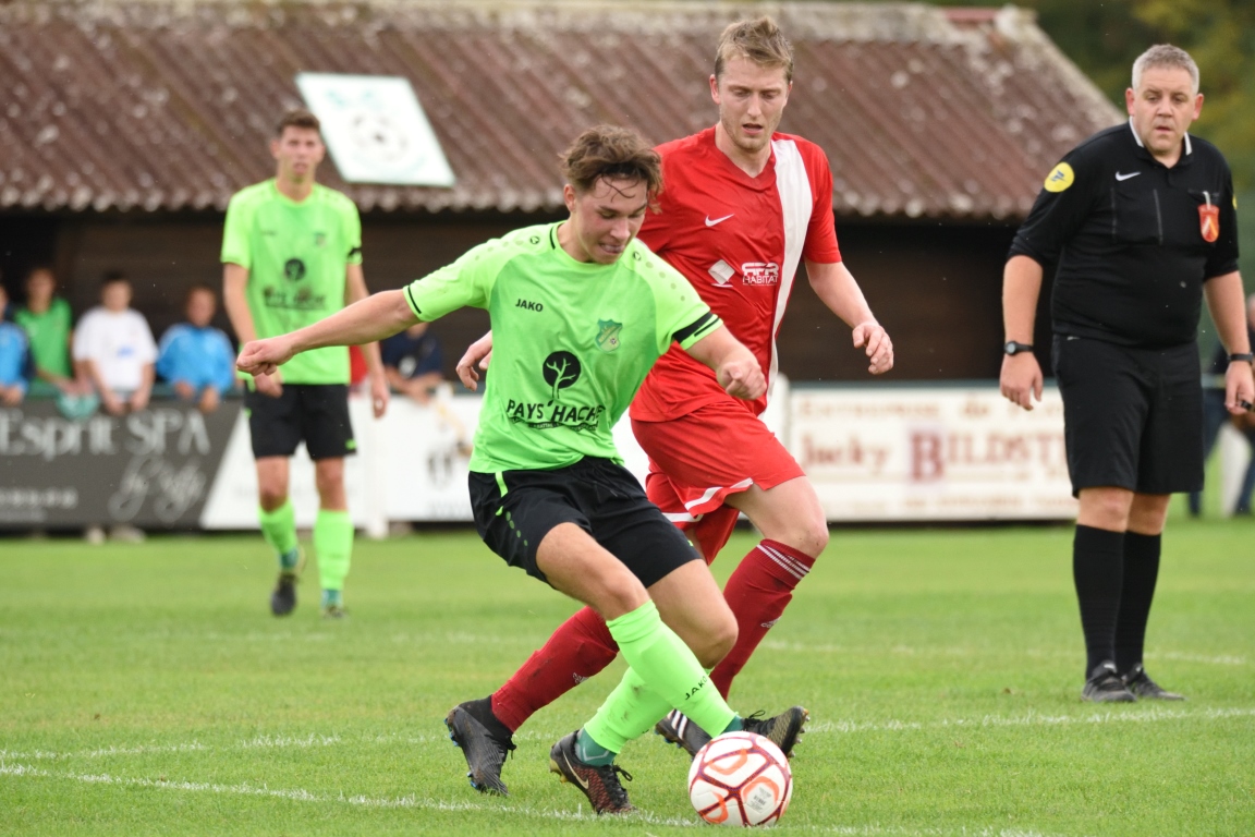 | 11′ | Alors que les défenseurs Hinterfeldois était sous pression dans leurs derniers retranchements, Dalcy Joël décida de remiser le ballon en retrait vers son gardien mais celui-ci se saisit du cuir de la main, cette erreur d’appréciation laissant place à un coup-franc indirect que Jehlen Paul se chargea de décaler pour Schmitt Jordan, ce dernier ne se faisant pas prier pour armer une frappe étant contrée par le mur, le ballon revenant ensuite dans l’axe et directement dans les pieds de Jehlen Paul, le milieu défensif local armant finalement une frappe des 25m passant au-dessus du but gardé par Kelhetter Quentin. | |