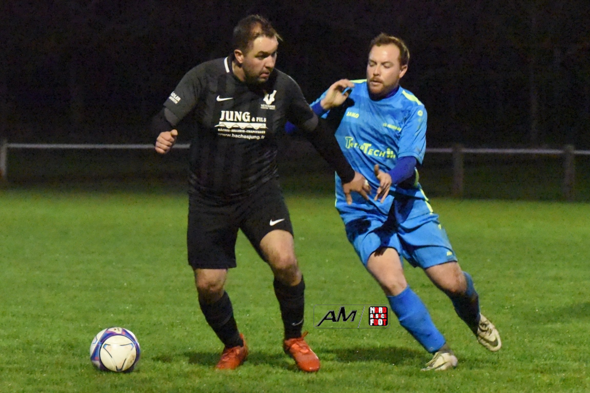 A l’occasion de la sixième journée de championnat chez les Vétérans (Groupe D), l’entente Schleithal/E2SO 51 accueillait l’entente Preuschdorf/EPDH 51 afin de tenter de s’imposer face à des adversaires n’ayant pas perdu le moindre match et étant au coude à coude avec le FCE Schirrhein pour s’emparer du titre honorifique de Champion d’Automne dans cette poule. Après une première période se soldant par un court avantage en faveur des visiteurs grâce à un but inscrit par Cvetek Tonny (10e), les deux équipes allaient se neutraliser jusqu’aux confins des arrêts de jeu de cette seconde période avant que l’incontournable Haffner Steeve ne fasse définitivement le break (75e). Retrouvez, ci-dessous, quelques images de cette rencontre et, pour en apprécier le contenu, veuillez cliquer sur l’une d’entre-elles pour afficher le diaporama.