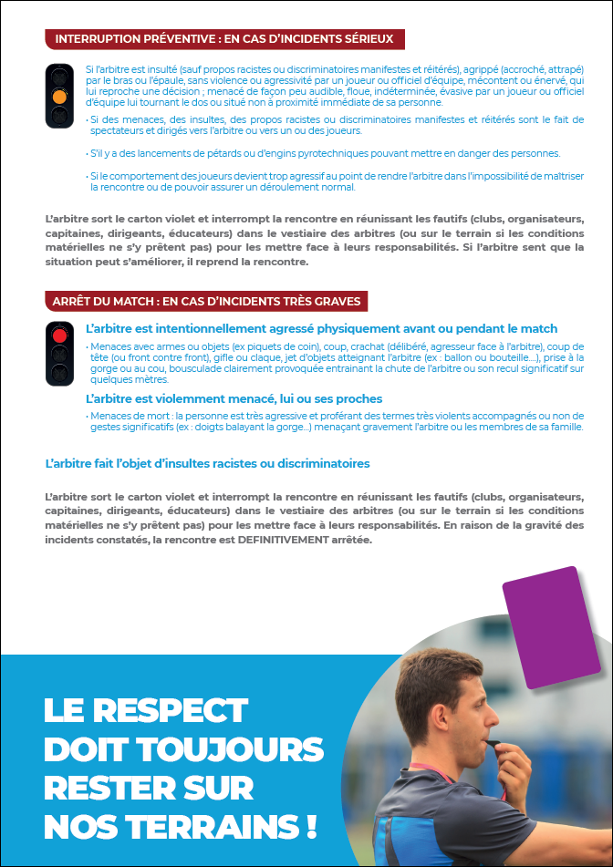 Réaction de l’arbitre: L’arbitre sort le carton violet et interrompt la rencontre en réunissant les fautifs (clubs, organisateurs, capitaines, dirigeants, éducateurs) dans le vestiaire des arbitres (ou sur le terrain si les conditions matérielles ne s’y prêtent pas) pour les mettre face à leurs responsabilités. Si l’arbitre sent que la situation peut s’améliorer, il reprend la rencontre.