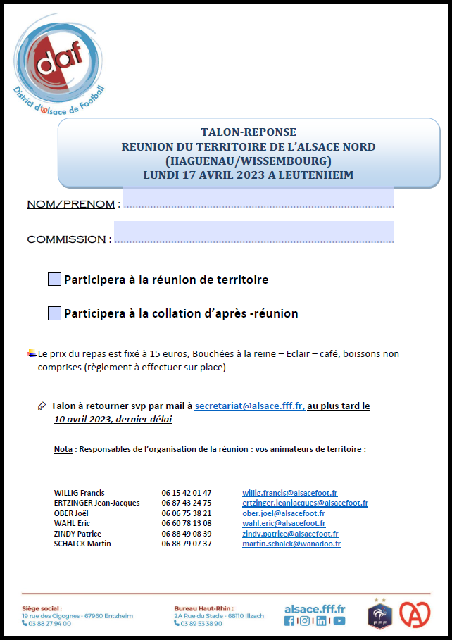 A l’occasion d’une nouvelle Réunion de Territoire pour le secteur Alsace Nord (Wissembourg/Haguenau), le District d’Alsace de Football convie les présidents de clubs à participer à cette dernière qui aura lieu le 17 avril prochain à partir de 19h00 à la salle des fêtes de Leutenheim. Au menu de cette réunion, les thèmes concernant la discipline/incivilités, l’arbitrage et la structuration des territoires après le thème “Retour au foot” évoqué lors de la précédente réunion de Weitbruch. Des représentants du Racing Club de Strasbourg seront présents pour présenter le projet “Un seul football”. A la suite de cette réunion, une collation sera servie par les membres de l’ASB Leutenheim au prix de 15€ (bouchées à la reine, éclair, café). Tous les clubs de ce secteur ont été avisés de cette réunion par un e-mail envoyé par le secrétariat du District d’Alsace.