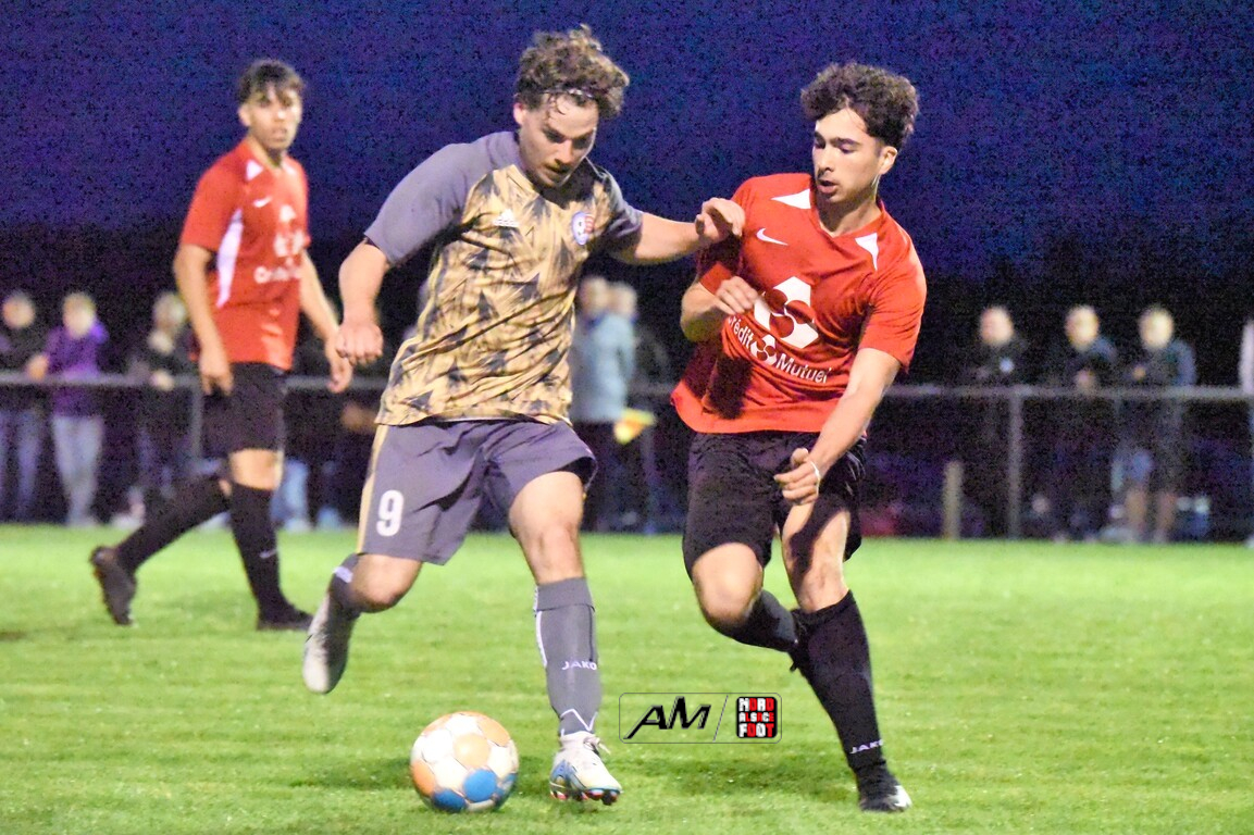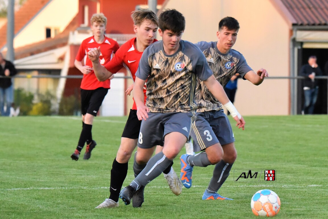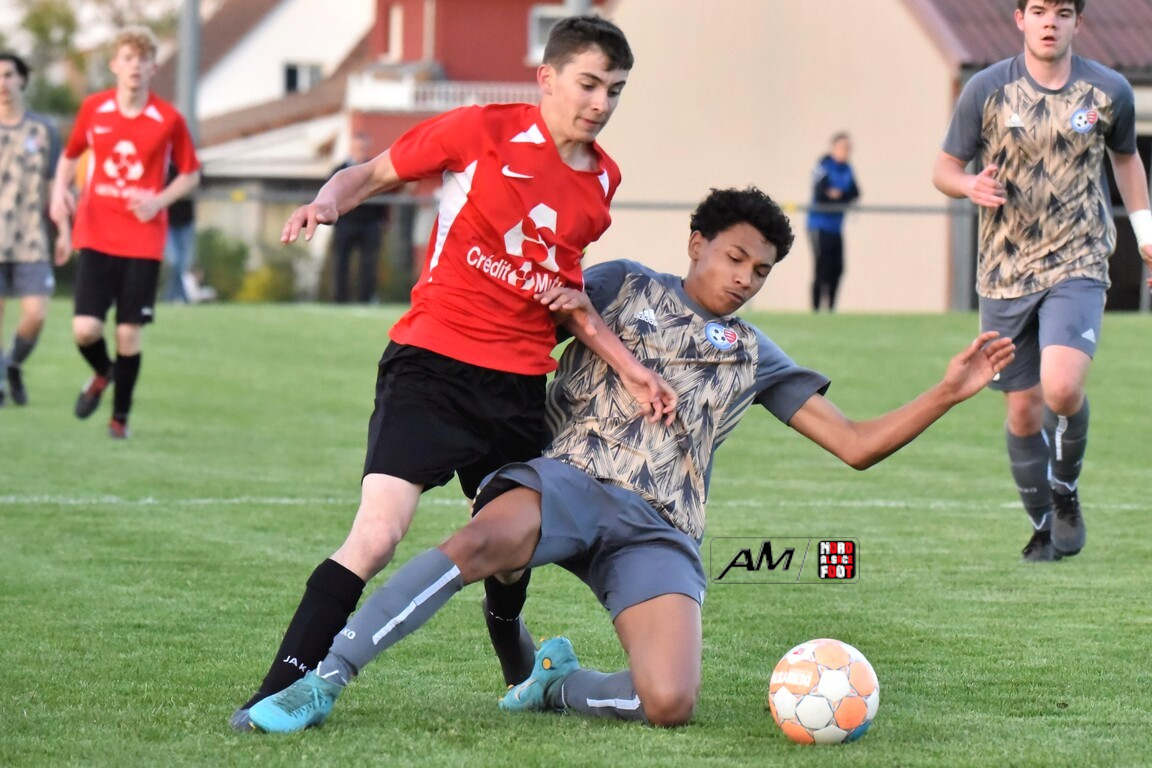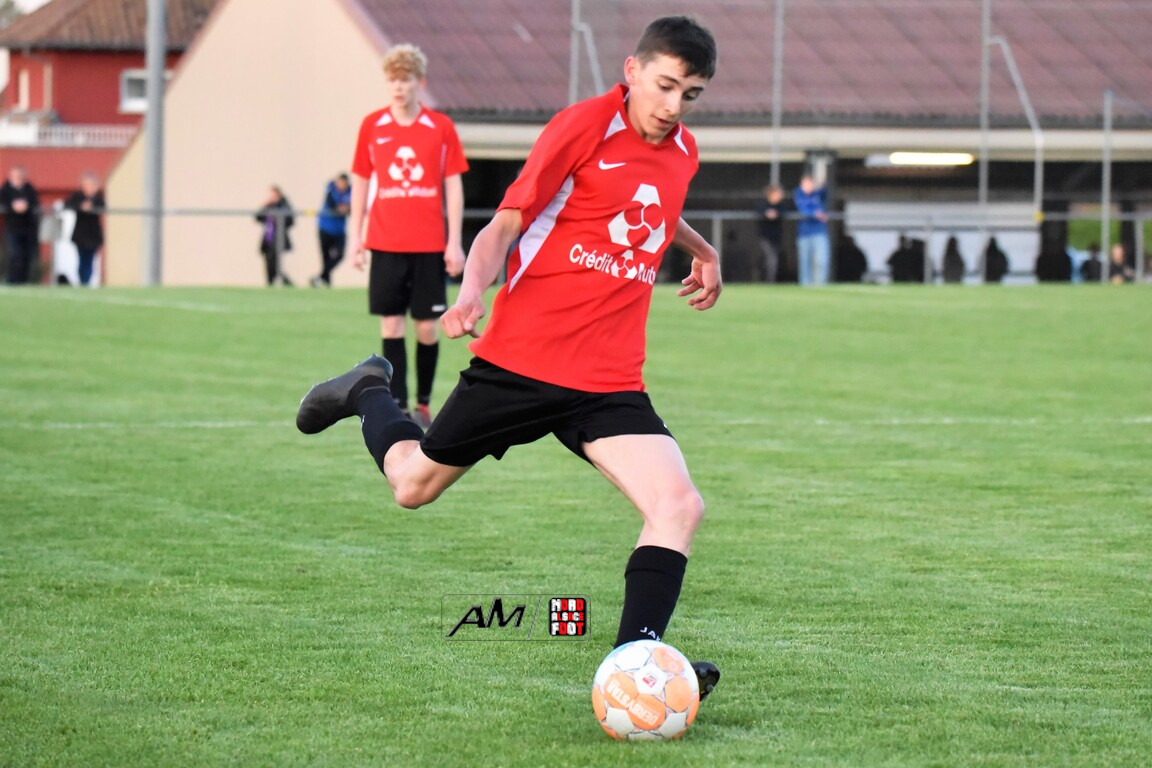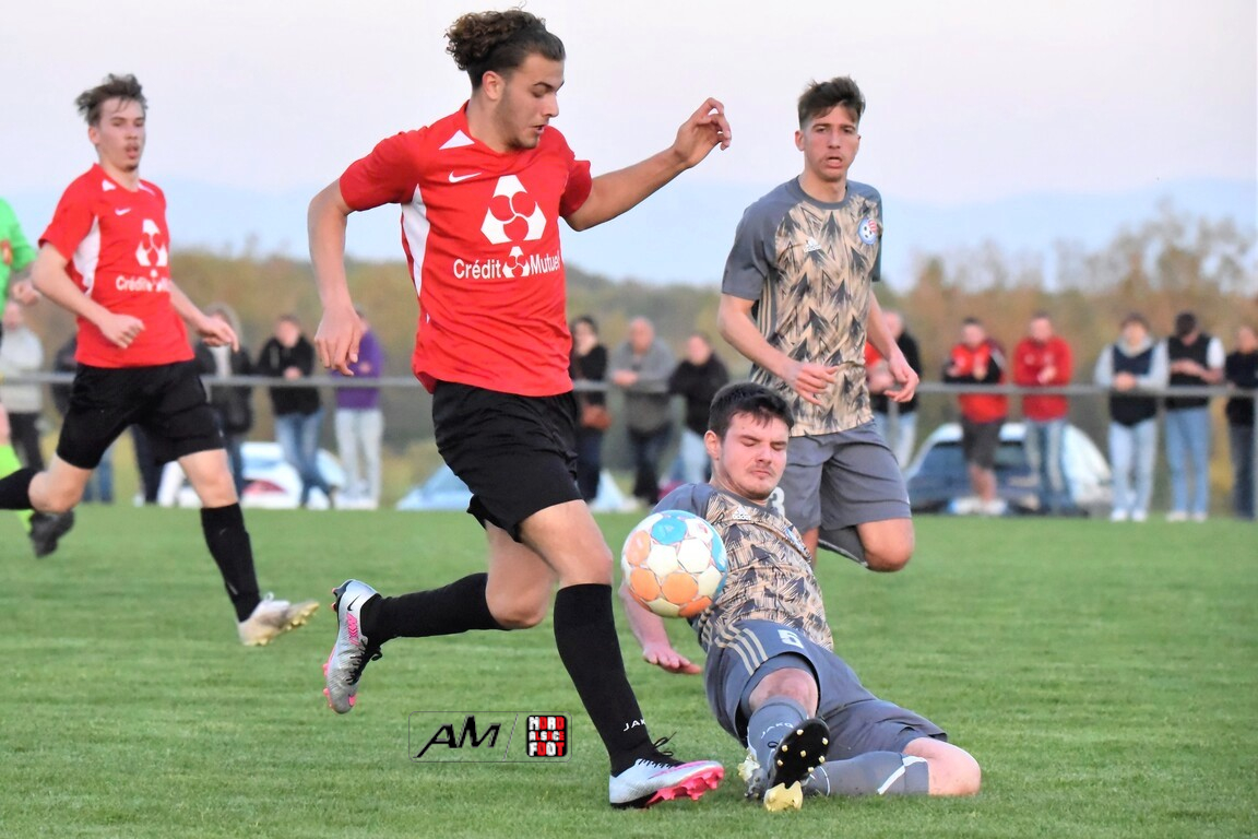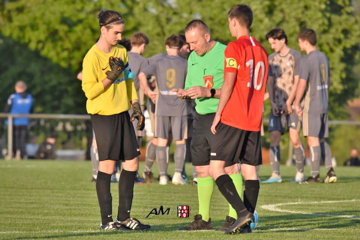 A l’occasion des demi-finales de la Coupe d’Encouragement – Crédit Mutuel dans la catégorie U18, l’entente Sauer/Pechelbronn (District 1) accueillait le CS Fegersheim (District 1) avec la ferme intention d’obtenir un ticket pour une deuxième finale consécutive. Après une première période se soldant par un court avantage en faveur des visiteurs grâce à une réalisation signée Balmer Tom (20e), ces derniers allaient faire le break à la 63e minute de jeu grâce à un doublé de Balmer Tom, les deux formations se neutralisant ensuite jusqu’à la 98e minute de jeu, moment choisi par les locaux pour réduire la marque sur un penalty transformé par Devanlay Thibaut et, dans les ultimes secondes du temps additionnel les locaux eurent une ultime occasion d’égaliser mais le gardien capta le ballon entre ses jambes alors qu’il était au sol. Les ententistes sortent de la compétition la tête haute et on ne peut que les féliciter pour leur parcours. Retrouvez, ci-dessous, quelques images de cette rencontre et, pour en apprécier le contenu, veuillez cliquer sur l’une d’entre-elles pour afficher le diaporama.