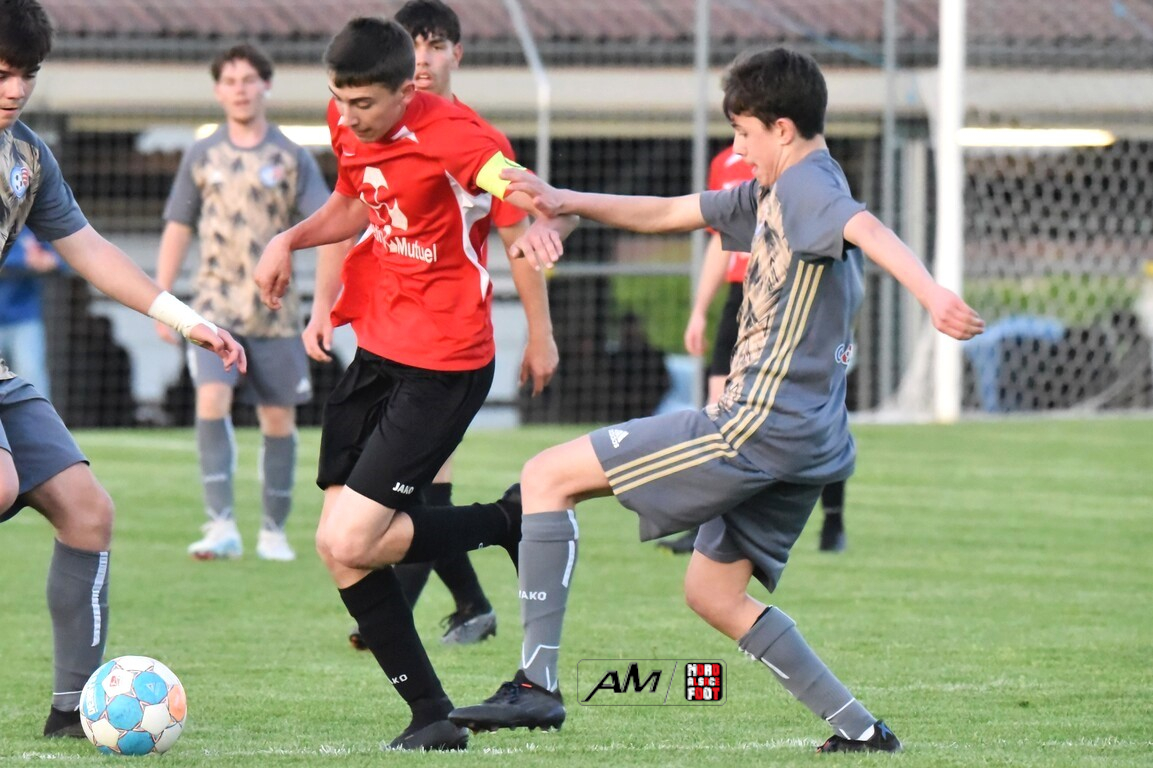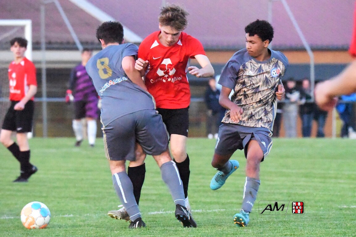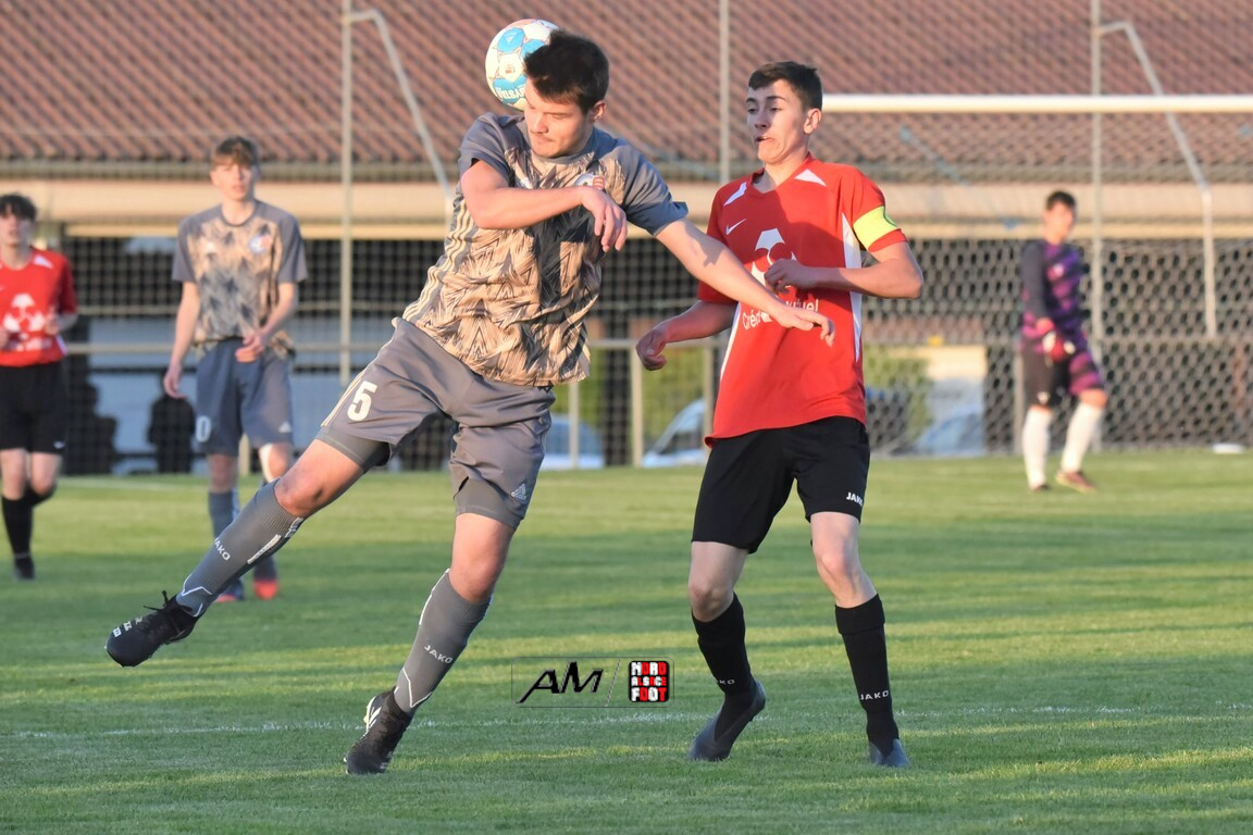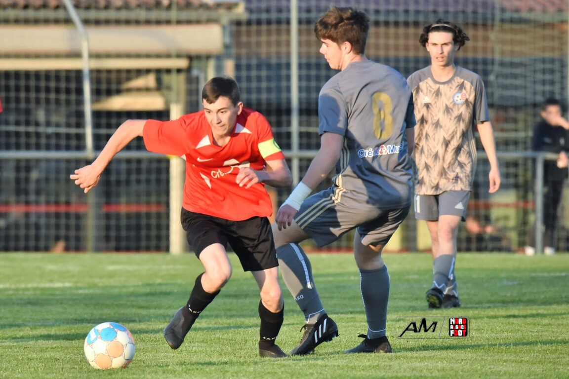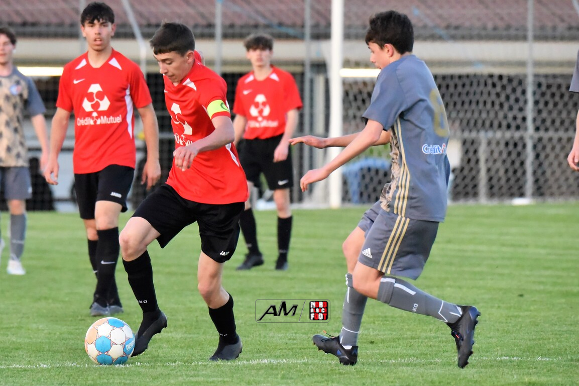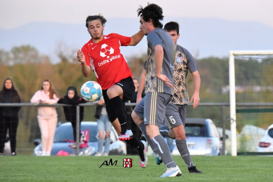 A l’occasion des demi-finales de la Coupe d’Encouragement – Crédit Mutuel dans la catégorie U18, l’entente Sauer/Pechelbronn (District 1) accueillait le CS Fegersheim (District 1) avec la ferme intention d’obtenir un ticket pour une deuxième finale consécutive. Après une première période se soldant par un court avantage en faveur des visiteurs grâce à une réalisation signée Balmer Tom (20e), ces derniers allaient faire le break à la 63e minute de jeu grâce à un doublé de Balmer Tom, les deux formations se neutralisant ensuite jusqu’à la 98e minute de jeu, moment choisi par les locaux pour réduire la marque sur un penalty transformé par Devanlay Thibaut et, dans les ultimes secondes du temps additionnel les locaux eurent une ultime occasion d’égaliser mais le gardien capta le ballon entre ses jambes alors qu’il était au sol. Les ententistes sortent de la compétition la tête haute et on ne peut que les féliciter pour leur parcours. Retrouvez, ci-dessous, quelques images de cette rencontre et, pour en apprécier le contenu, veuillez cliquer sur l’une d’entre-elles pour afficher le diaporama.