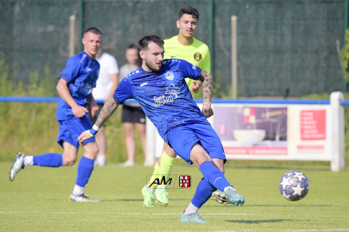 A l’occasion de l’avant-dernière journée de championnat en District 1 (Groupe B), l’entente Mothern/Munchhausen (2e) accueillait l’AS Cité de l’Ill (4e) pour un match au sommet pouvant redistribuer les cartes en tête de cette poule si les Strasbourgeois étaient amenés à s’imposer à la Neuwies. Après une première période se soldant par un large avantage en faveur des locaux grâce à des réalisations signées Wahl Florian (1ère), Bender Philippe (24e) et Kraemer Loïc (28e), la rencontre fut définitivement arrêtée à la 48e minute de jeu après que l’arbitre central ait dégainé le carton violet en fin de première période à des décisions arbitrales plus ou moins contestées avec véhémence et qu’un tacle mal maîtrisé de Aamara Mustapha sur Kraemer Loïc ne valut un carton rouge (jaune/jaune), suite auquel un autre joueur strasbourgeois faillit en venir aux mains avec un membre du public, ce qui légitima cet arrêt de rencontre. Retrouvez, ci-dessous, quelques images de cette rencontre et, pour en apprécier le contenu, veuillez cliquer sur l’une d’entre-elles pour afficher le diaporama.