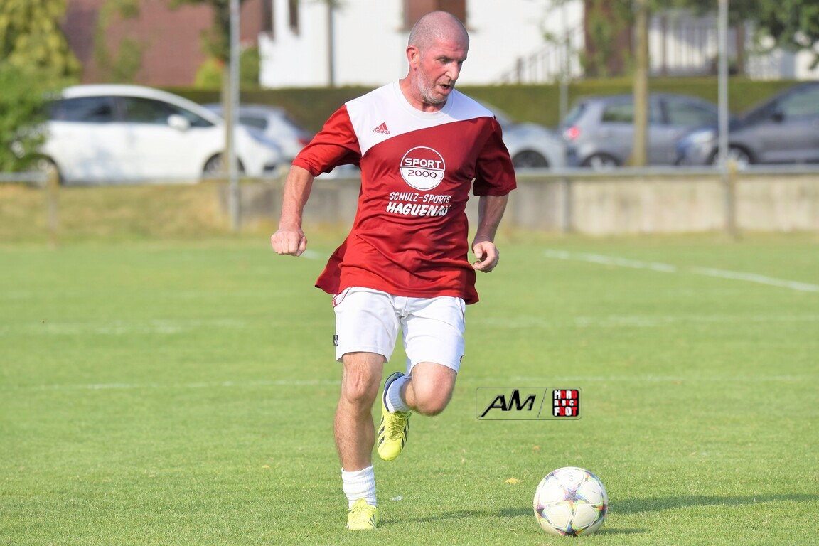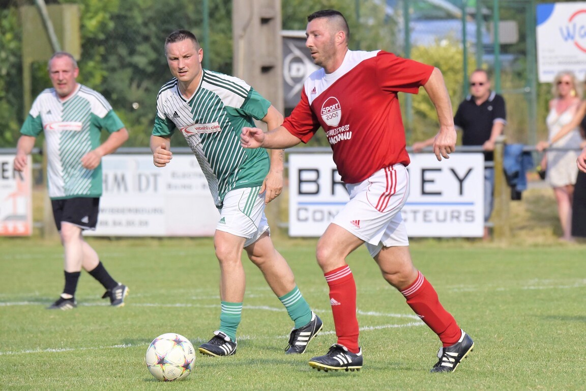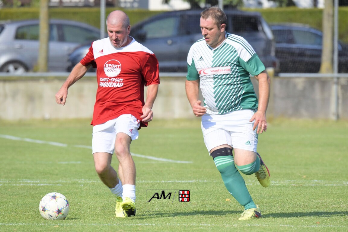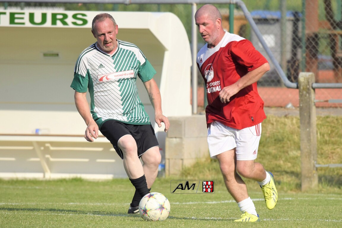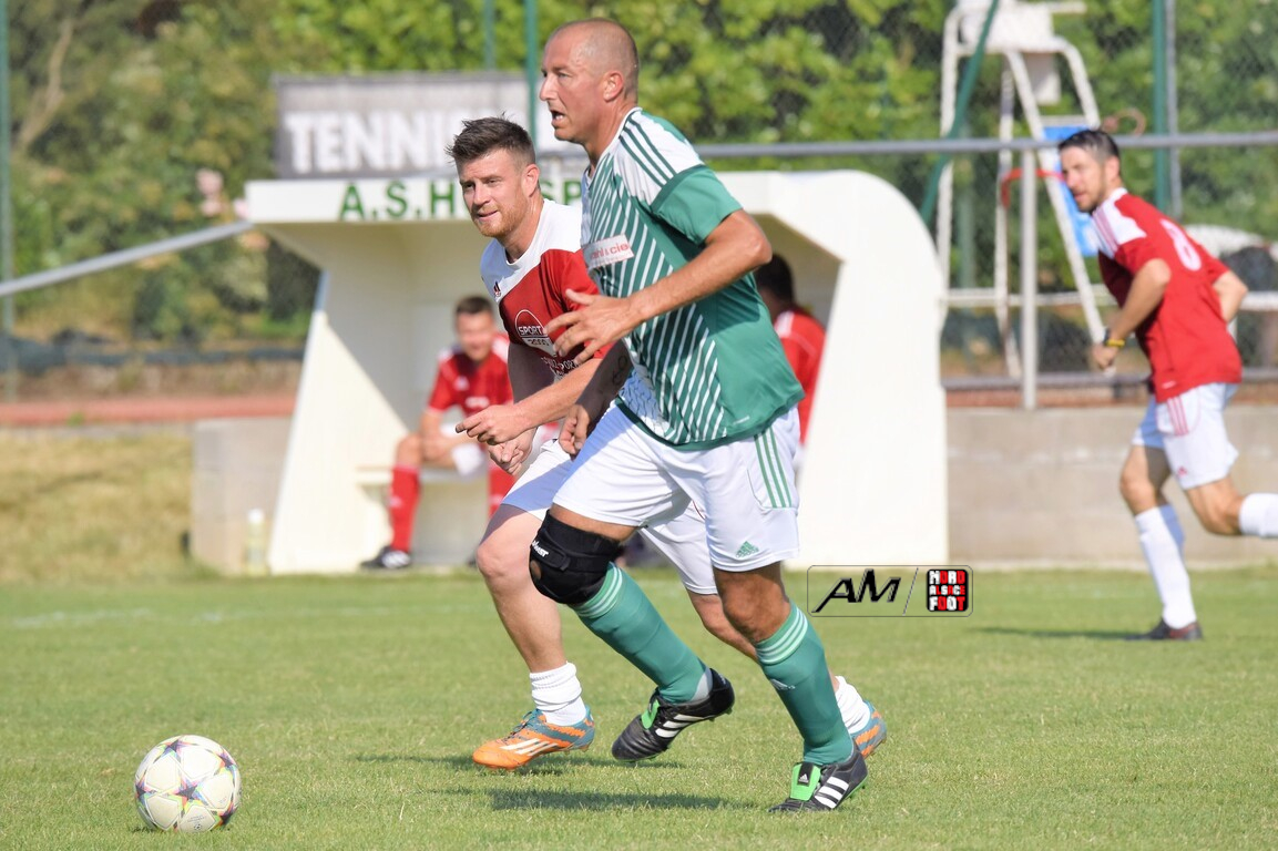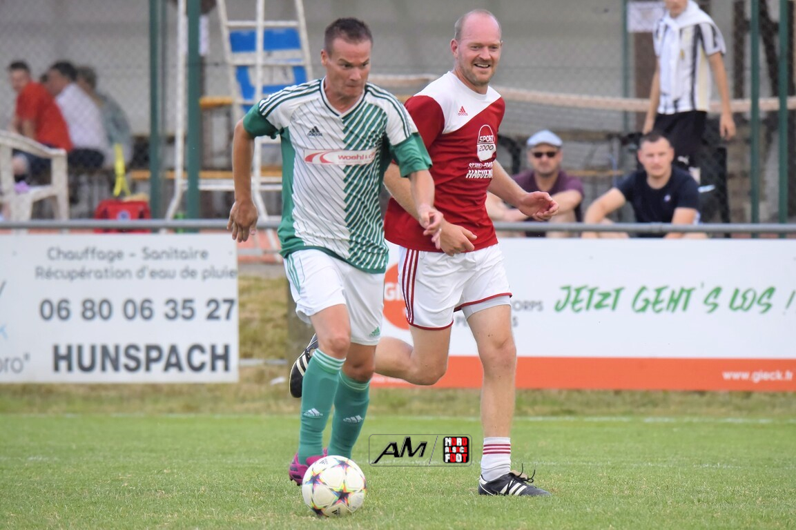 A l’occasion du 75e anniversaire de l’AS Hunspach, les anciennes gloires du club se sont données rendez-vous au Stade Municipal afin de se disputer un match des légendes devant un public ayant répondu présent pour cet évènement. Après une première période se soldant par un score de parité (1-1), les rouges allaient mener par deux buts d’écart à la 38e minute de jeu avant que les verts ne renverse le cours du match en parvenant à égaliser à la 43e minute de jeu avant qu’ils ne finissent par mener la danse en prenant deux buts d’avance à la 50e minute de jeu, les deux formations se neutralisant ensuite jusqu’au terme de la rencontre, les coéquipiers de Schorn Eric finissant donc par s’imposer sur ce score de 5-3! Retrouvez, ci-dessous, quelques images de cette rencontre et, pour en apprécier le contenu, veuillez cliquer sur l’une d’entre-elles pour afficher le diaporama.