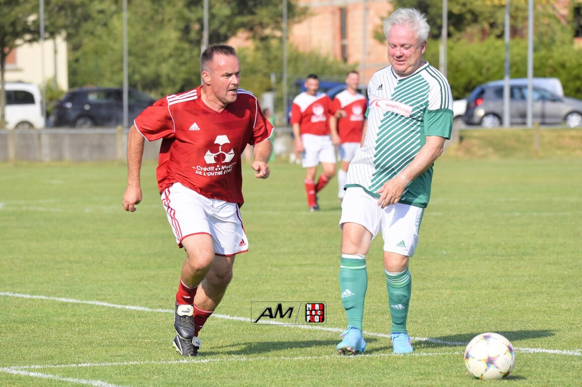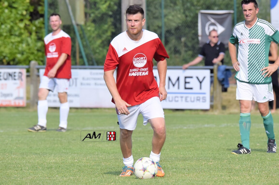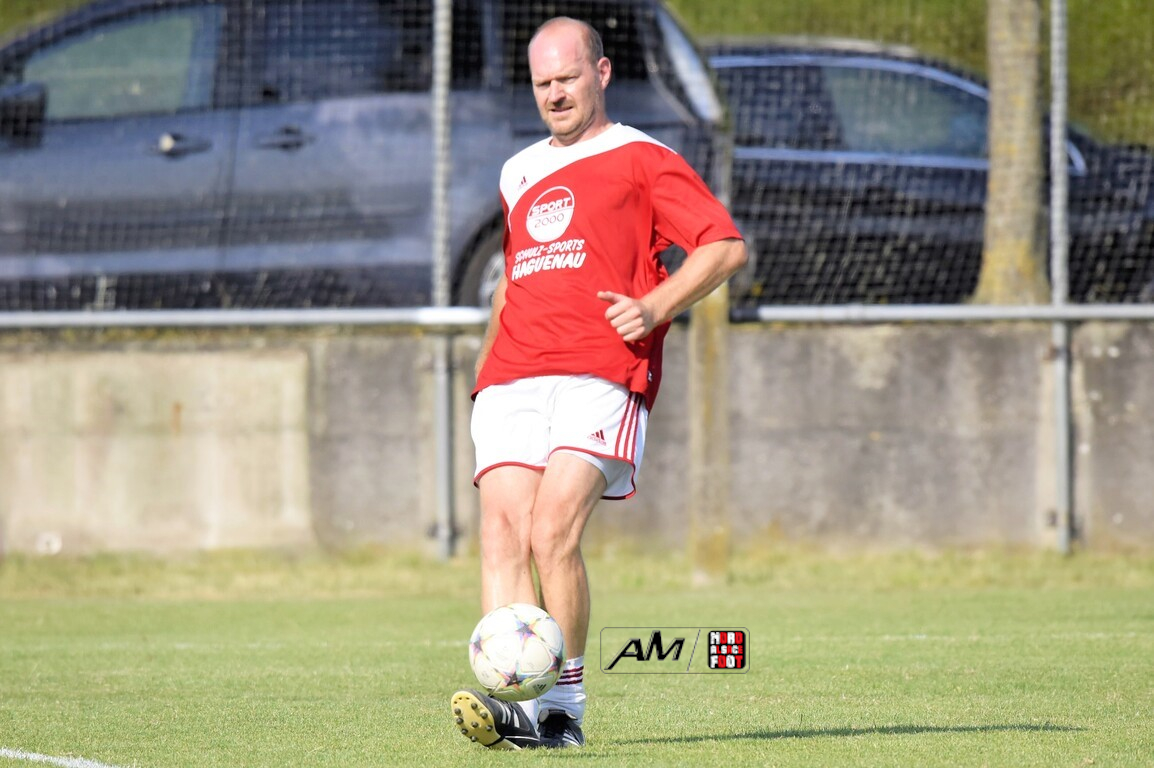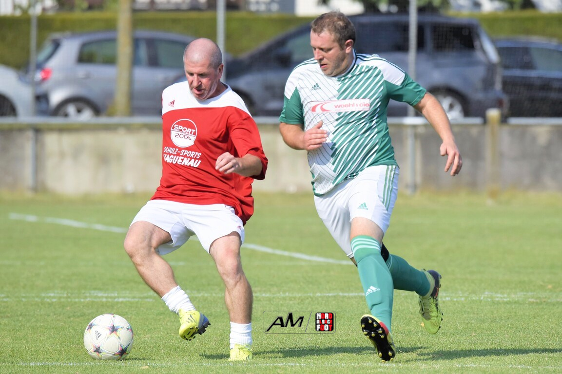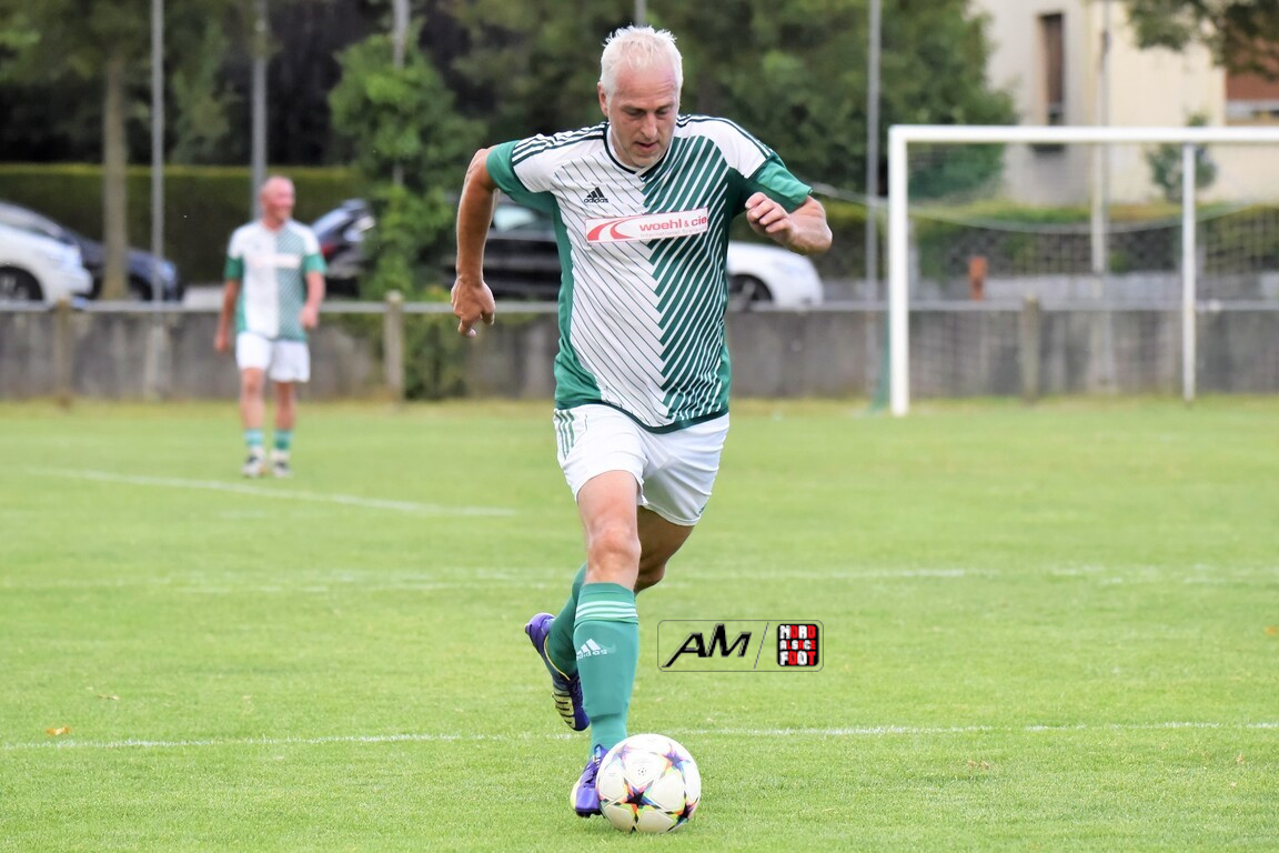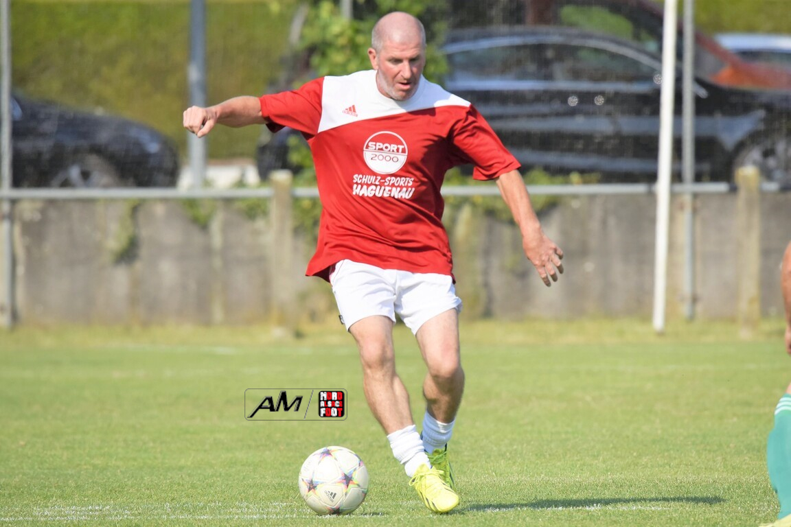 A l’occasion du 75e anniversaire de l’AS Hunspach, les anciennes gloires du club se sont données rendez-vous au Stade Municipal afin de se disputer un match des légendes devant un public ayant répondu présent pour cet évènement. Après une première période se soldant par un score de parité (1-1), les rouges allaient mener par deux buts d’écart à la 38e minute de jeu avant que les verts ne renverse le cours du match en parvenant à égaliser à la 43e minute de jeu avant qu’ils ne finissent par mener la danse en prenant deux buts d’avance à la 50e minute de jeu, les deux formations se neutralisant ensuite jusqu’au terme de la rencontre, les coéquipiers de Schorn Eric finissant donc par s’imposer sur ce score de 5-3! Retrouvez, ci-dessous, quelques images de cette rencontre et, pour en apprécier le contenu, veuillez cliquer sur l’une d’entre-elles pour afficher le diaporama.