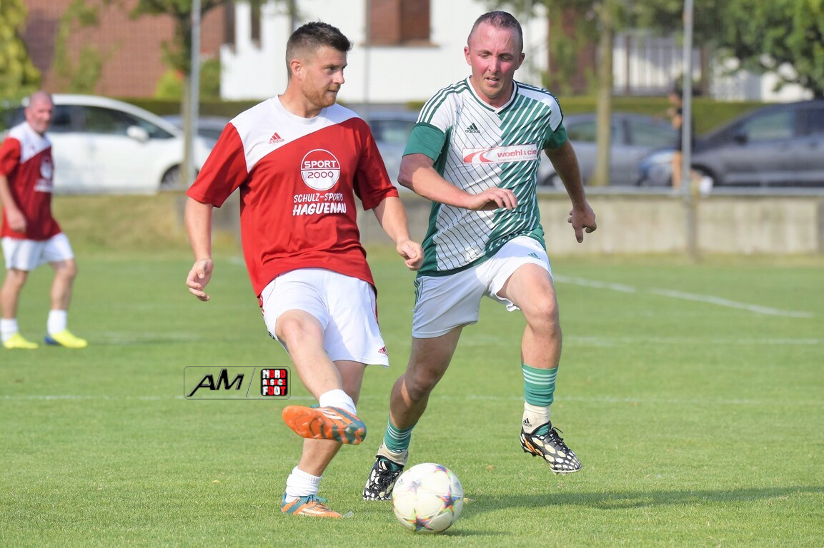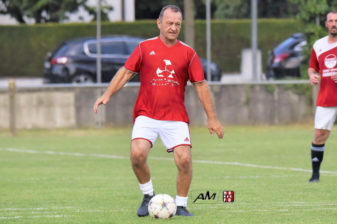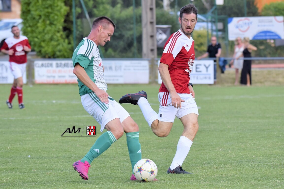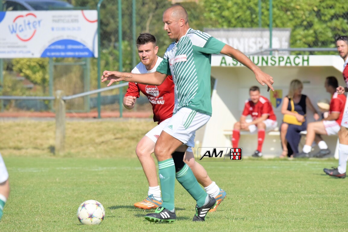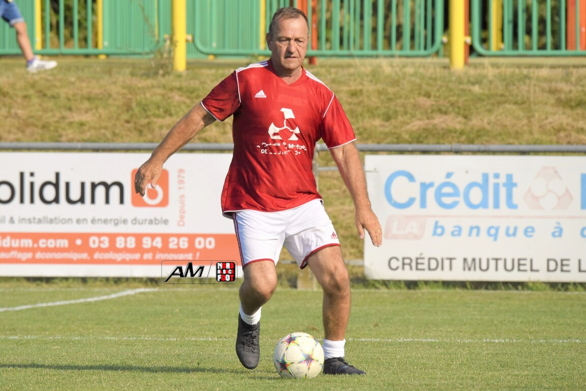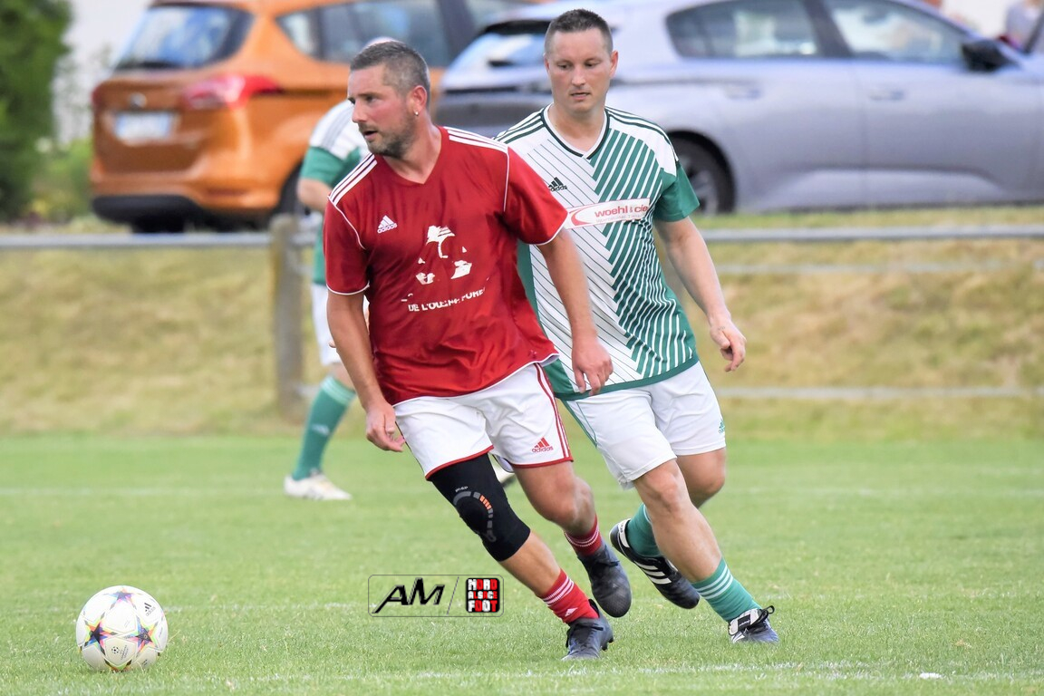 A l’occasion du 75e anniversaire de l’AS Hunspach, les anciennes gloires du club se sont données rendez-vous au Stade Municipal afin de se disputer un match des légendes devant un public ayant répondu présent pour cet évènement. Après une première période se soldant par un score de parité (1-1), les rouges allaient mener par deux buts d’écart à la 38e minute de jeu avant que les verts ne renverse le cours du match en parvenant à égaliser à la 43e minute de jeu avant qu’ils ne finissent par mener la danse en prenant deux buts d’avance à la 50e minute de jeu, les deux formations se neutralisant ensuite jusqu’au terme de la rencontre, les coéquipiers de Schorn Eric finissant donc par s’imposer sur ce score de 5-3! Retrouvez, ci-dessous, quelques images de cette rencontre et, pour en apprécier le contenu, veuillez cliquer sur l’une d’entre-elles pour afficher le diaporama.