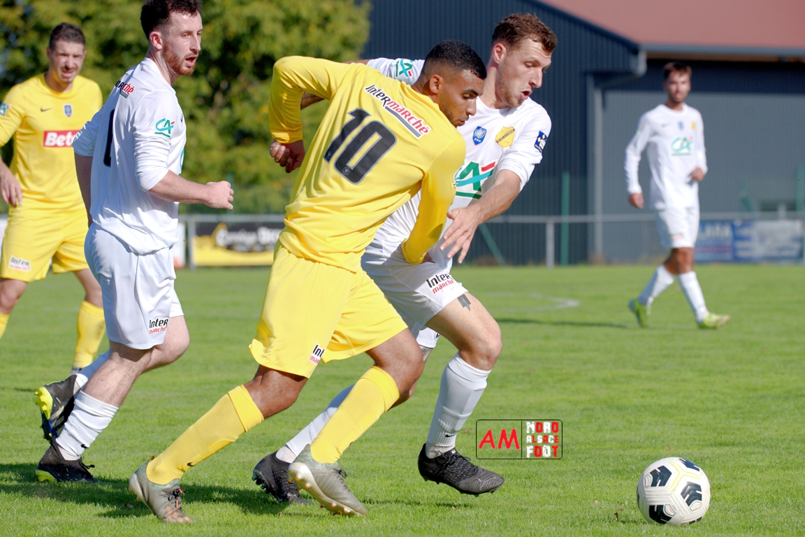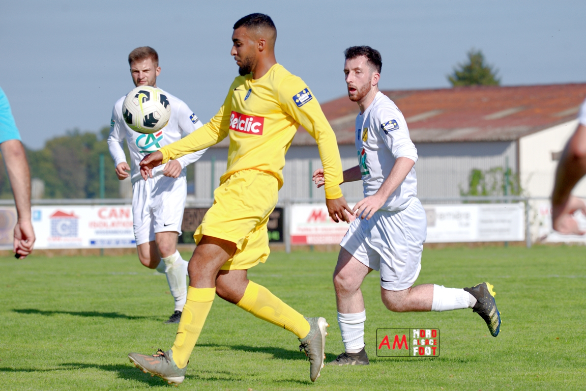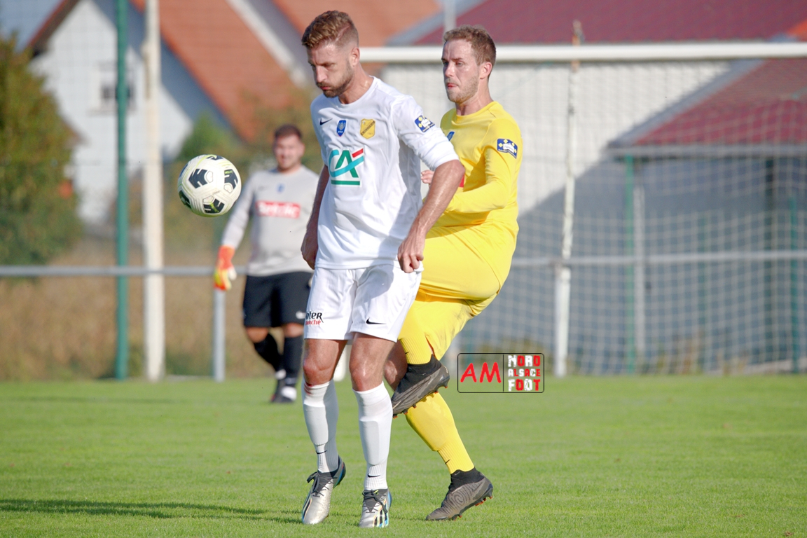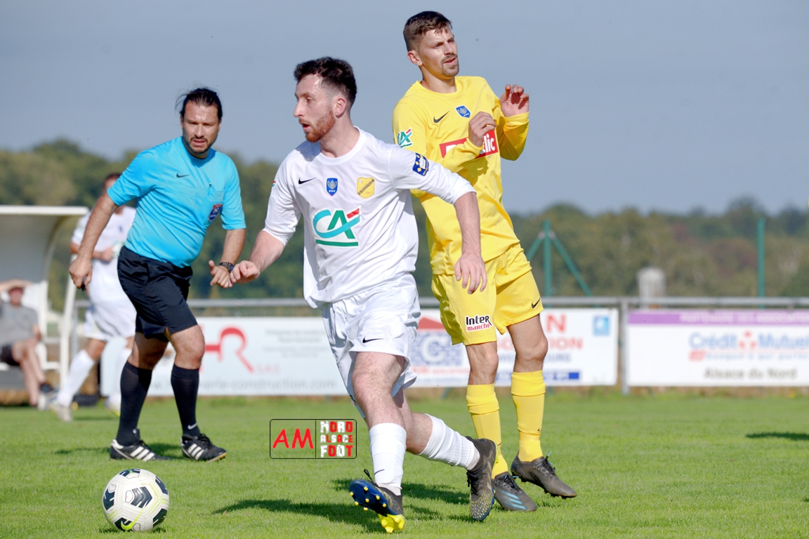 A l’occasion du quatrième tour de la Coupe de France, l’US Schleithal (Régionale 3) accueillait l’US Trois Maisons (District 1) afin de tenter de s’adjuger l’un des tickets pour le tour suivant, et ce, face à une équipe hiérarchiquement inférieure. Après une première période se soldant par un score nul et vierge, les visiteurs ouvrirent le score à la 64e minute de jeu par l’intermédiaire de Haro Jonathan (69e) avant que les locaux n’arrachent l’égalisation dans le temps additionnel grâce à une réalisation signée Boehm Martin (90e+3), les deux formations se disputant ensuite la qualification aux tirs-au-but au terme de laquelle un dernier tir de Boehm Martin passant au-dessus du but n’envoie les Mosellans au cinquième tour de cette compétition. Retrouvez, ci-dessous, quelques images de cette rencontre et, pour en apprécier le contenu, veuillez cliquer sur l’une d’entre-elles pour afficher le diaporama.