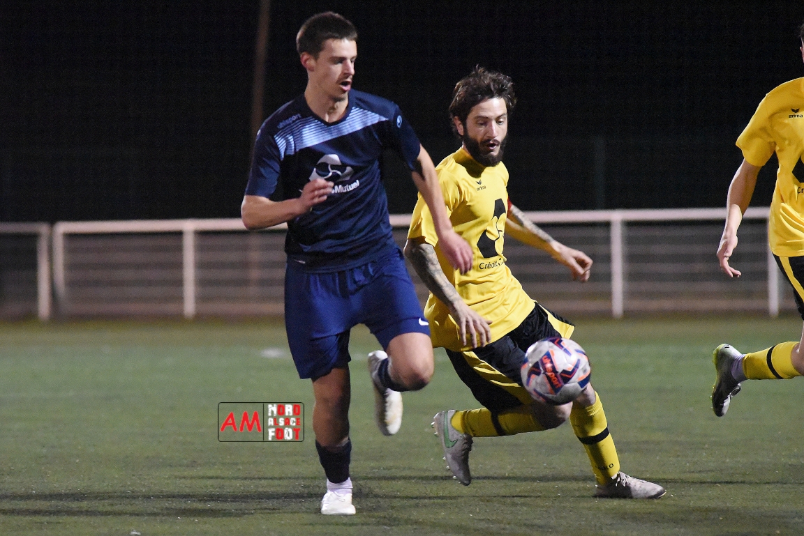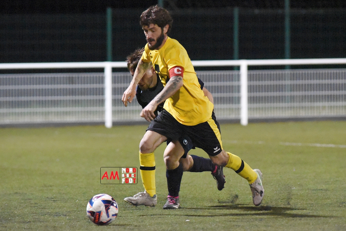 A l’occasion d’un match en retard comptant pour les huitièmes de finale de la Coupe Crédit Mutuel – Secteur Wissembourg, l’AS Hatten (District 4) accueillait le FC Mothern (Régionale 3) afin de tenter de réaliser un exploit dans leur antre, et ce, face à des adversaires ayant renoués avec la victoire dimanche dernier en battant le FC Steinseltz (1-2). Après une première période se soldant par un court avantage en faveur des locaux suite à un CSC (29e), le dernier quart d’heure de jeu fut fatal pour les Mothernois, ces derniers encaissant trois buts inscrits par Kuhn Joël (78e), Lopez Morgan (82e) et Bedell Thomas (85e) avant que l’AS Hatten ne finisse par s’imposer sur ce score fleuve de 4-0! Retrouvez, ci-dessous, quelques images de cette rencontre et, pour en apprécier le contenu, veuillez cliquer sur l’une d’entre-elles pour afficher le diaporama.