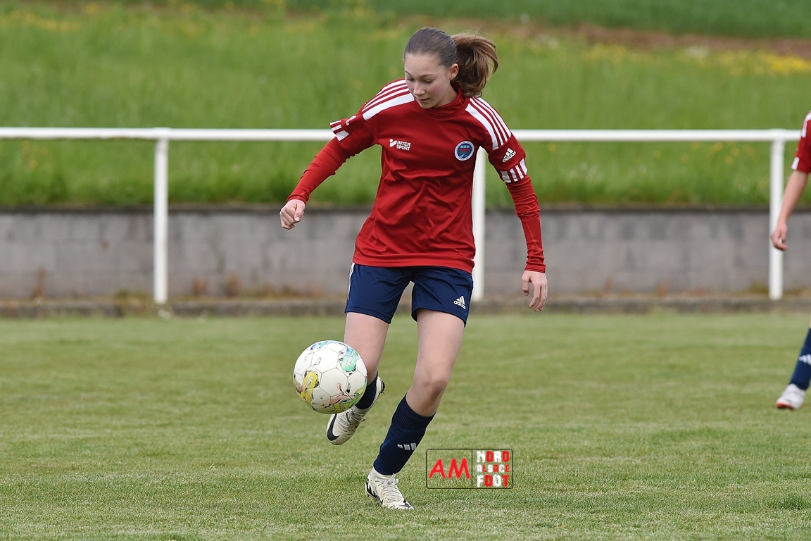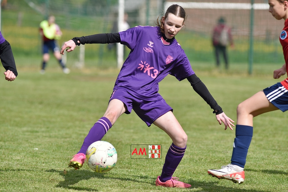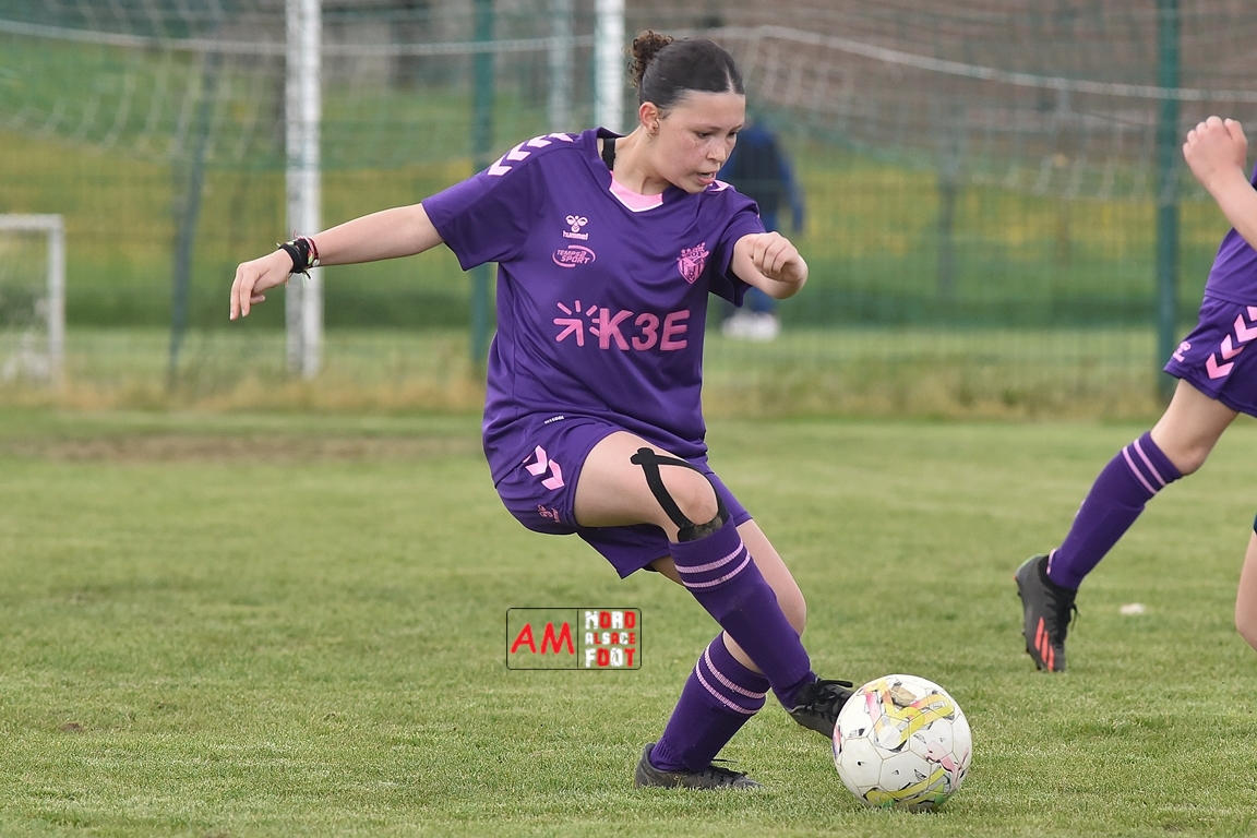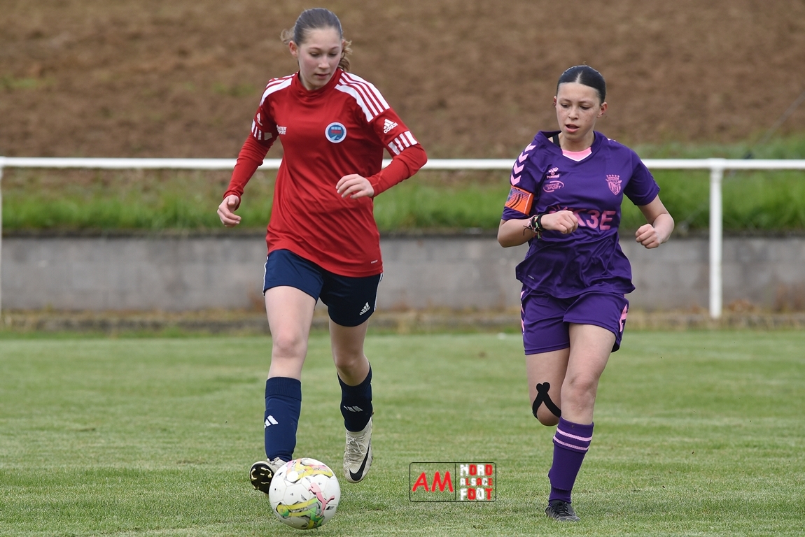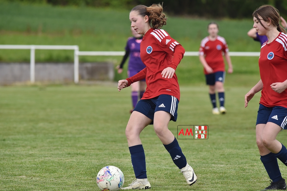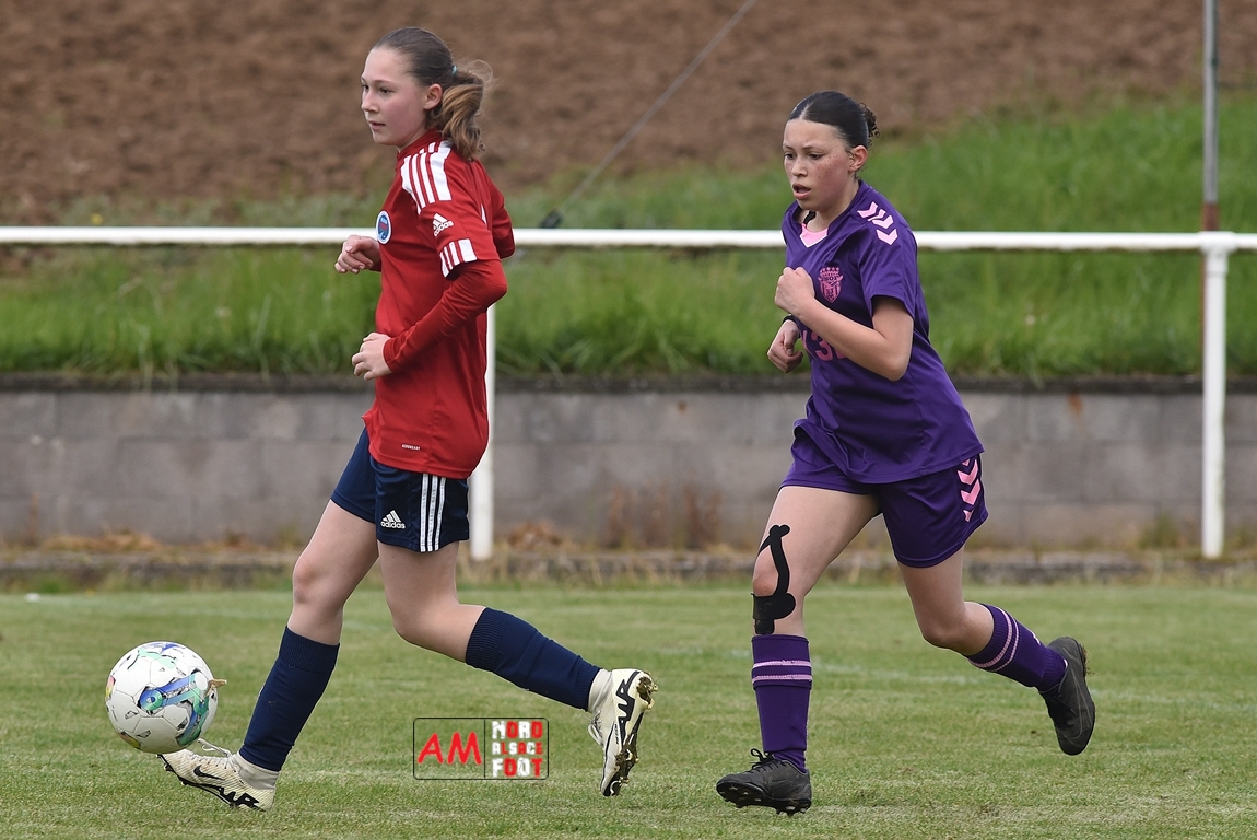 A l’occasion de la sixième journée de championnat de cette phase printanière chez les U15/F à 8 (Poule A), la Jeunesse Sportive de l’Outre-Forêt (1ère) accueillait le FCSR Haguenau (4e) afin de tenter d’enregistrer une sixième victoire en autant de rencontres disputées, et ce, face à des adversaires étant sans doute déterminées à les mettre en échec. Après une première période se soldant par un score de parité grâce à l’ouverture du scores des locales signée Nehrer Zoé (10e) contre une égalisations des visiteuses signée Birger Lochereau Louann (27e), les hunspachoises allaient prendre l’avantage à la 49e minute de jeu grâce à un doublé de Nehrer Zoé avant que les Haguenoviennes ne reviennent à hauteur de leurs hôtesses grâce à un but inscrit par Dermy Chicote Victoria (52e) et, alors qu’on filait probablement vers un match nul, les filles de la JSOF prirent définitivement l’avantage grâce à un triplé de Nehrer Zoé intervenant à cinq minutes du terme de cette rencontre. Retrouvez, ci-dessous, quelques images de cette rencontre et, pour en apprécier le contenu, veuillez cliquer sur l’une d’entre-elles pour afficher le diaporama.