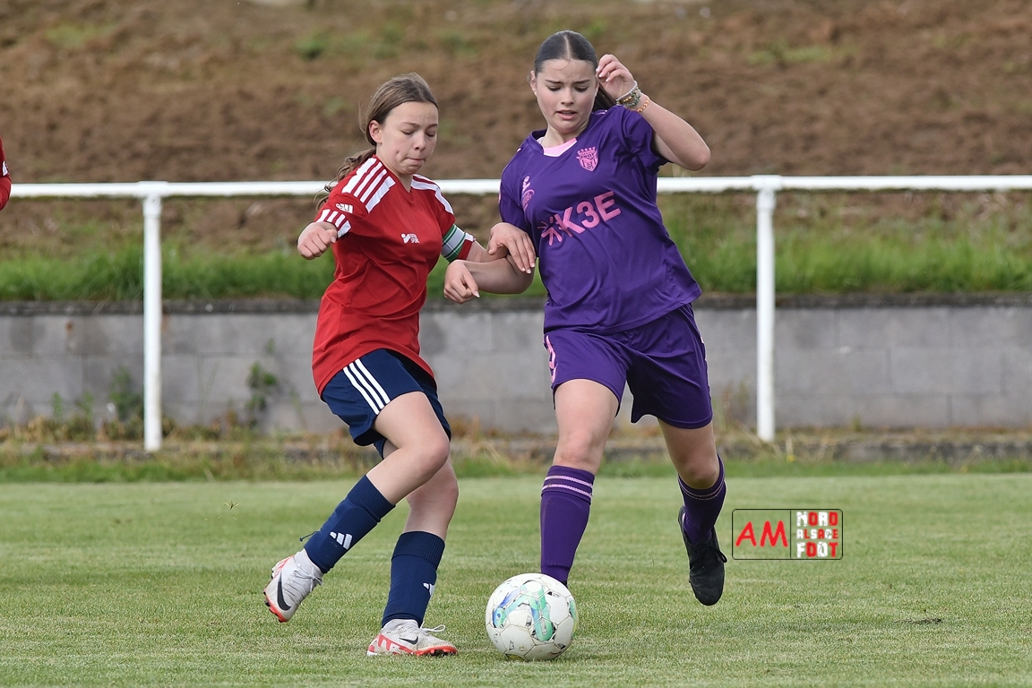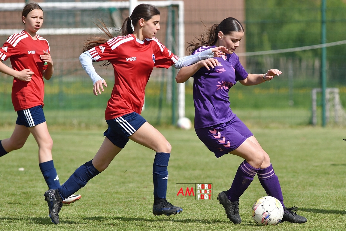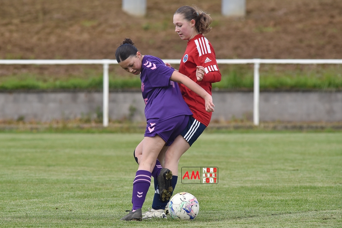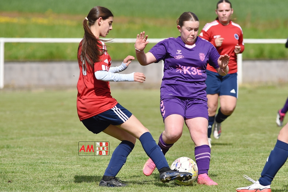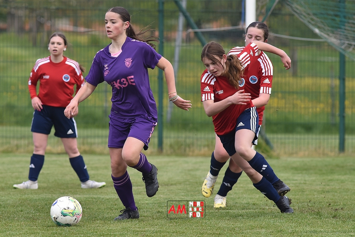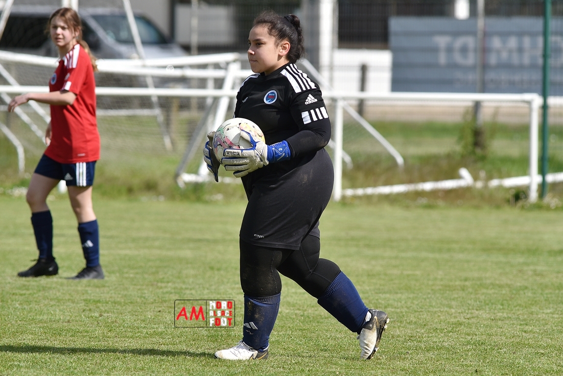 A l’occasion de la sixième journée de championnat de cette phase printanière chez les U15/F à 8 (Poule A), la Jeunesse Sportive de l’Outre-Forêt (1ère) accueillait le FCSR Haguenau (4e) afin de tenter d’enregistrer une sixième victoire en autant de rencontres disputées, et ce, face à des adversaires étant sans doute déterminées à les mettre en échec. Après une première période se soldant par un score de parité grâce à l’ouverture du scores des locales signée Nehrer Zoé (10e) contre une égalisations des visiteuses signée Birger Lochereau Louann (27e), les hunspachoises allaient prendre l’avantage à la 49e minute de jeu grâce à un doublé de Nehrer Zoé avant que les Haguenoviennes ne reviennent à hauteur de leurs hôtesses grâce à un but inscrit par Dermy Chicote Victoria (52e) et, alors qu’on filait probablement vers un match nul, les filles de la JSOF prirent définitivement l’avantage grâce à un triplé de Nehrer Zoé intervenant à cinq minutes du terme de cette rencontre. Retrouvez, ci-dessous, quelques images de cette rencontre et, pour en apprécier le contenu, veuillez cliquer sur l’une d’entre-elles pour afficher le diaporama.