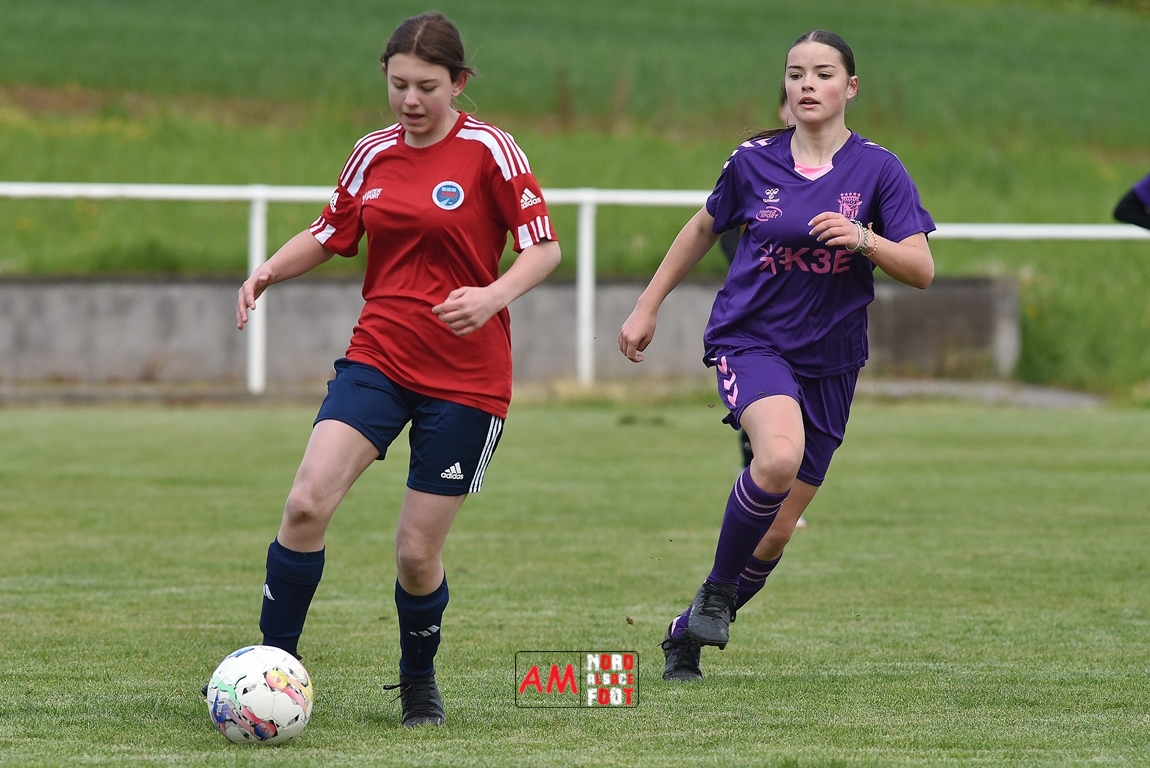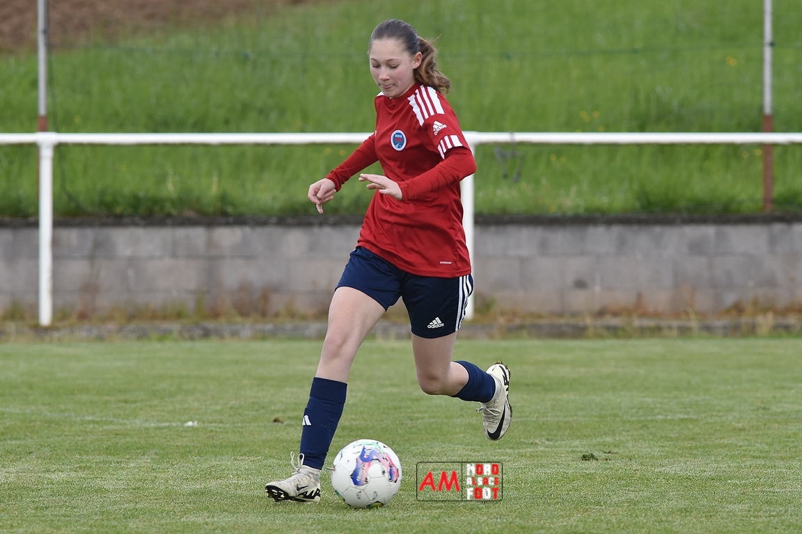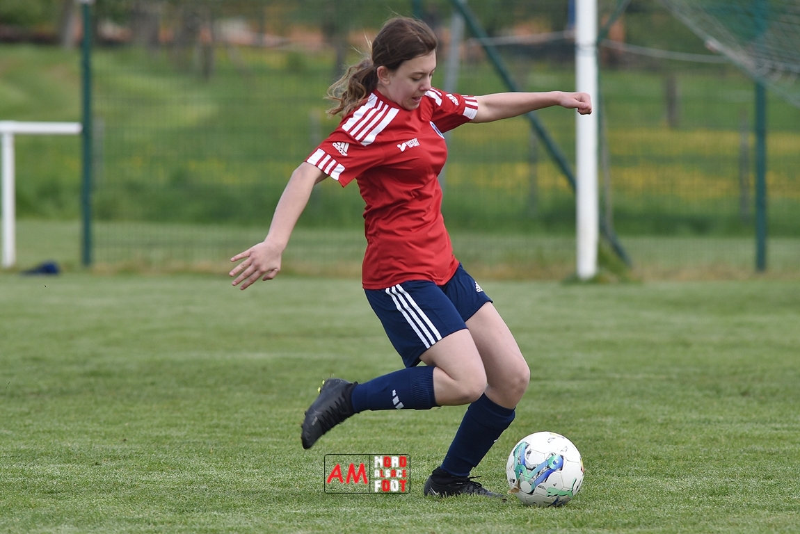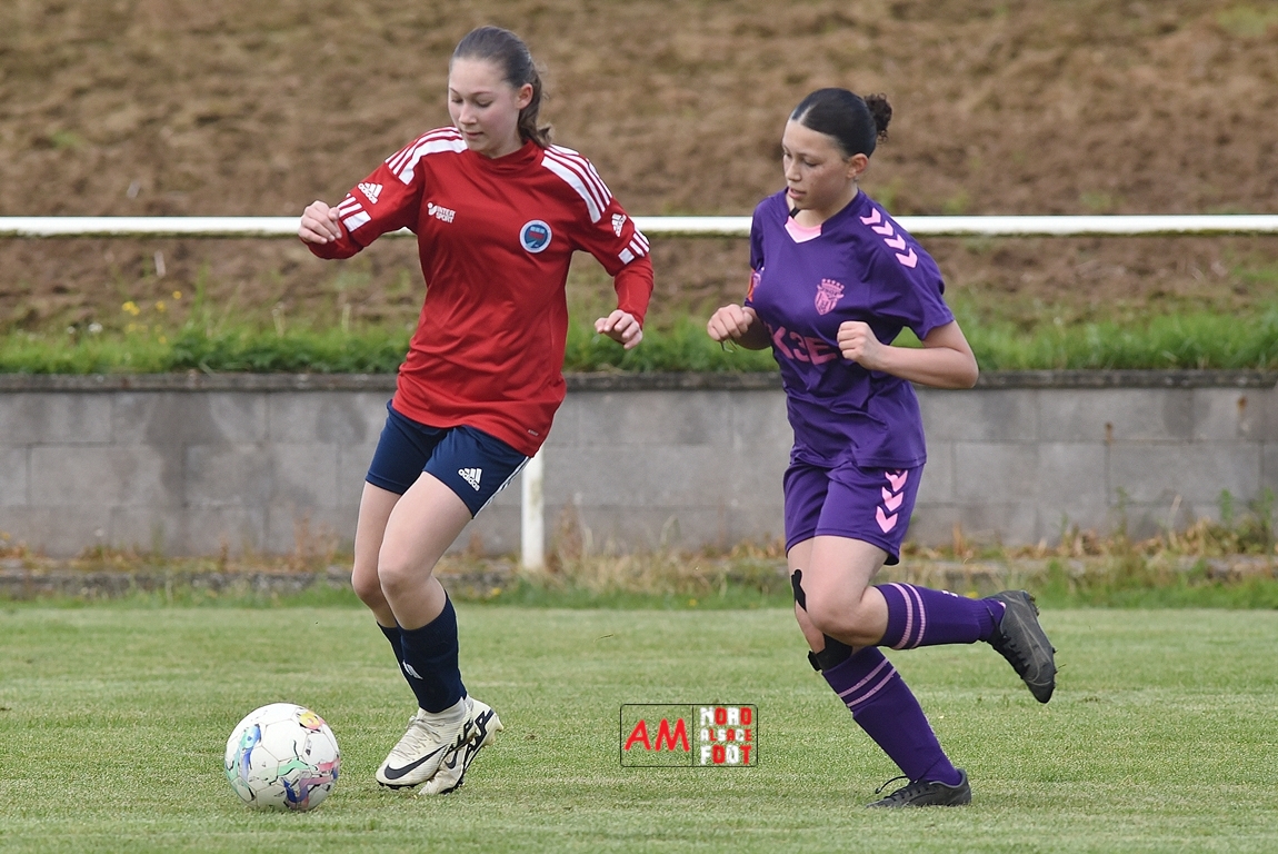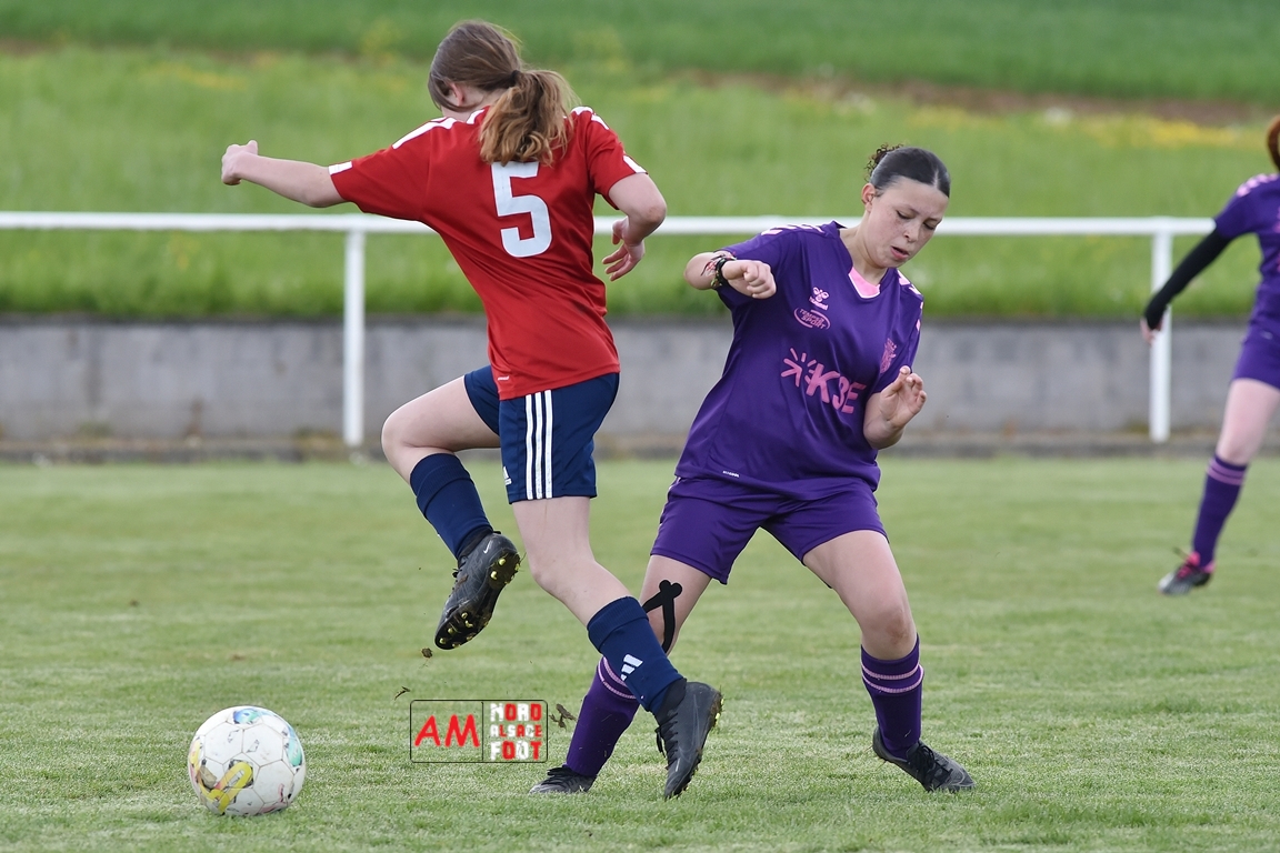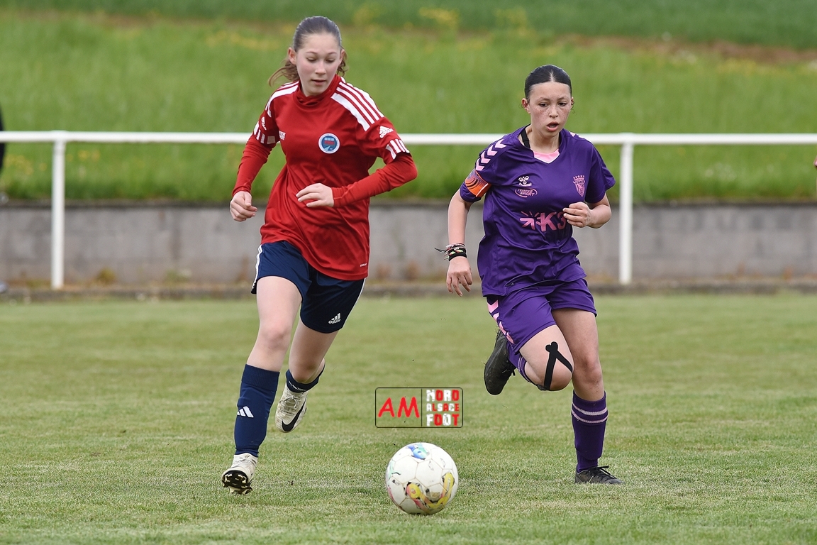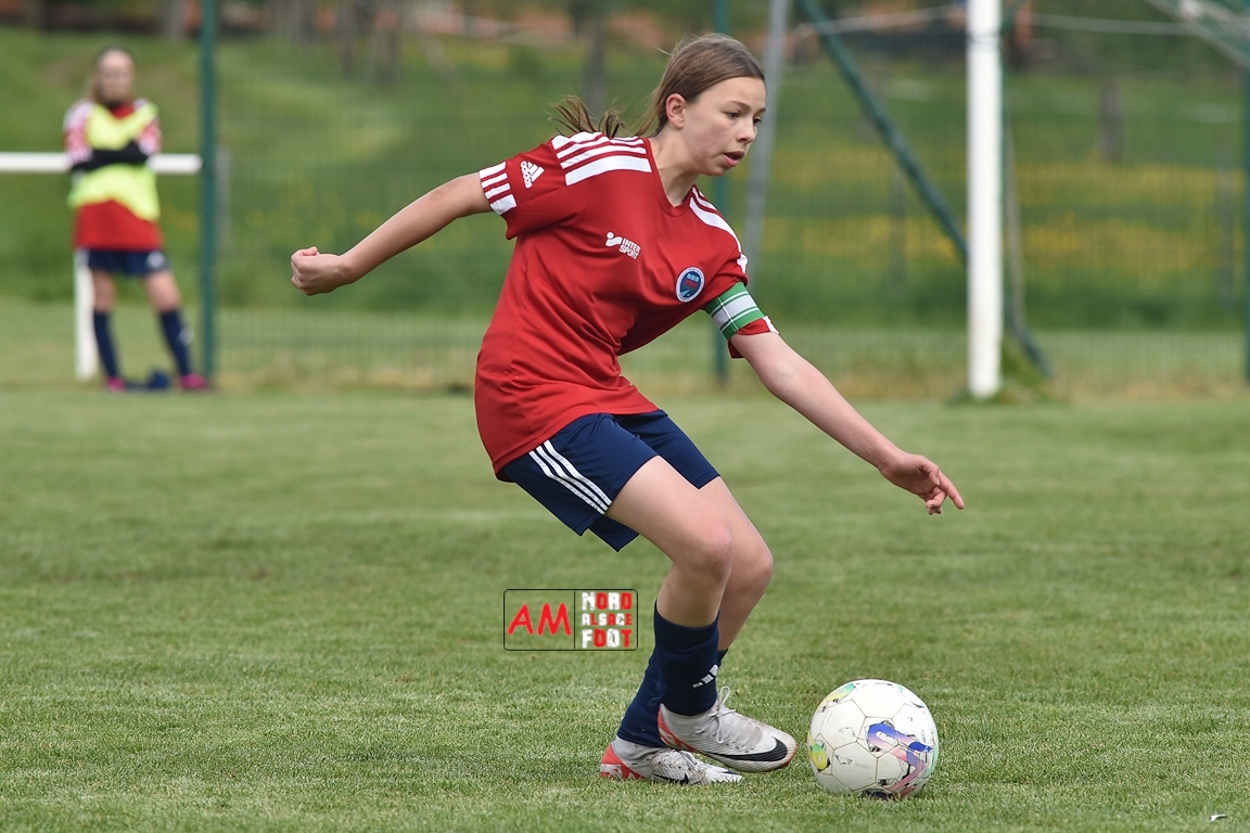 A l’occasion de la sixième journée de championnat de cette phase printanière chez les U15/F à 8 (Poule A), la Jeunesse Sportive de l’Outre-Forêt (1ère) accueillait le FCSR Haguenau (4e) afin de tenter d’enregistrer une sixième victoire en autant de rencontres disputées, et ce, face à des adversaires étant sans doute déterminées à les mettre en échec. Après une première période se soldant par un score de parité grâce à l’ouverture du scores des locales signée Nehrer Zoé (10e) contre une égalisations des visiteuses signée Birger Lochereau Louann (27e), les hunspachoises allaient prendre l’avantage à la 49e minute de jeu grâce à un doublé de Nehrer Zoé avant que les Haguenoviennes ne reviennent à hauteur de leurs hôtesses grâce à un but inscrit par Dermy Chicote Victoria (52e) et, alors qu’on filait probablement vers un match nul, les filles de la JSOF prirent définitivement l’avantage grâce à un triplé de Nehrer Zoé intervenant à cinq minutes du terme de cette rencontre. Retrouvez, ci-dessous, quelques images de cette rencontre et, pour en apprécier le contenu, veuillez cliquer sur l’une d’entre-elles pour afficher le diaporama.