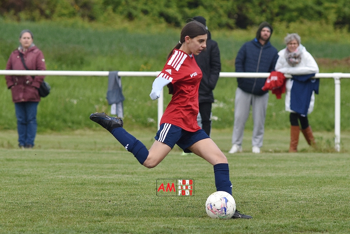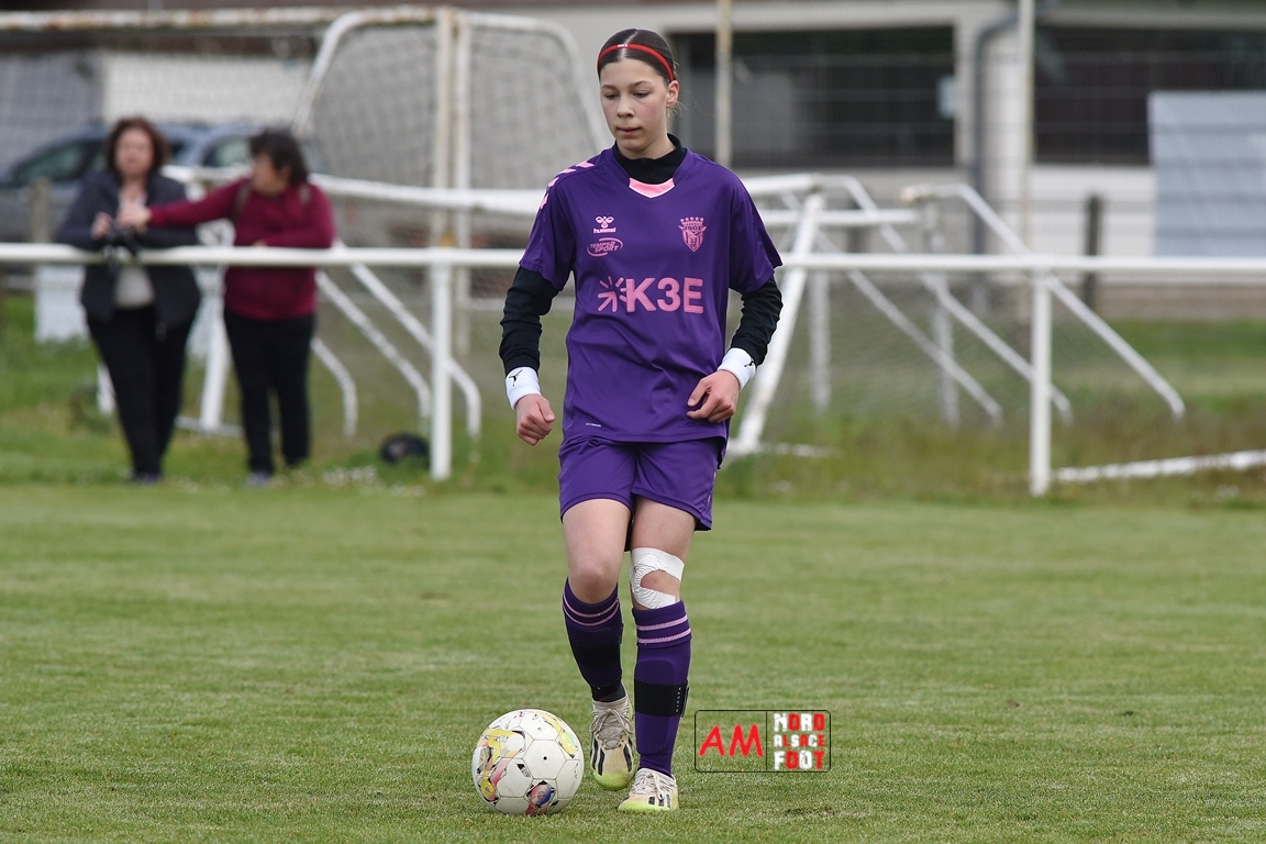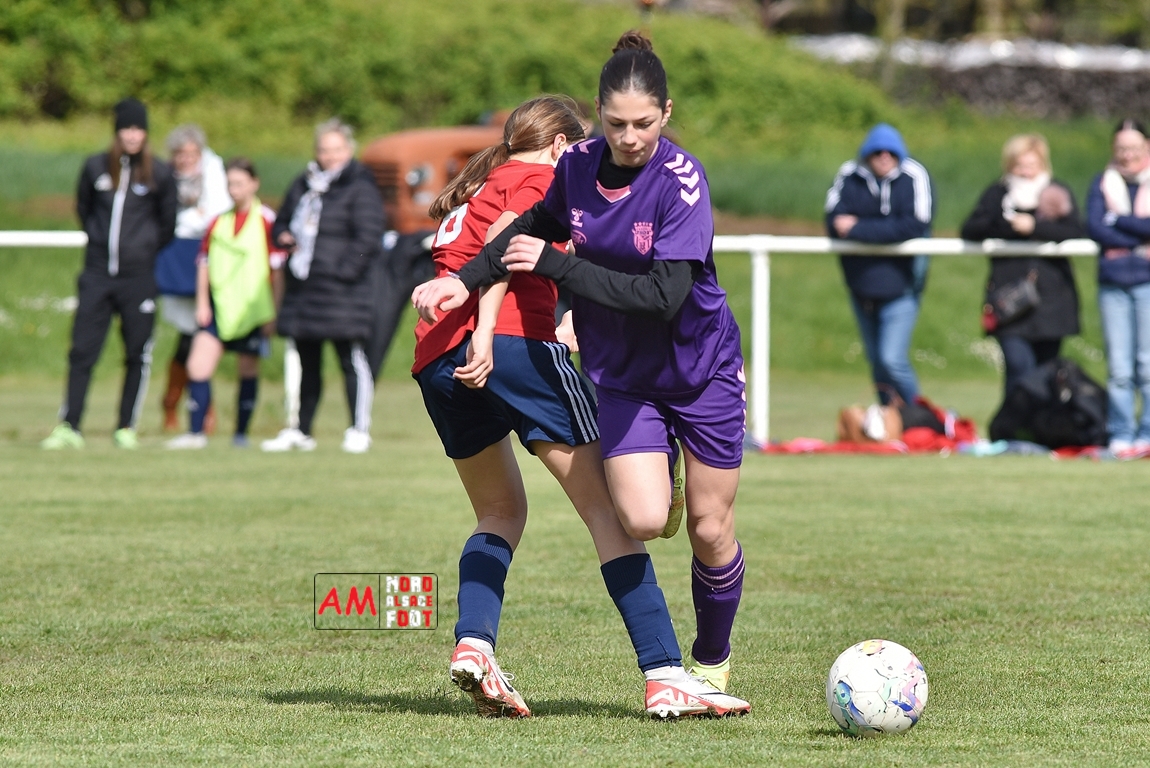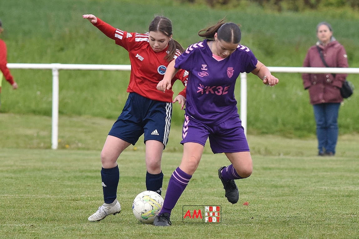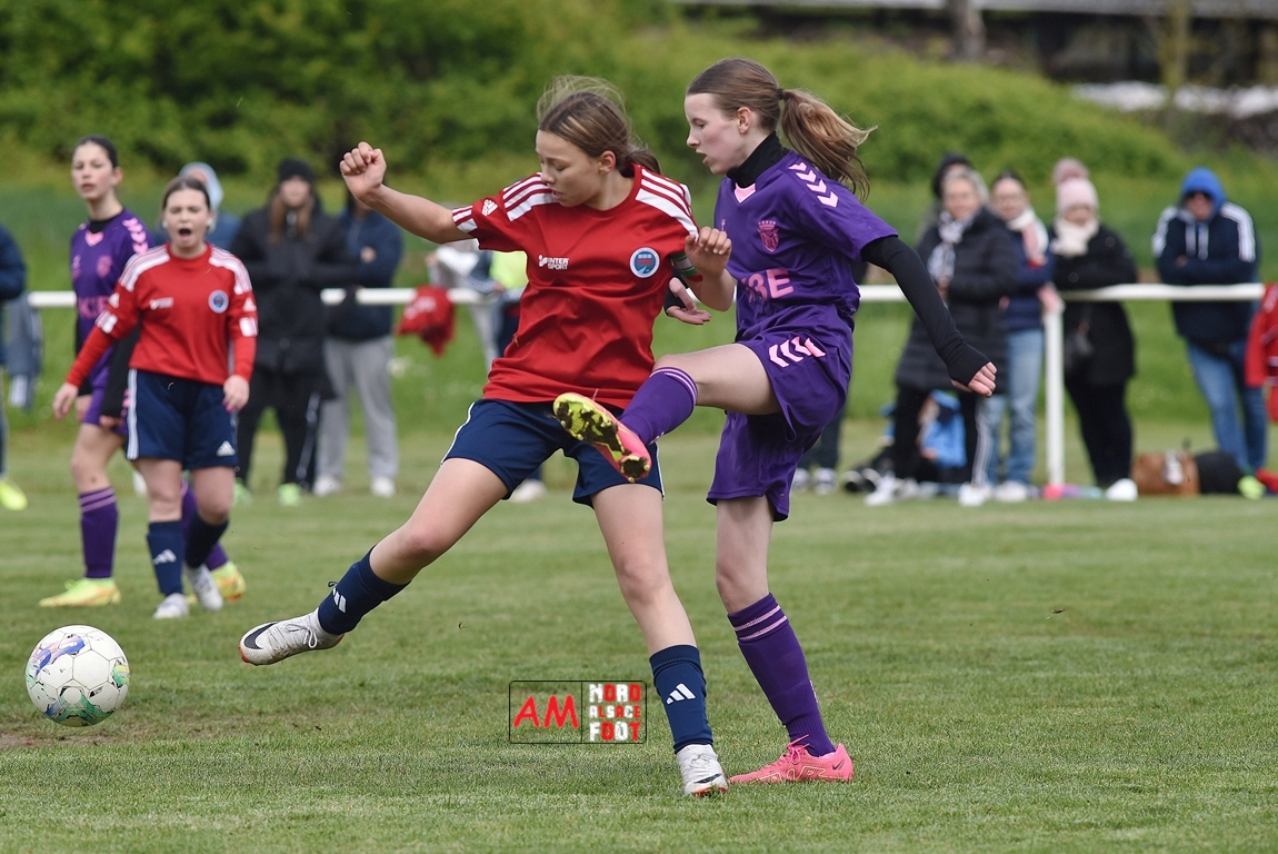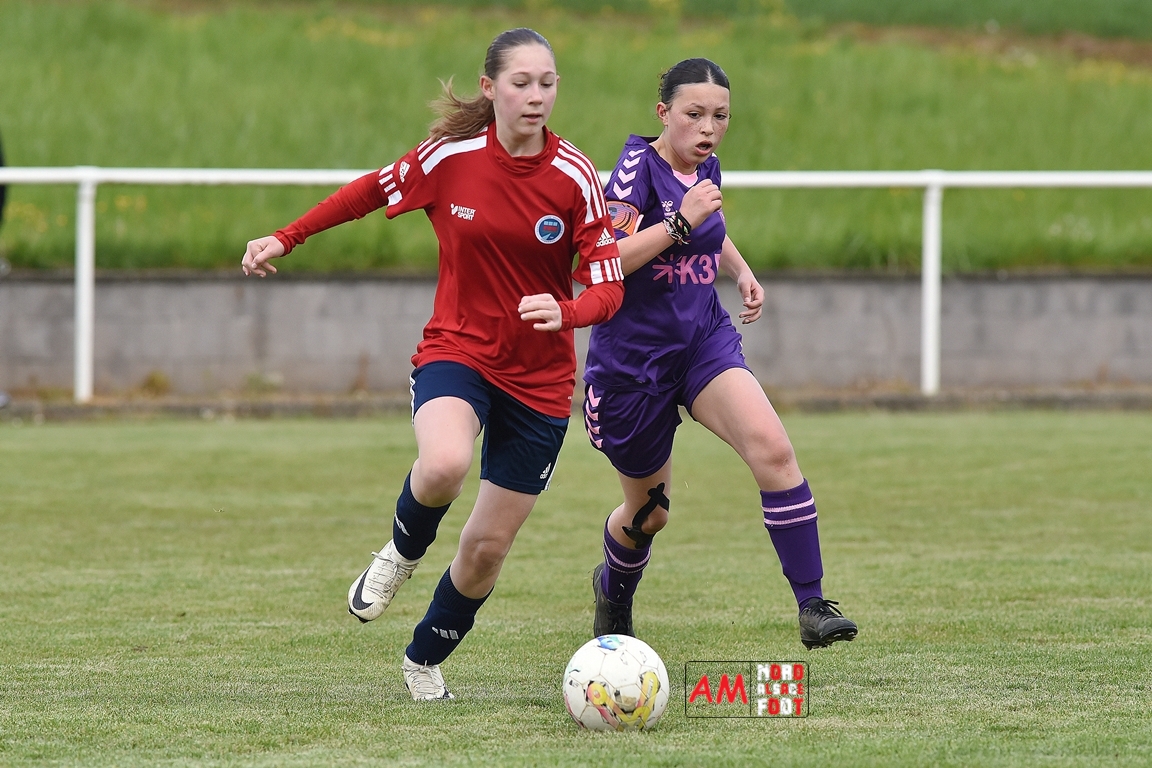 A l’occasion de la sixième journée de championnat de cette phase printanière chez les U15/F à 8 (Poule A), la Jeunesse Sportive de l’Outre-Forêt (1ère) accueillait le FCSR Haguenau (4e) afin de tenter d’enregistrer une sixième victoire en autant de rencontres disputées, et ce, face à des adversaires étant sans doute déterminées à les mettre en échec. Après une première période se soldant par un score de parité grâce à l’ouverture du scores des locales signée Nehrer Zoé (10e) contre une égalisations des visiteuses signée Birger Lochereau Louann (27e), les hunspachoises allaient prendre l’avantage à la 49e minute de jeu grâce à un doublé de Nehrer Zoé avant que les Haguenoviennes ne reviennent à hauteur de leurs hôtesses grâce à un but inscrit par Dermy Chicote Victoria (52e) et, alors qu’on filait probablement vers un match nul, les filles de la JSOF prirent définitivement l’avantage grâce à un triplé de Nehrer Zoé intervenant à cinq minutes du terme de cette rencontre. Retrouvez, ci-dessous, quelques images de cette rencontre et, pour en apprécier le contenu, veuillez cliquer sur l’une d’entre-elles pour afficher le diaporama.