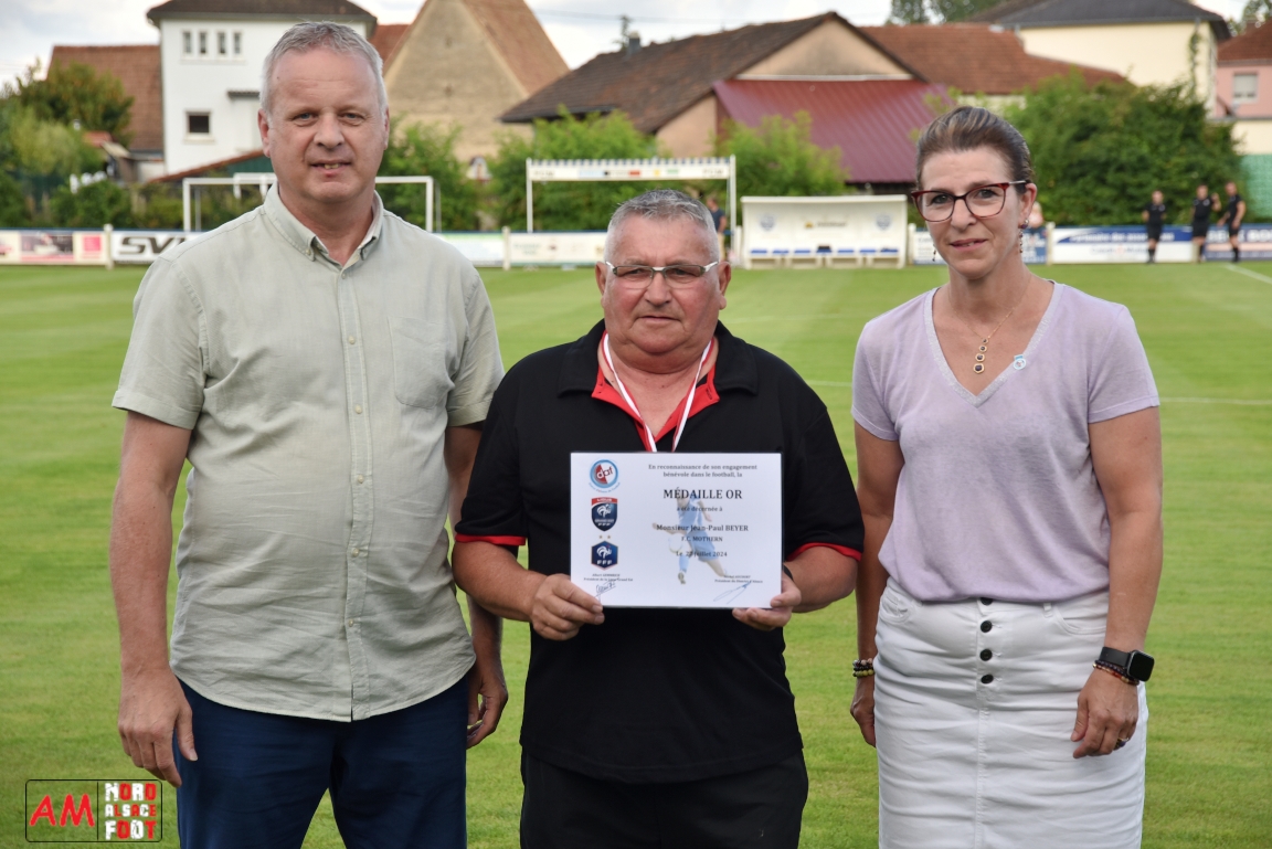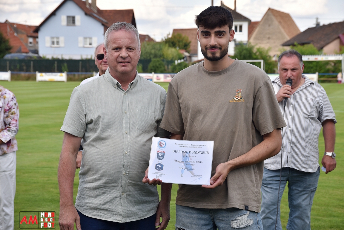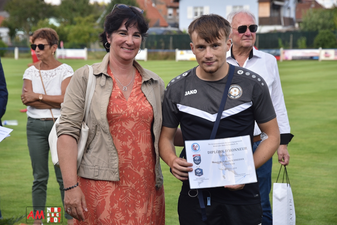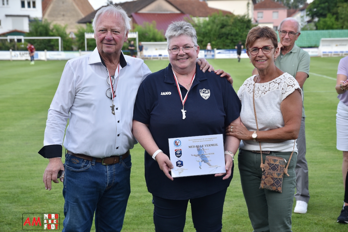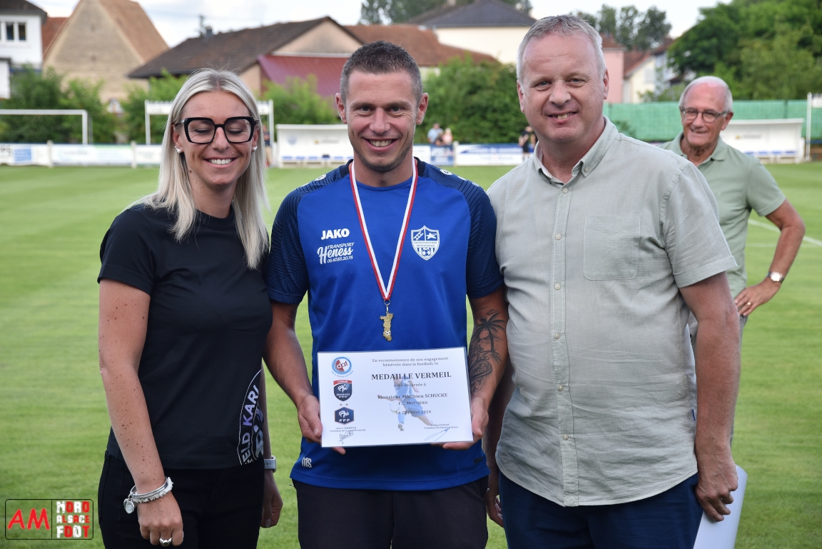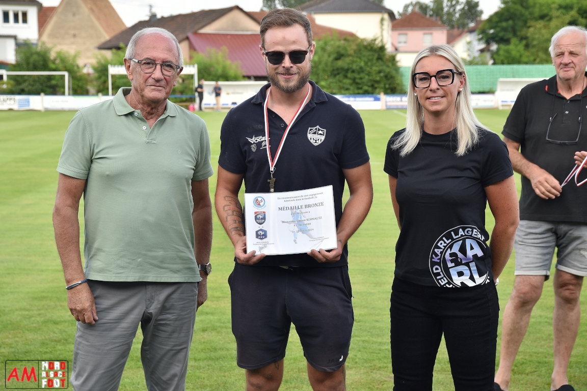 A l’occasion du 95ème anniversaire du FC Mothern, une grosse délégation du District d’Alsace composée de Michel Aucourt (Président du District d’Alsace), de Deubel Caroline (Vice-présidente en charge du développement), de André Hahn (vice-président en charge des coupes), de Pascal Fritz (représentant des arbitres), de Willig Francis (Président de la commission bénévolat), de Wahl Eric (Animateur territorial), de Zindy Patrice (Animateur territorial) et de Hoefler Isabelle (commission bénévolat), des élus du Grand Est et de la Collectivité Européenne d’Alsace avec Isinger Evelyne (Grand Est) et Heintz Paul (CEA), des élus locaux avec Schmaltz Isabelle (Maire de Mothern) et sa deuxième adjointe Ball Martine, des anciens présidents et arbitres ainsi que les acteurs méritants du club ont répondu à l’invitation de Mastio René (Président du FC Mothern) afin de prendre part à la cérémonie officielle. Après que chaque représentant ne soient intervenuschacun dans leur domaine de compétence, ce fut au tour de Willig Francis de prendre la parole pour la partie distinctions. Retrouvez, ci-dessous, quelques images de cette cérémonie et, pour en apprécier le contenu, veuillez cliquer sur l’une d’entre-elles pour afficher le diaporama. Attention, la photo de famille située au bas de l’album principal figure dans un second album, veuillez donc cliquer spécialement sur cette dernière pour la découvrir.