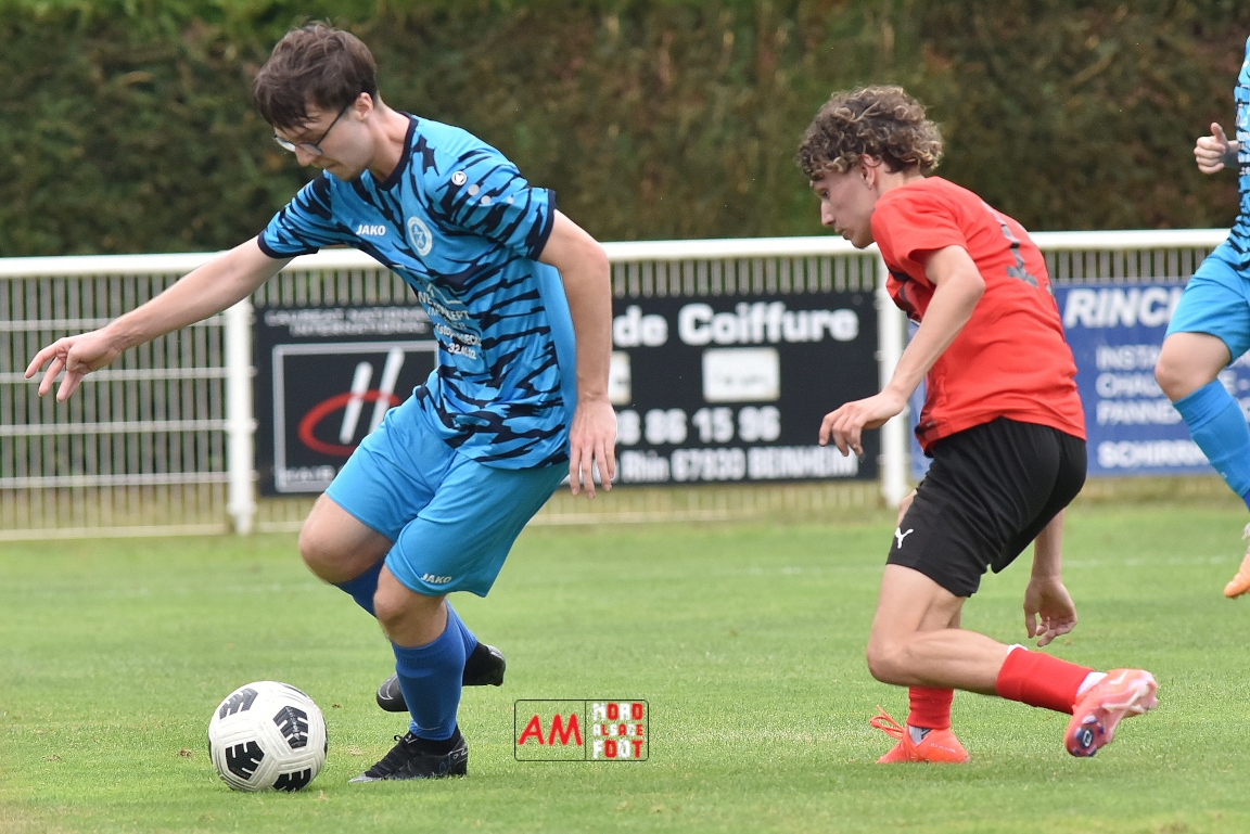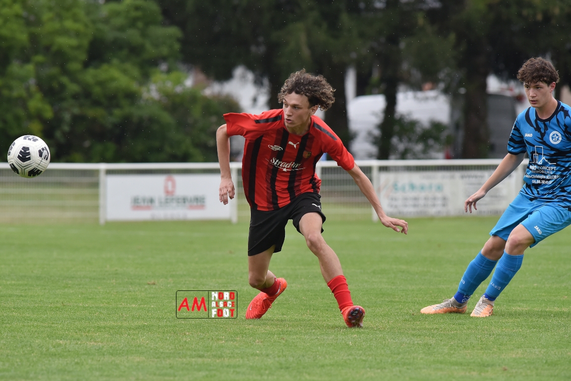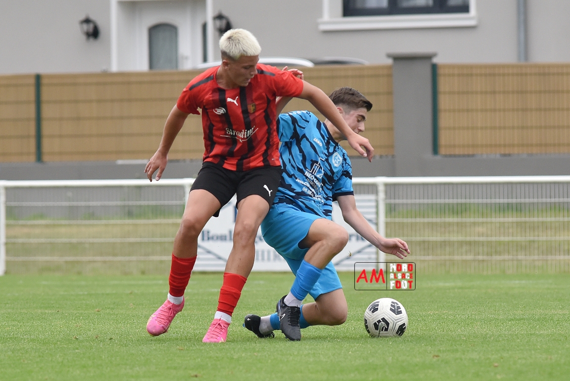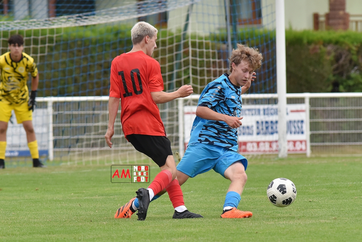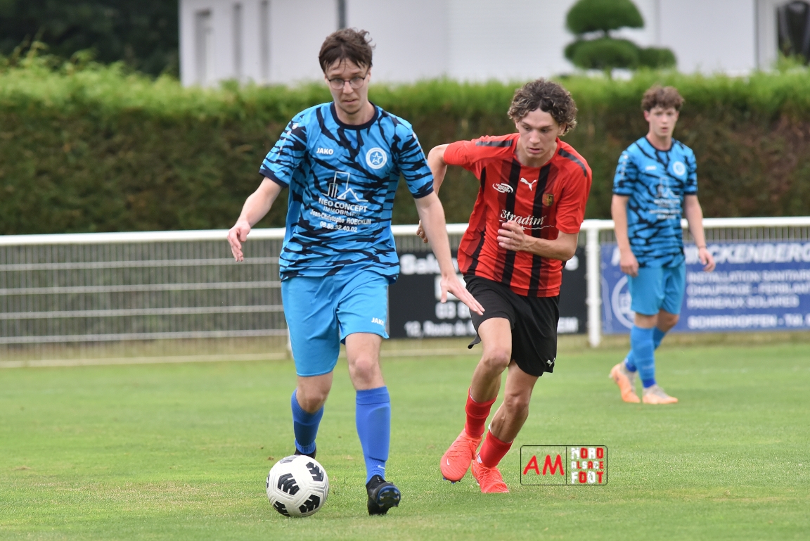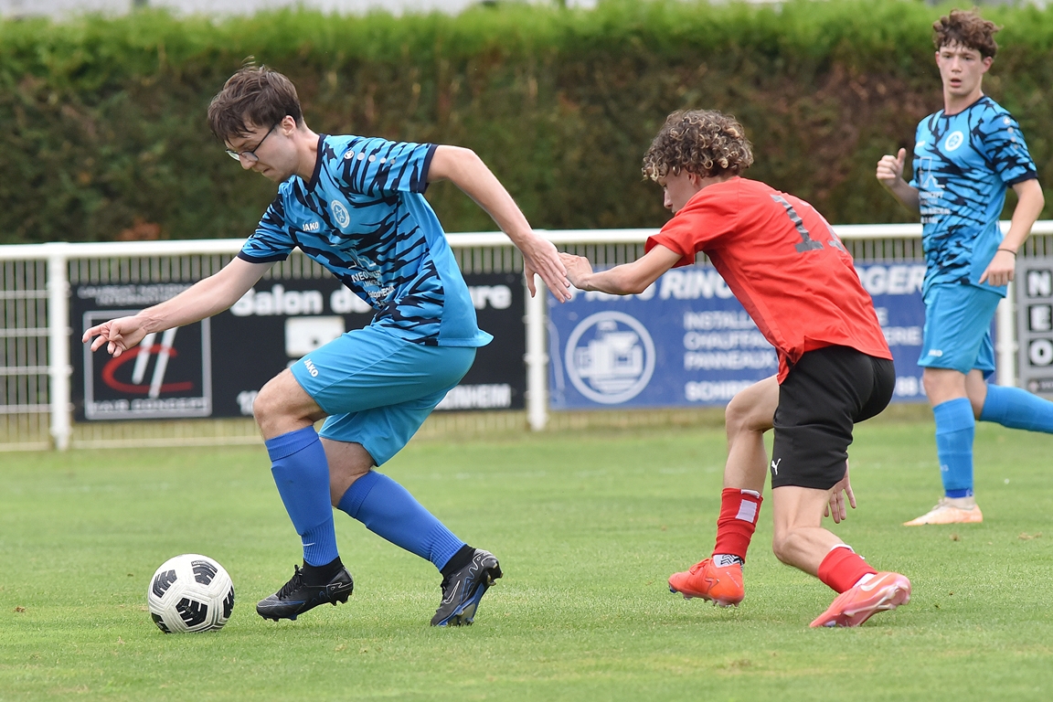 A l’occasion de la traditionnelle fête du foot organisée par le FCE Schirrhein-Schirrhoffen, les U18 du club accueillaient les U16 du FCSR Obernai afin de jauger les forces en présence en vue du premier tour de Coupe Gambardella intervenant à la fin août, et ce, face à une équipe adverse semblant mieux composée que la leur. Après une première période se soldant par un large avantage en faveur des Obernois (1-4), la rencontre allait s’équilibrer en seconde période avant que les deux formations ne se quittent finalement sur ce score de 1-4! Retrouvez, ci-dessous, quelques images de cette rencontre et, pour en apprécier le contenu, veuillez cliquer sur l’une d’entre-elles pour afficher le diaporama.