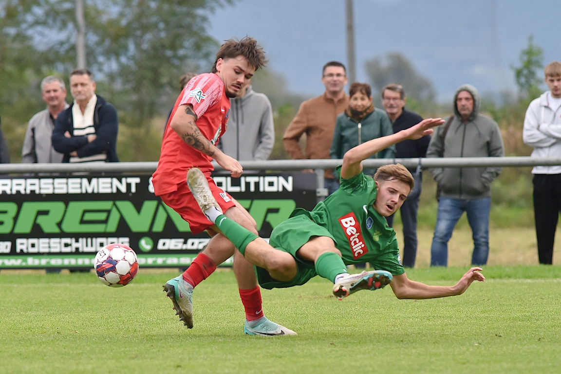 | 23′ | Après avoir franchi la ligne médiane sur la gauche, Keller Nathan (SS Beinheim) répondit à l’appel dans le couloir de Bretar Thomas, ce dernier se mettant ensuite dans de bonnes dispositions pour expédier un centre tendu à ras-de-terre en direction du second poteau à hauteur duquel aucun de ses partenaires ne fut en mesure de couper la trajectoire du ballon, ce dernier mourant finalement en sortie de but. | |