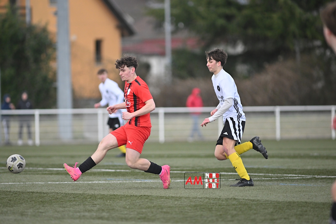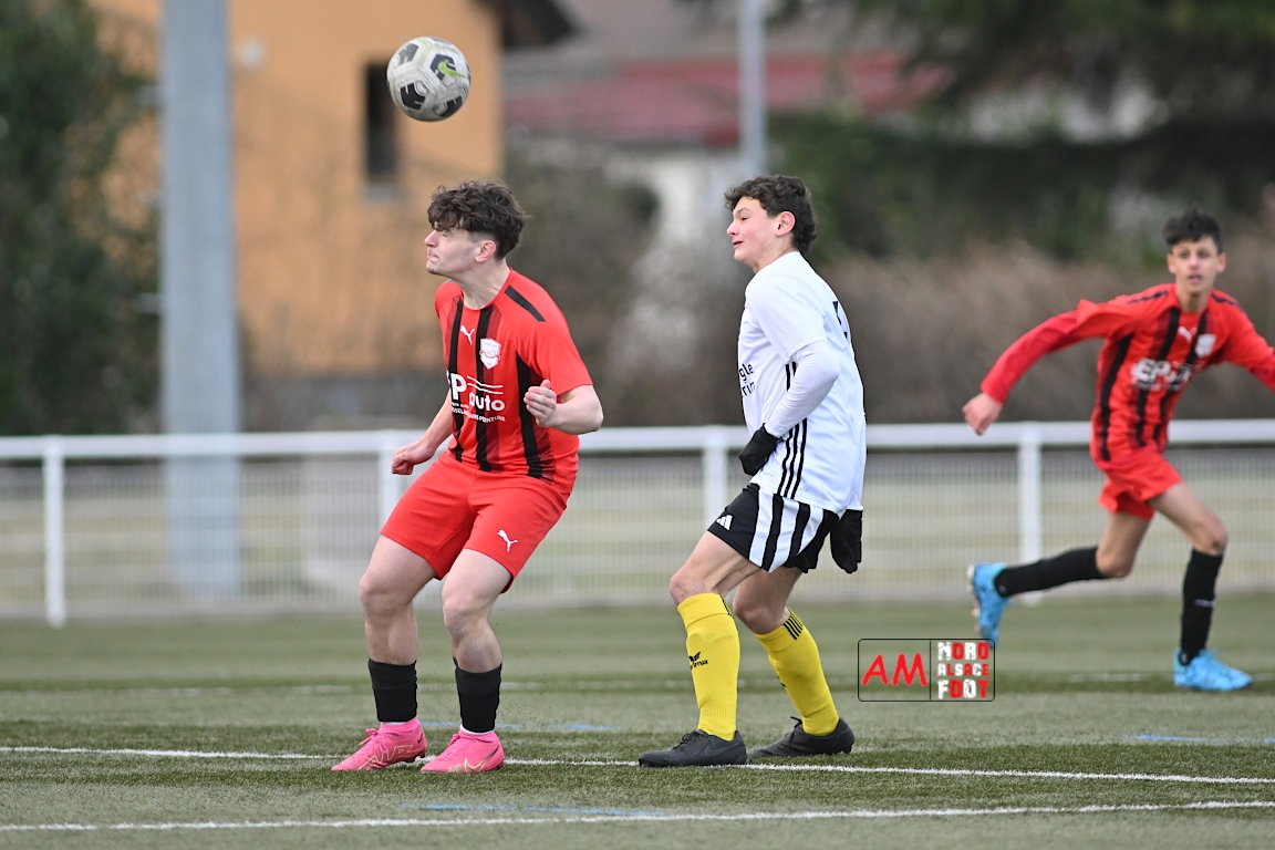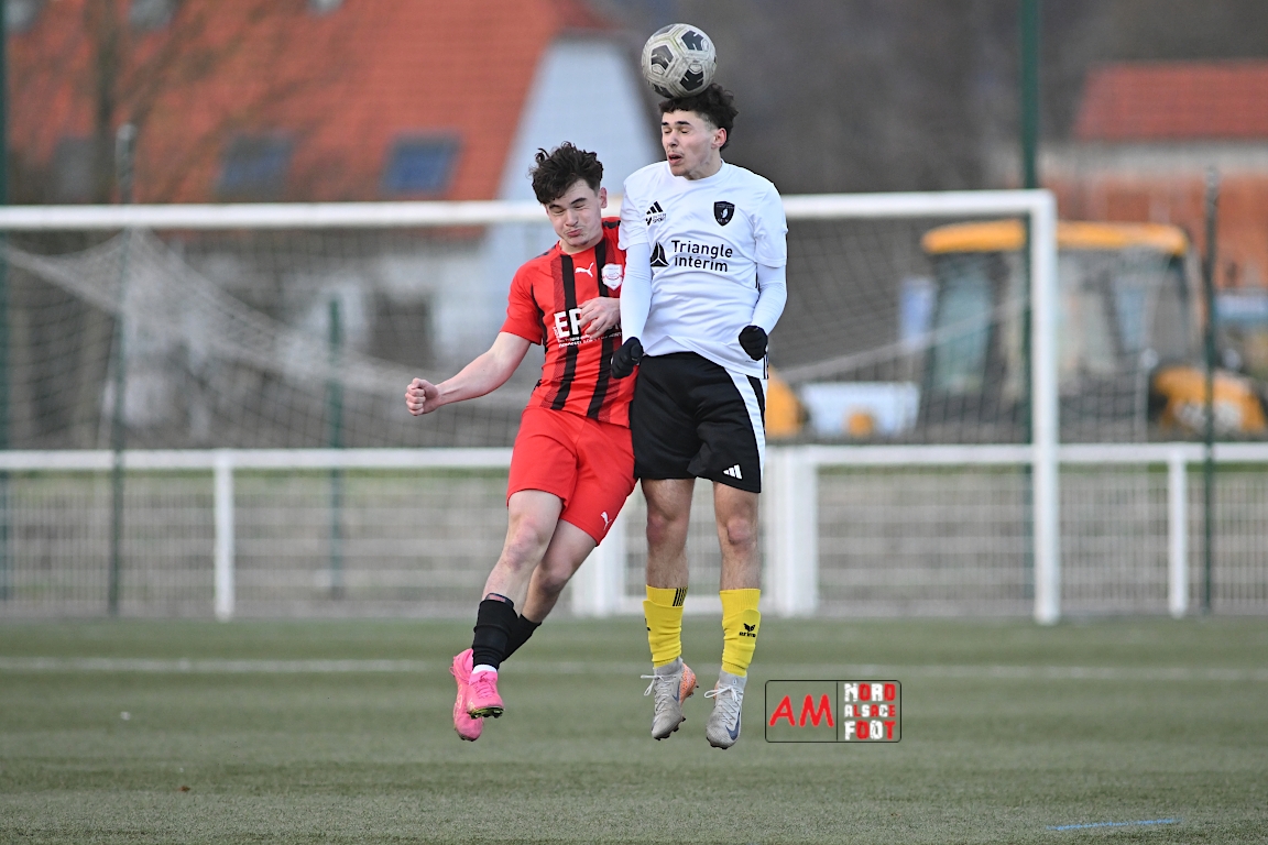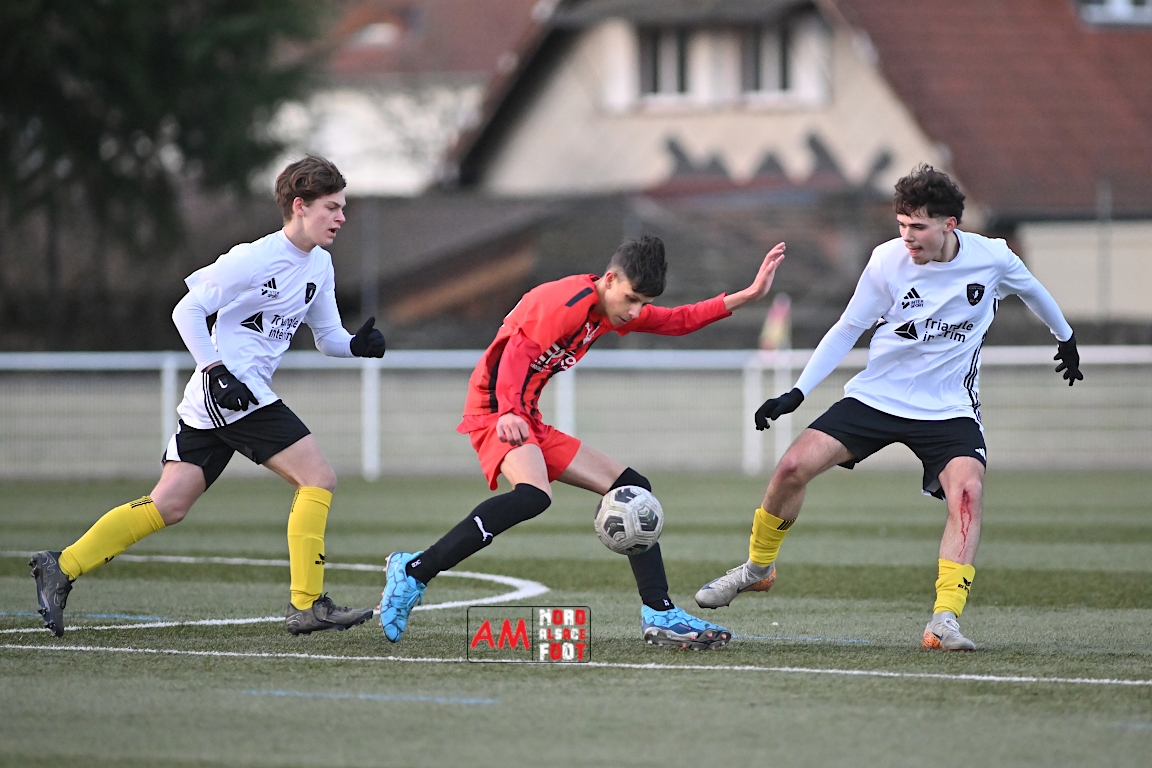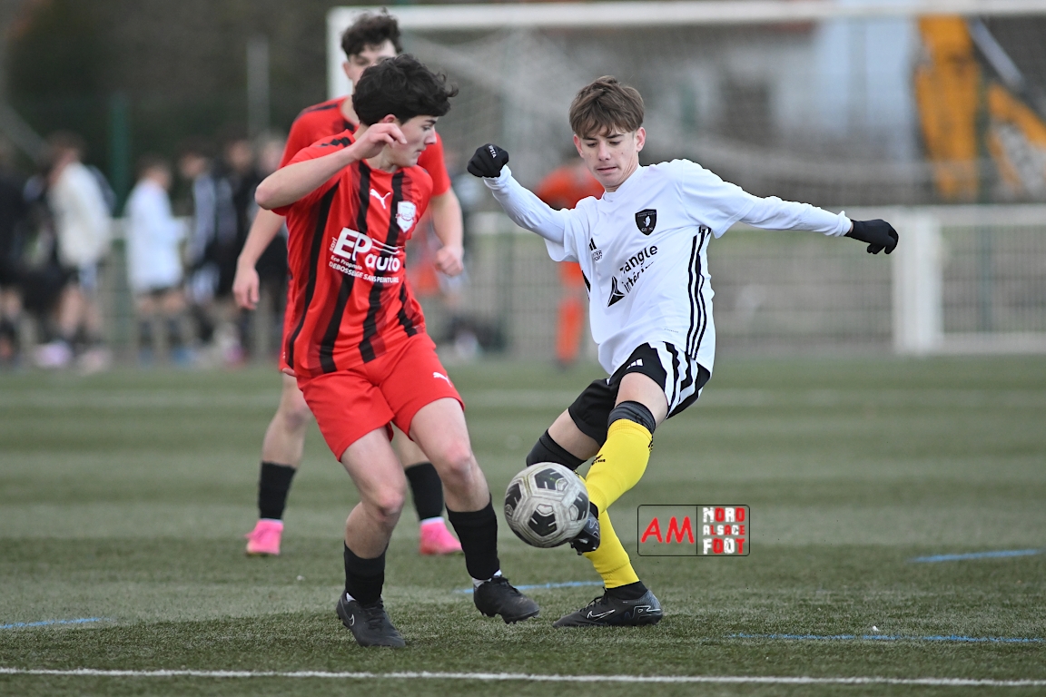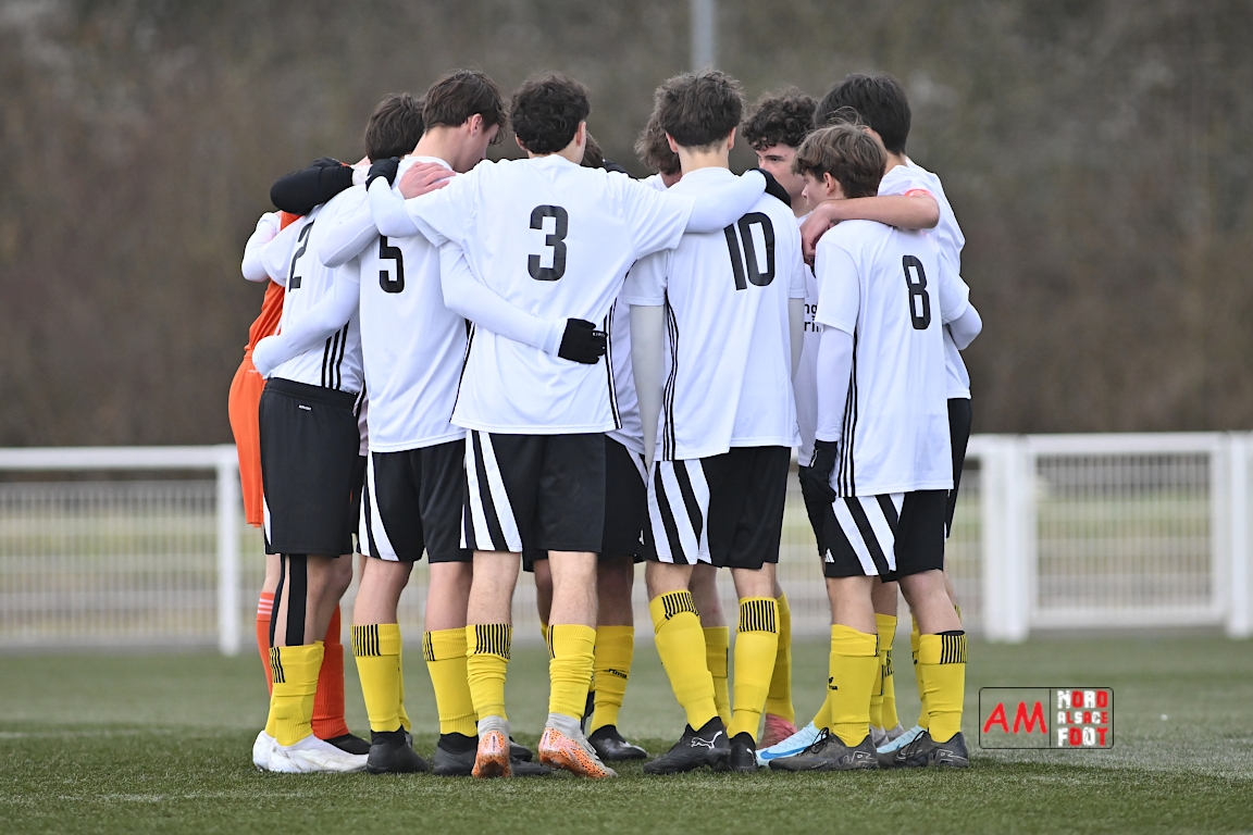 A l’occasion de la douzième journée de championnat chez les U17 Régional 2 (Poule C), le Groupement Jeunes d’Alsace du Nord accueillait le FC Sainte Marguerite afin de tout mettre en oeuvre pour remporter cette rencontre avec la seconde place en ligne de mire, et ce, face à des adversaires restants sur deux matchs sans défaite. Après une première période se soldant par un large avantage en faveur des locaux (3-0), ls visiteurs allaient refaire leur retard en seconde période avant que les protégés du duo Treger/Beill ne parviennent à arracher la victoire dans les derniers instants de la partie. Retrouvez, ci-dessous, quelques images de cette rencontre et, pour en apprécier le contenu, veuillez cliquer sur l’une d’entre elles pour afficher le diaporama.