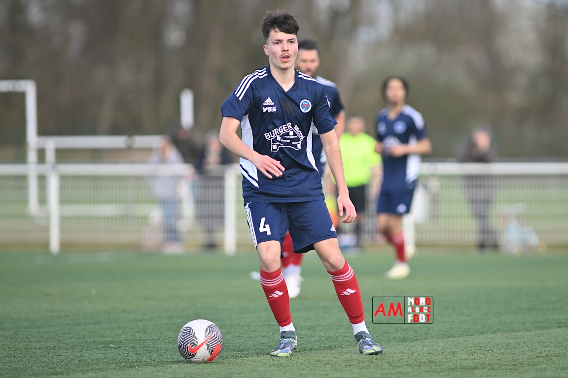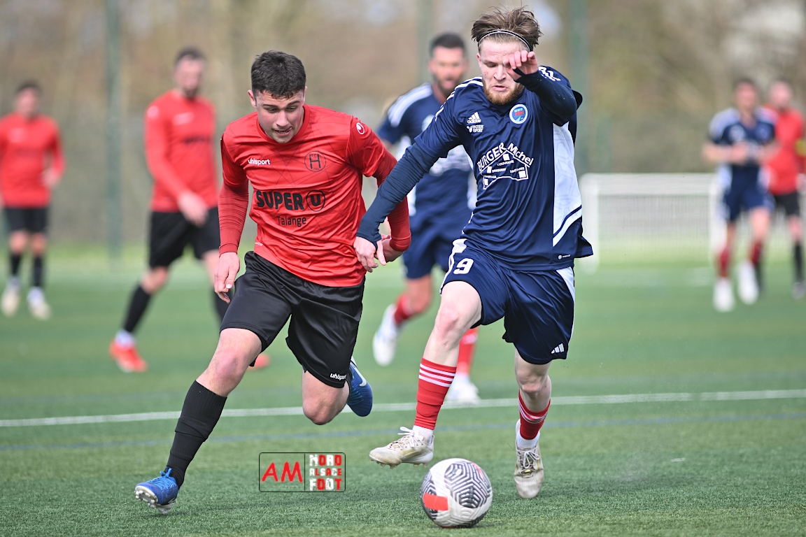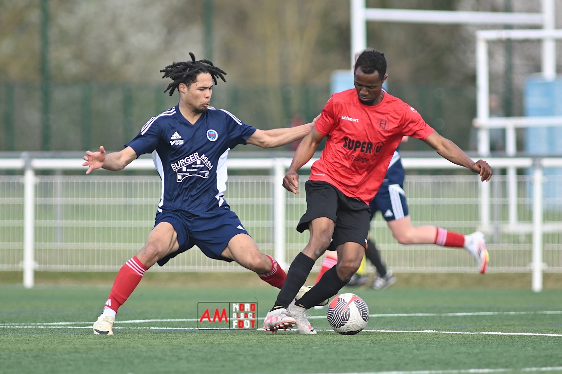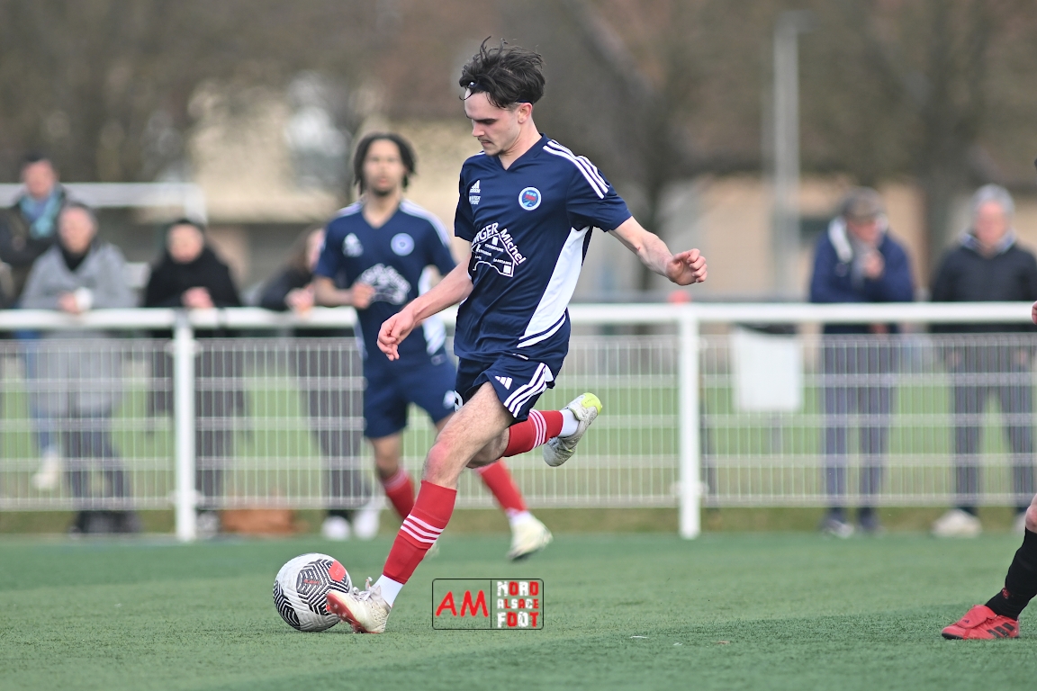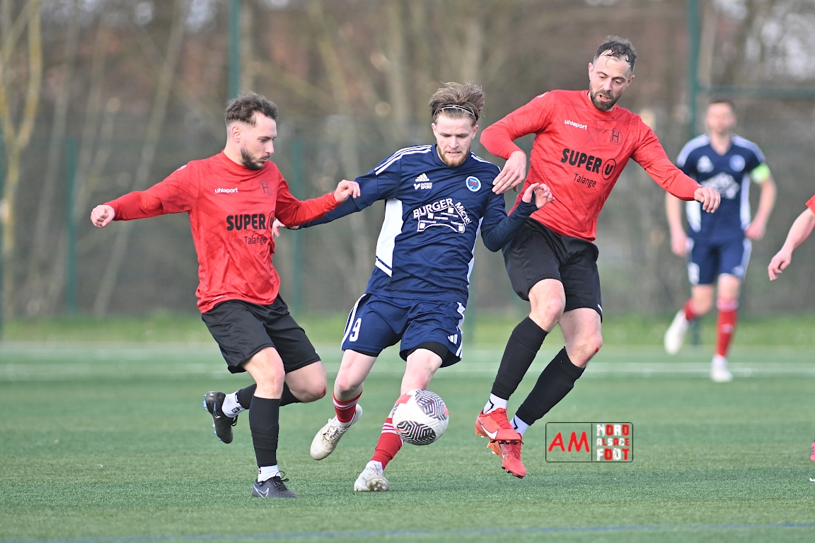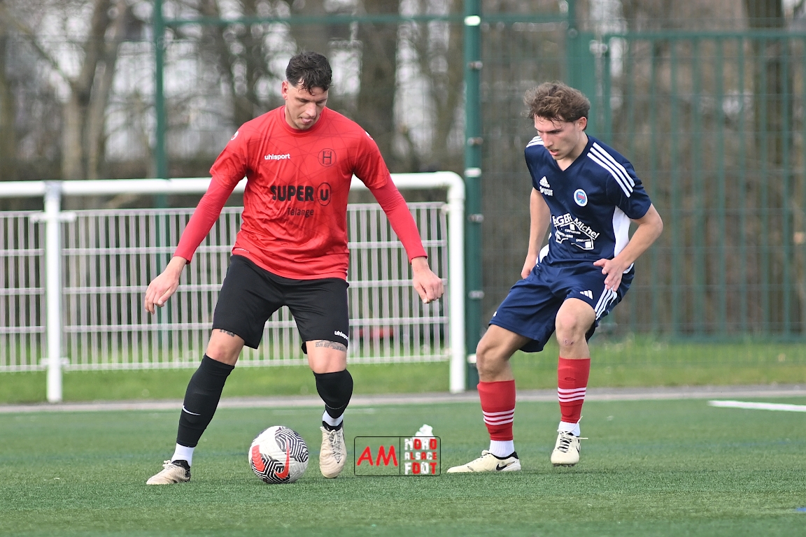 A l’occasion de la dix-neuvième journée de championnat en Régional 1 (Poule B), le FR Haguenau 2 accueillait le FC Hagondange afin de tenter de rectifier le tir après la défaite concédée la semaine dernière face à l’US Oberlauterbach (3-0), et ce, face à la lanterne rouge de ce groupe. Après une première période se soldant par un score nul et vierge, les locaux allaient inscrire deux buts par l’intermédiaire de Delamarre Anthony (49e) et de Bauer Noa (63e) avant que Touati Zakariya ne réduise la marque sur penalty (75e) et, dans les derniers instants du temps réglementaire, les doublures haguenoviennes refirent le break grâce à un penalty de Sonrel Cédric (89e). Retrouvez, ci-dessous, quelques images de cette rencontre et, pour en apprécier le contenu, veuillez cliquer sur l’une d’entre elles pour afficher le diaporama.