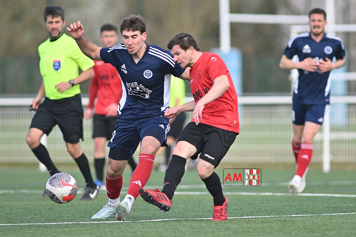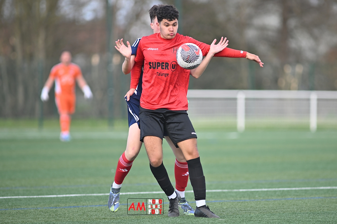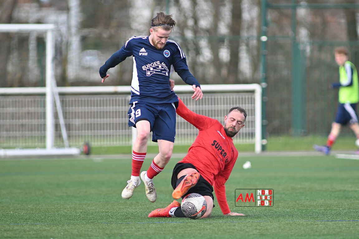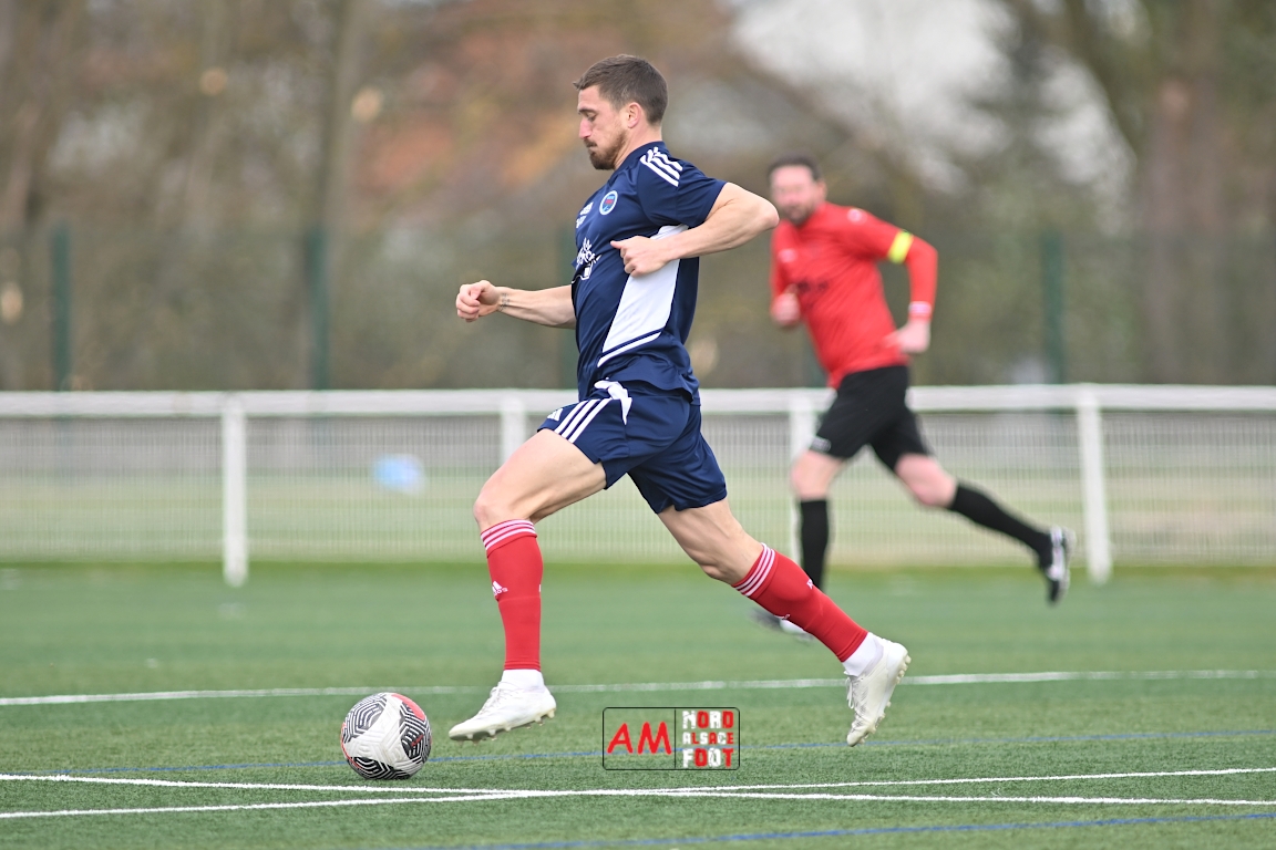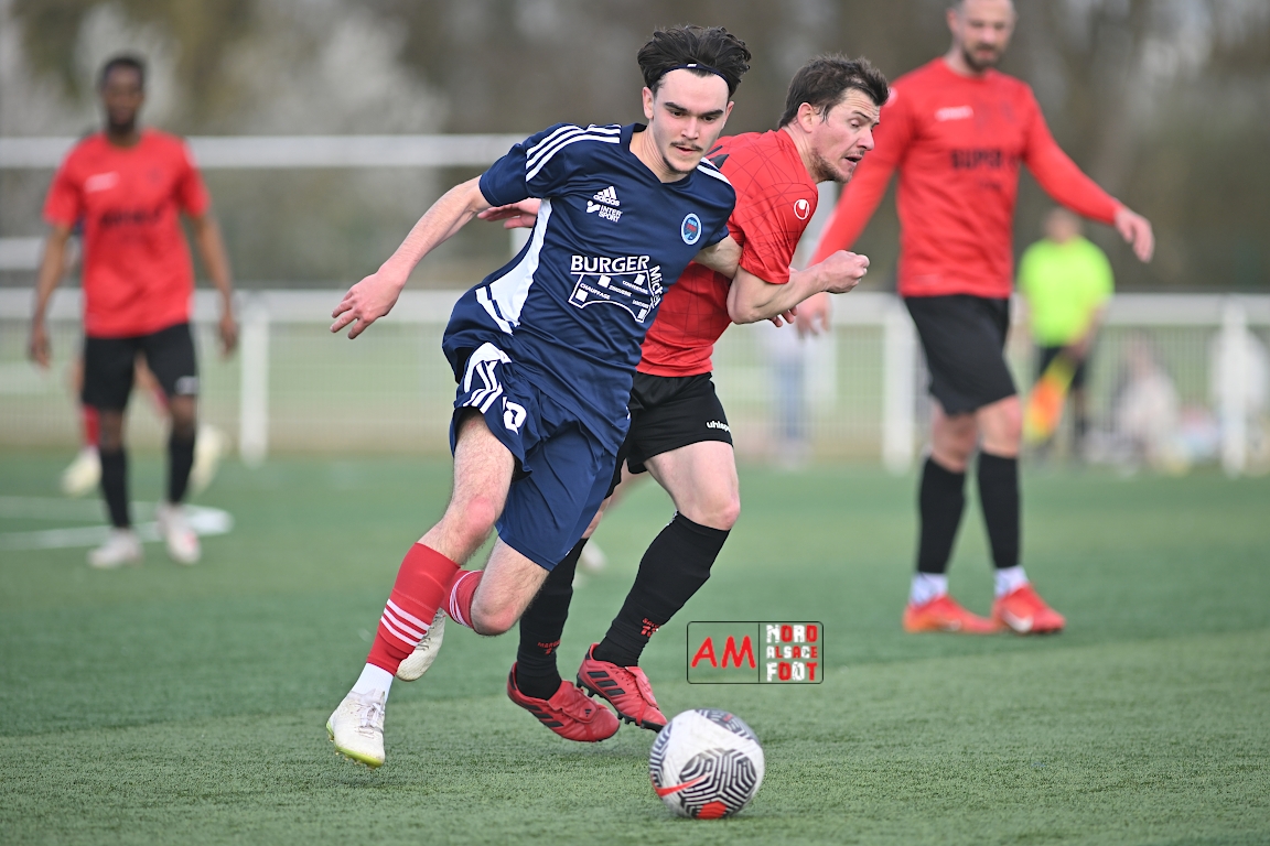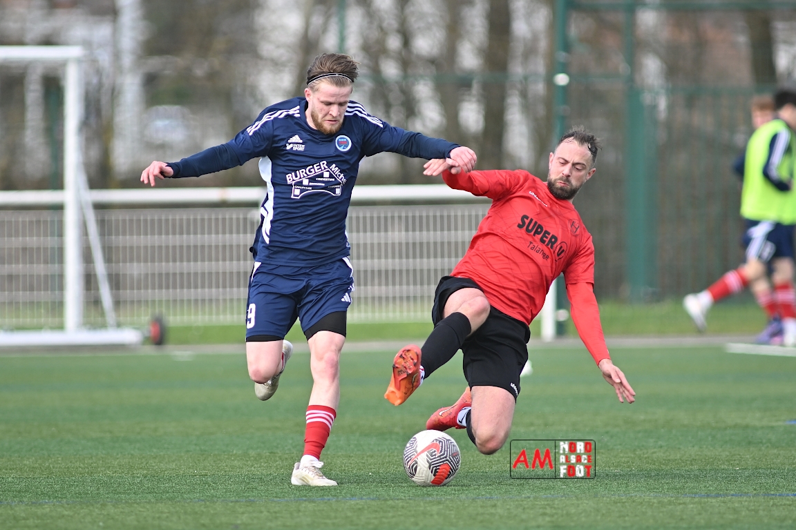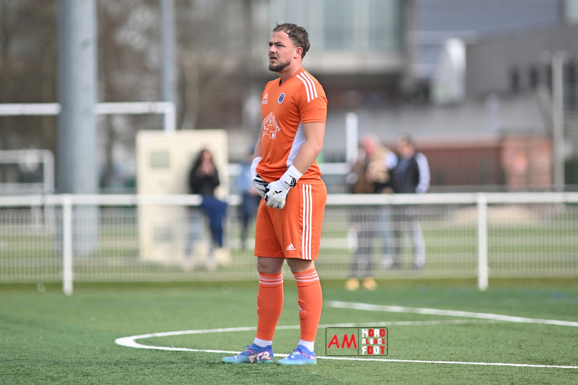 A l’occasion de la dix-neuvième journée de championnat en Régional 1 (Poule B), le FR Haguenau 2 accueillait le FC Hagondange afin de tenter de rectifier le tir après la défaite concédée la semaine dernière face à l’US Oberlauterbach (3-0), et ce, face à la lanterne rouge de ce groupe. Après une première période se soldant par un score nul et vierge, les locaux allaient inscrire deux buts par l’intermédiaire de Delamarre Anthony (49e) et de Bauer Noa (63e) avant que Touati Zakariya ne réduise la marque sur penalty (75e) et, dans les derniers instants du temps réglementaire, les doublures haguenoviennes refirent le break grâce à un penalty de Sonrel Cédric (89e). Retrouvez, ci-dessous, quelques images de cette rencontre et, pour en apprécier le contenu, veuillez cliquer sur l’une d’entre elles pour afficher le diaporama.