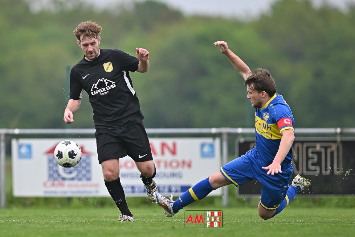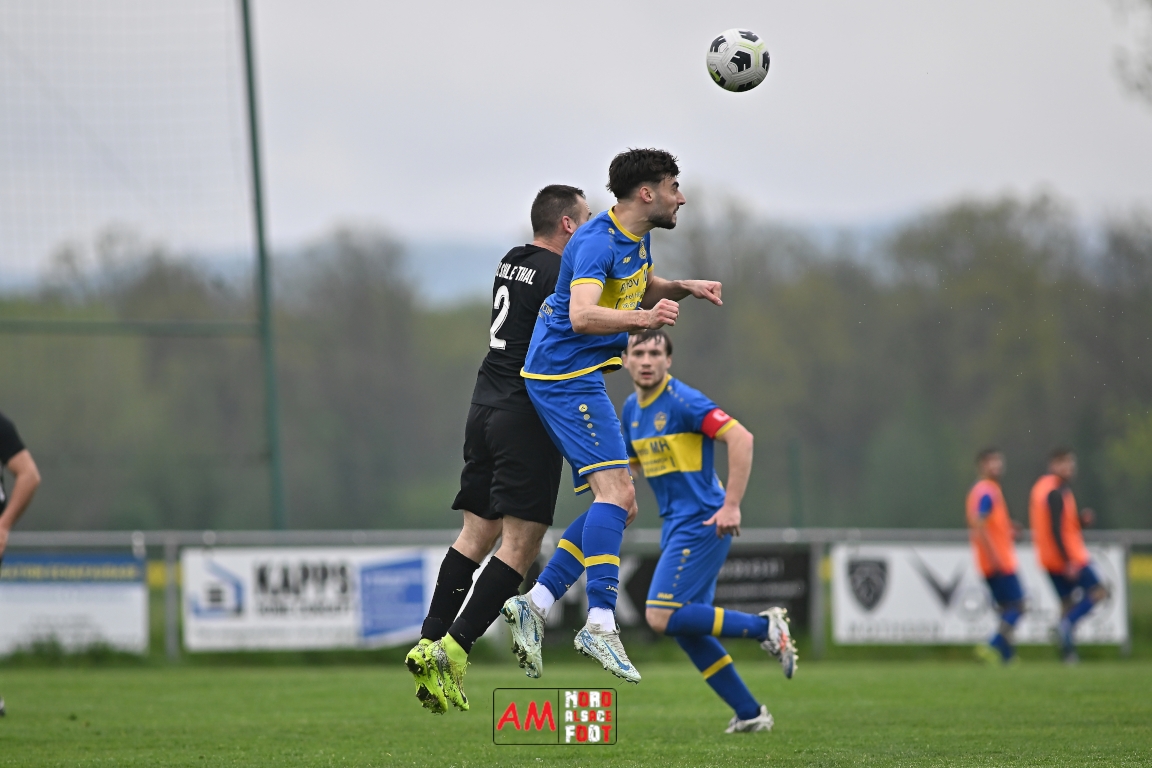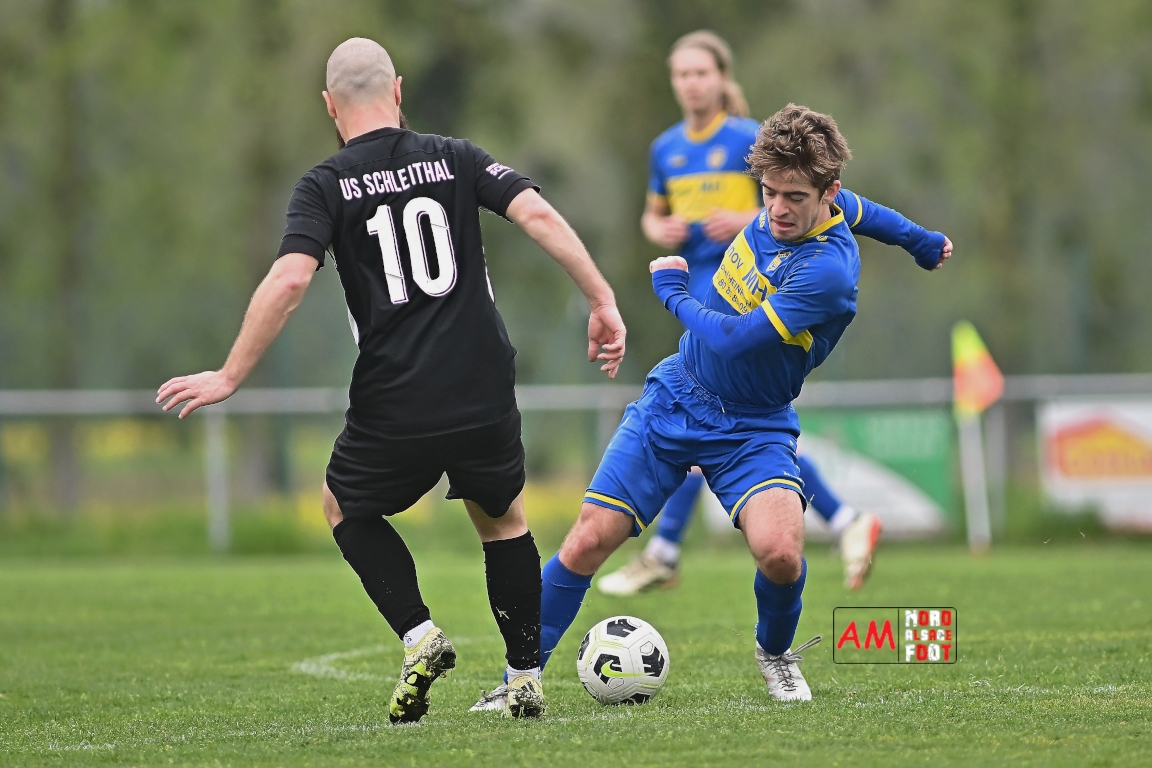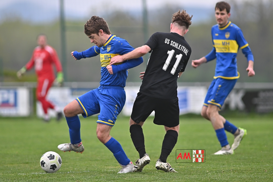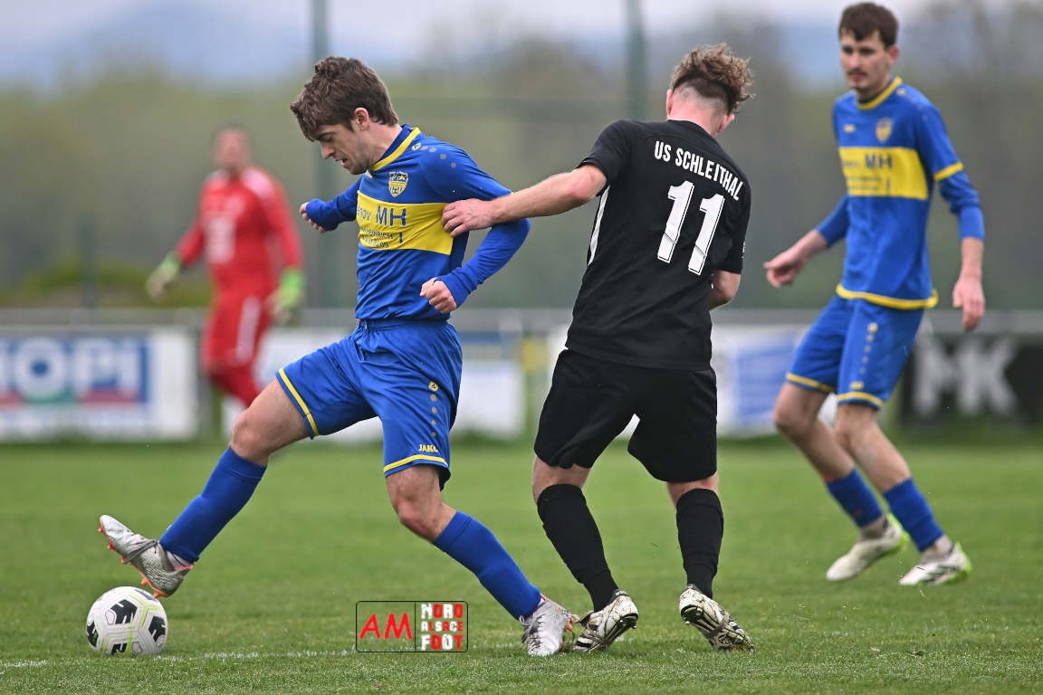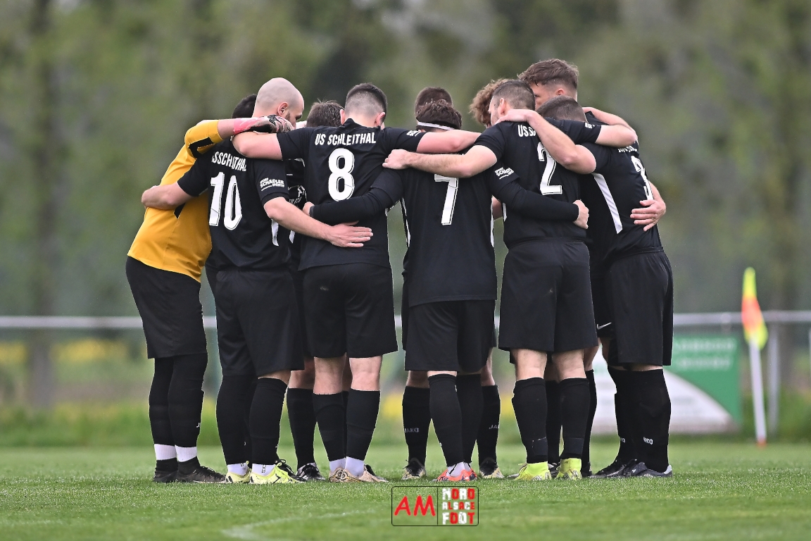 A l’occasion d’un match en retard comptant pour la neuvième journée de championnat en District 5 (Poule B), l’US Schleithal (2e) accueillait l’entente Munchhausen/Mothern 2 (1er) afin de tenter d’infliger un premier revers à leurs adversaires du jour qui, de leur côté, peuvent accuser treize points d’avance en cas de succès ce vendredi matin. Après une première période se soldant par un score nul et vierge, les locaux allaient corriger leurs adversaires en seconde période grâce à des réalisations signées Fischer Michel (55e), Vetter Marvin (69e) et Lienhardt Joey (76e, 90e+2) avant qu’ils ne finissent par largement s’imposer sur ce score de 4-0! Retrouvez, ci-dessous, quelques images de cette rencontre et, pour en apprécier le contenu, veuillez cliquer sur l’une d’entre elles pour afficher le diaporama.