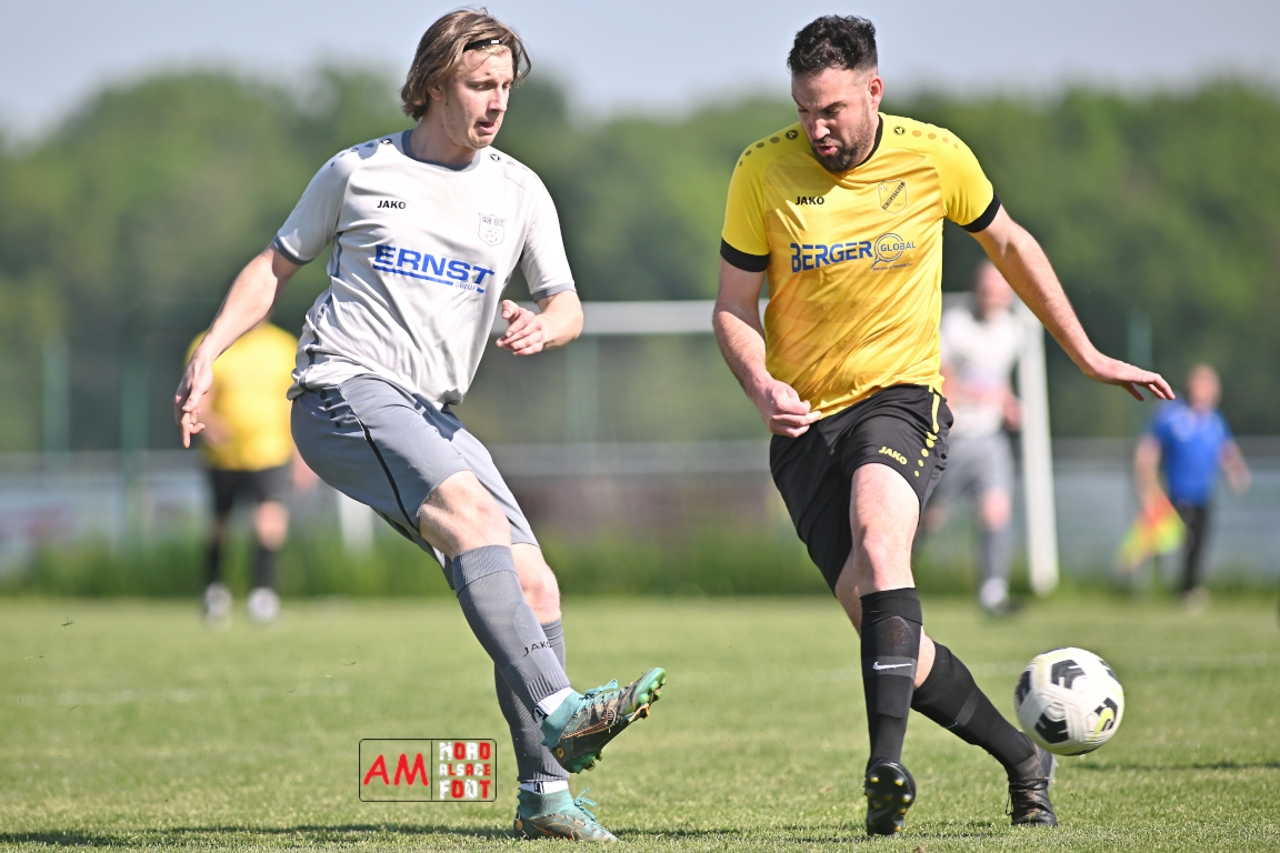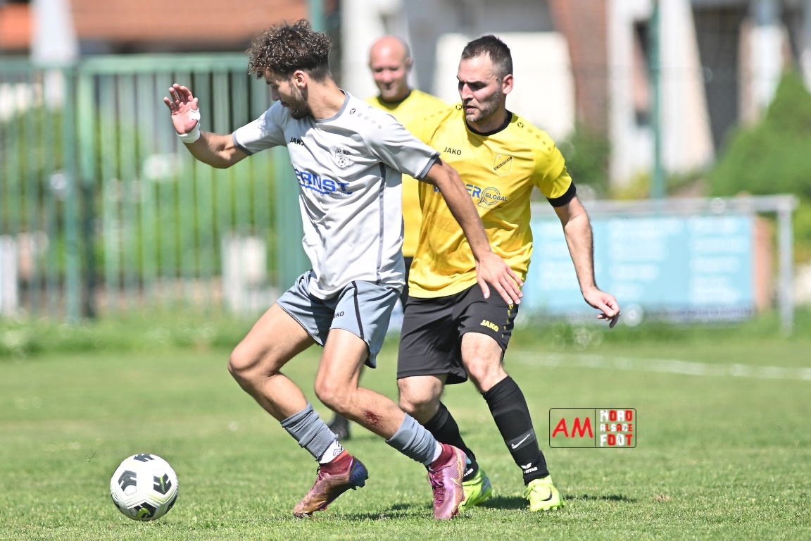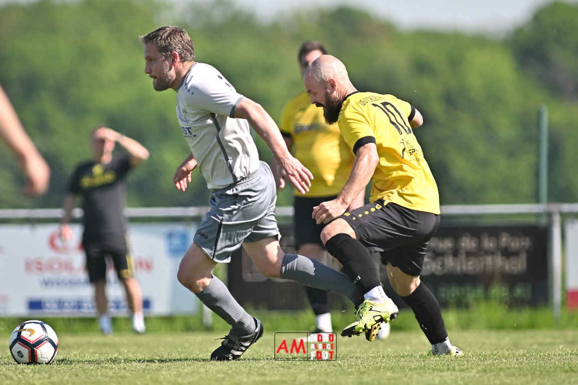 A l’occasion de la seizième journée de championnat en District 5 (Poule B), l’US Schleithal 2 (2e) accueillait le FC Dambach/Neunhoffen 1 (8e) afin de tenter d’enchaîner par une cinquième victoire consécutive pour conforter un peu plus sa place de dauphins de cette poule, et ce, face à des adversaires n’ayant plus gagné un match de championnat depuis le 16 mars dernier et cette victoire face au SC Rittershoffen (1-6). Après une première période se soldant par un léger avantage en faveur des locaux grâce à des réalisations signées Policarpo Kévin (23e) et Schmitt Geoffrey (41e) contre un but inscrit en début de match par Lindauer Ludovic (6e) en faveur des visiteurs, les locaux allaient faire le break peu avant l’heure de jeu par l’intermédiaire de Policarpo Kévin (58e) avant que les visiteurs ne trouvent les ressources nécessaires pour réduire la marque grâce à un but inscrit par Kieger Ludovic (72e) et, au cours des dix dernières minutes de jeu, les jaunes et noirs allaient ajouter deux buts au compteur par l’intermédiaire de Policarpo Kévin (82e) et Lienhardt Joey (85e) avant qu’ils ne s’imposent sur ce score de 5-2. Retrouvez, ci-dessous, quelques images de cette rencontre et, pour en apprécier le contenu, veuillez cliquer sur l’une d’entre elles pour afficher le diaporama.