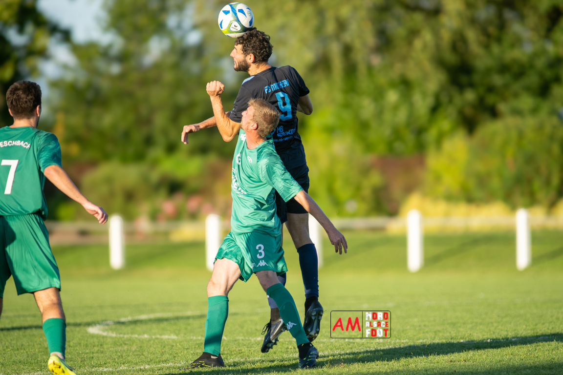 A l’occasion du second tour de la Coupe de France – Crédit Agricole, le FC Eschbach (District 3) accueillait le FC Mothern (District 1) afin de tenter un petit exploit, et ce, face à des adversaires évoluant dans l’élite du District. Après une première période se soldant par un avantage confortable en faveur des Mothernois grâce à des réalisations signées Bender Philippe (20e, 36e) et grâce à un but signé Klin Bryan (30e) contre un but inscrit par Barbier Lucas (33e) en faveur des locaux, les deux équipes allaient se neutraliser en seconde période avant que les visiteurs ne finissent par décrocher leur qualification en s’imposant sur ce score de 1-3. Retrouvez, ci-dessous, quelques images de cette rencontre et, pour en apprécier le contenu, veuillez cliquer sur l’une d’entre elles pour afficher le diaporama.