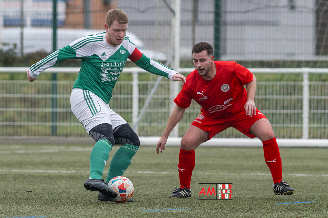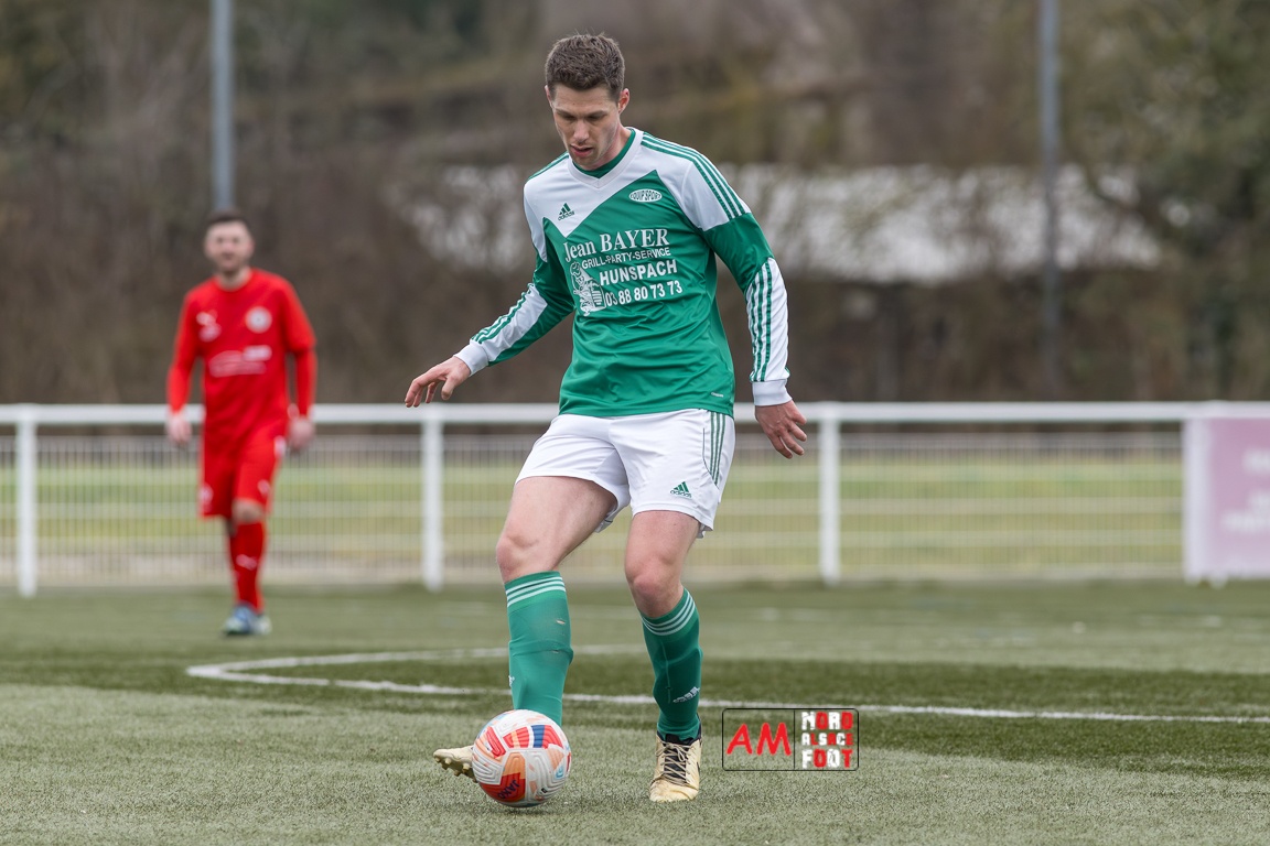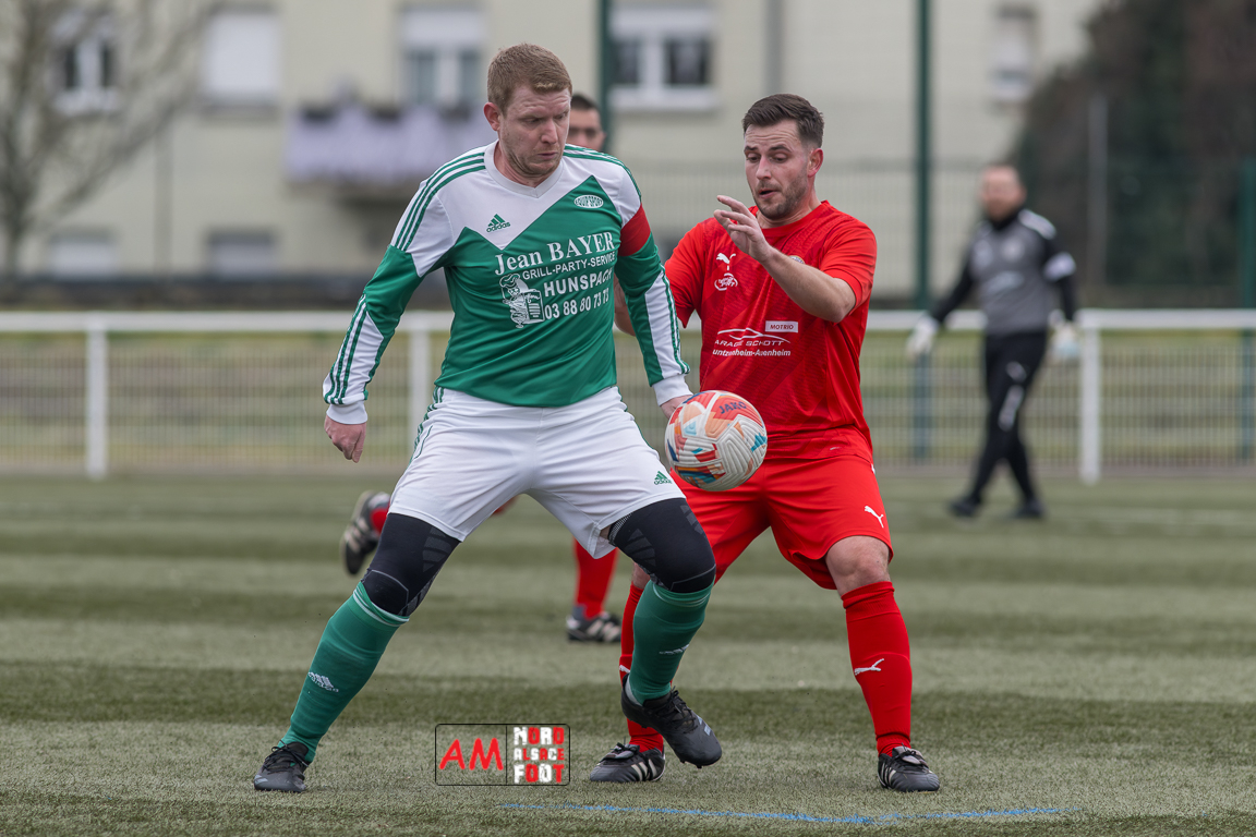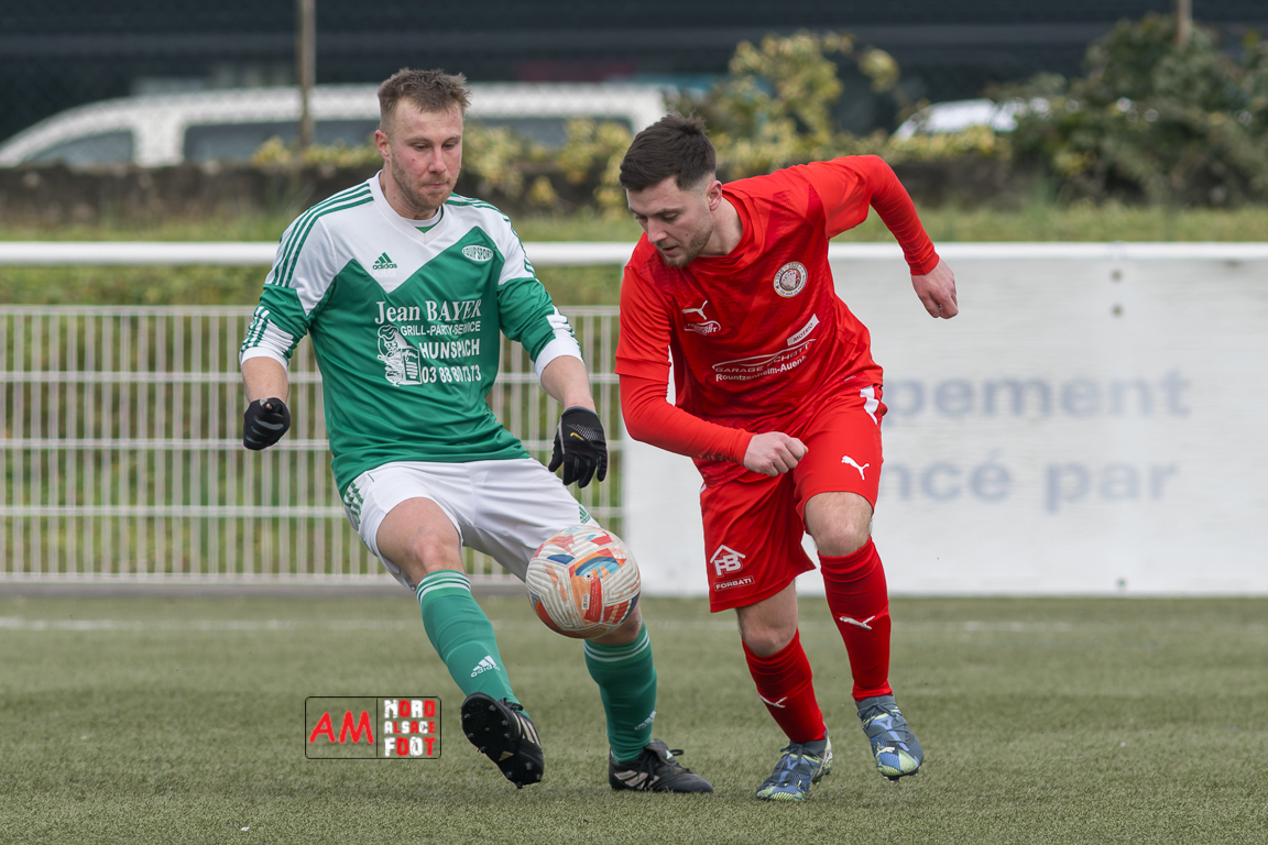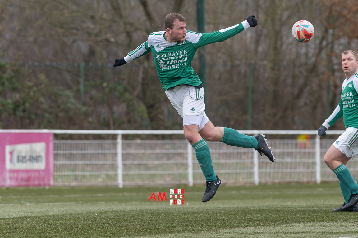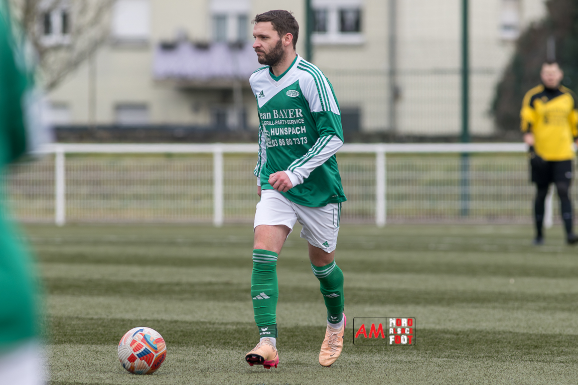A l’occasion d’un match en retard comptant pour la onzième journée de championnat en District 3 (Poule B), l’AS Hunspach 2 accueillait, dimanche matin au stade des Turcos de Wissembourg, le SR Rountzenheim/Auenheim afin de tout mettre en oeuvre pour chercher une victoire pouvant leur permettre de passer devant leurs adversaire du jour au classement. Menée dès la 7e seconde de jeu sur une ouverture du score de Stoll Cédric pour le SR Rountzenheim/Auenheim, l’AS Hunspach 2 a progressivement repris le contrôle de la rencontre avant de parvenir à égaliser avant la pause grâce à Weishaar Florent (45e+2). Au retour des vestiaires, les verts ont accentué leur pression et elle a été récompensé par un but de Fassel Dylan (66e). En fin de rencontre, Weishaar Florent inscrit un doublé dans le temps additionnel (90e+1) scellant la victoire pour son équipe au terme d’un match où elle aura su réagir après un début de partie défavorable. Retrouvez, ci-dessous, quelques images de cette rencontre et, pour en apprécier le contenu, veuillez cliquer sur l’une d’entre elles pour afficher le diaporama.
