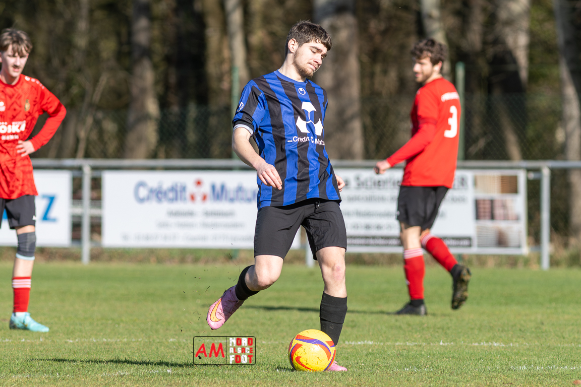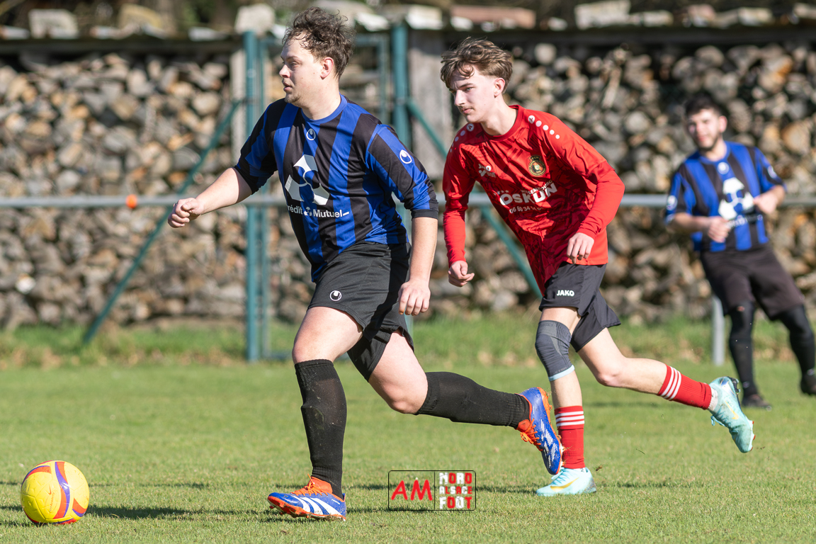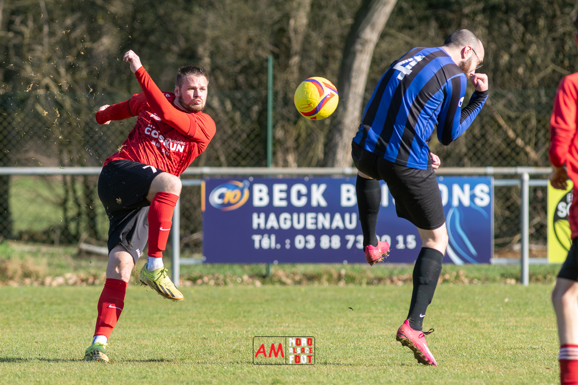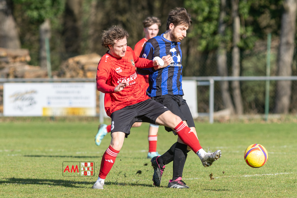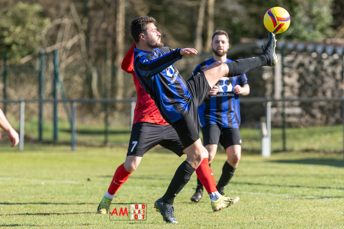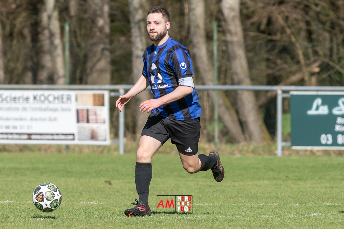 A l’occasion d’un match en retard comptant pour le tour intermédiaire du Challenge des réserves – Vivialys, le FC Niederroedern/OS 2 (District 8 Accession) accueillait le FC Niederlauterbach 2 (District 7 maintien) avec l’intention de redémarrer la compétition officielle par une qualification, et ce, face à des adversaires voulant faire respecter la hiérarchie. Après une première période se soldant par un avantage confortable en faveur des visiteurs grâce à un doublé de Jung Alexandre (18e, 28e), les locaux allaient parvenir à refaire leur retard en seconde période grâce à des buts inscrits par Wurth Joeffrey (54e) et Metzger Gaetan (64e) avant que Jung Alexandre ne s’offre un triplé (73e) permettant au FC Niederlauterbach 2 de valider sa qualification pour les seizièmes de finale de la compétition. Retrouvez, ci-dessous, quelques images de cette rencontre et, pour en apprécier le contenu, veuillez cliquer sur l’une d’entre elles pour affiche le diaporama.