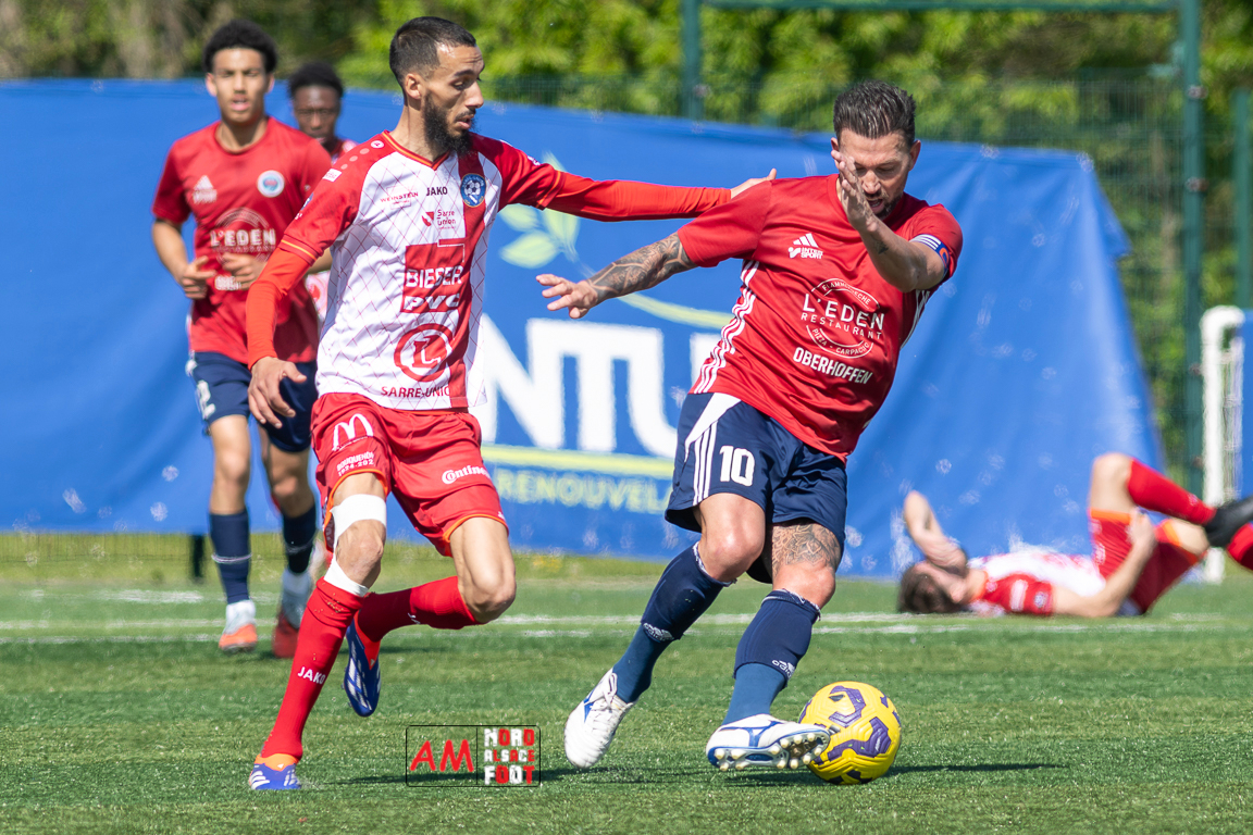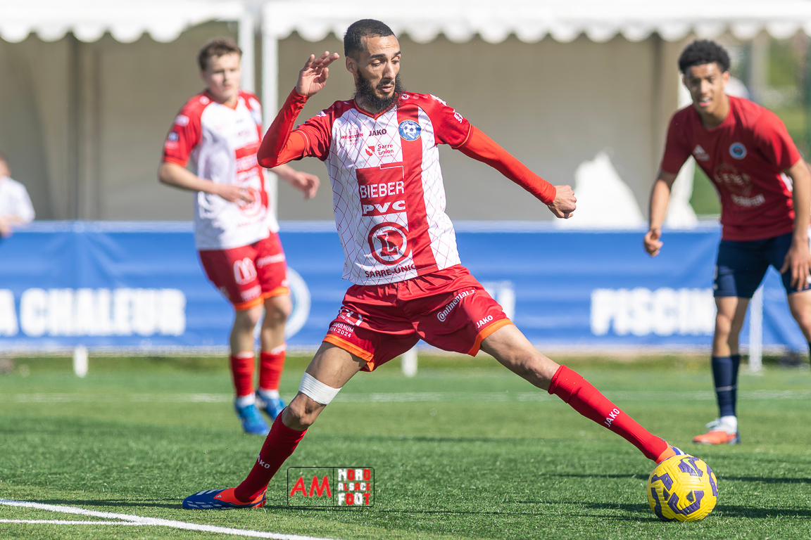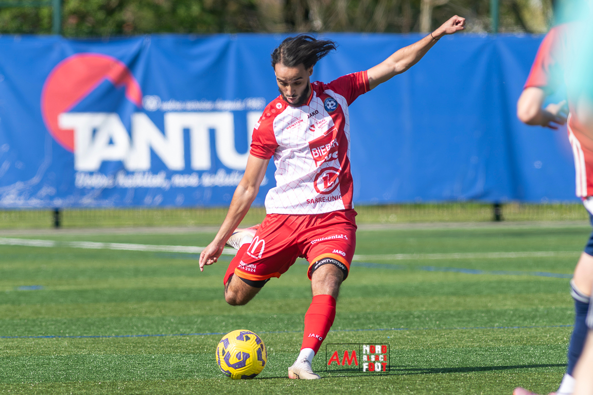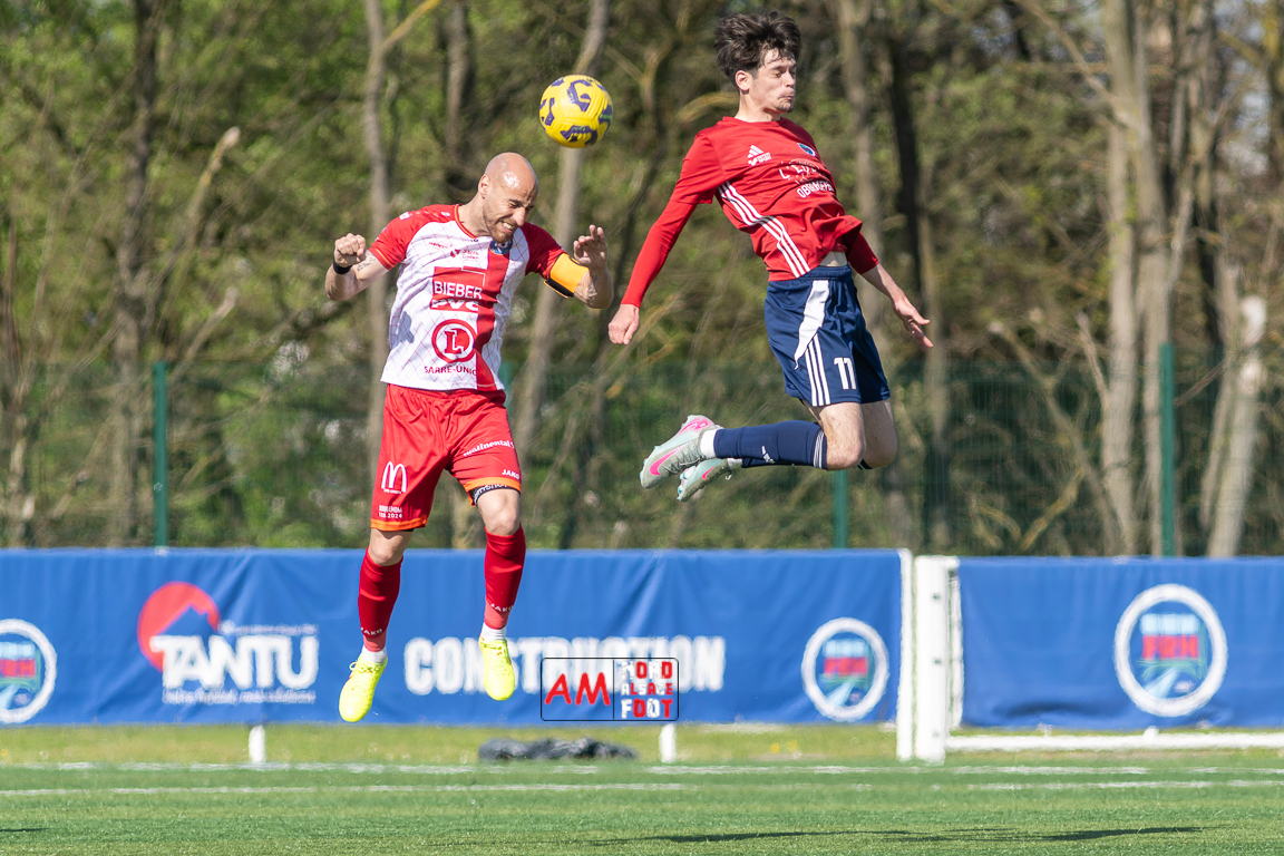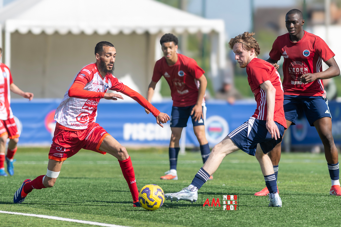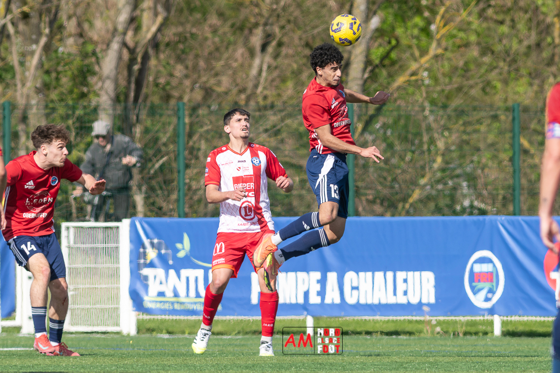 A l’occasion de la 22e journée de championnat en Régional 1 (Poule B), le FR Haguenau 2 (11e) accueillait l’US Sarre-Union (8e) afin de tenter de valider, au point près, leur maintien dans la division en faveur d’un succès, et ce, face à des adversaires pouvant encore jouer les places d’honneur. Après une première période se soldant par un léger avantage en faveur des visiteurs grâce à des réalisations signées Guendez Uzed (15e) et Aroustanov Robert (24e) contre une ouverture du score locale signée Klein Mathéo (7e), les visiteurs font le break à la 48e minute de jeu grâce à un doublé d’Aroustanov Robert avant que Mazroui Amine ne réduise la marque à la 59e minute de jeu, les deux équipes se neutralisant ensuite jusqu’au coup de sifflet final. Retrouvez, ci-dessous, quelques images de cette rencontre et, pour en apprécier le contenu, veuillez cliquer sur l’une d’entre elles pour afficher le diaporama.