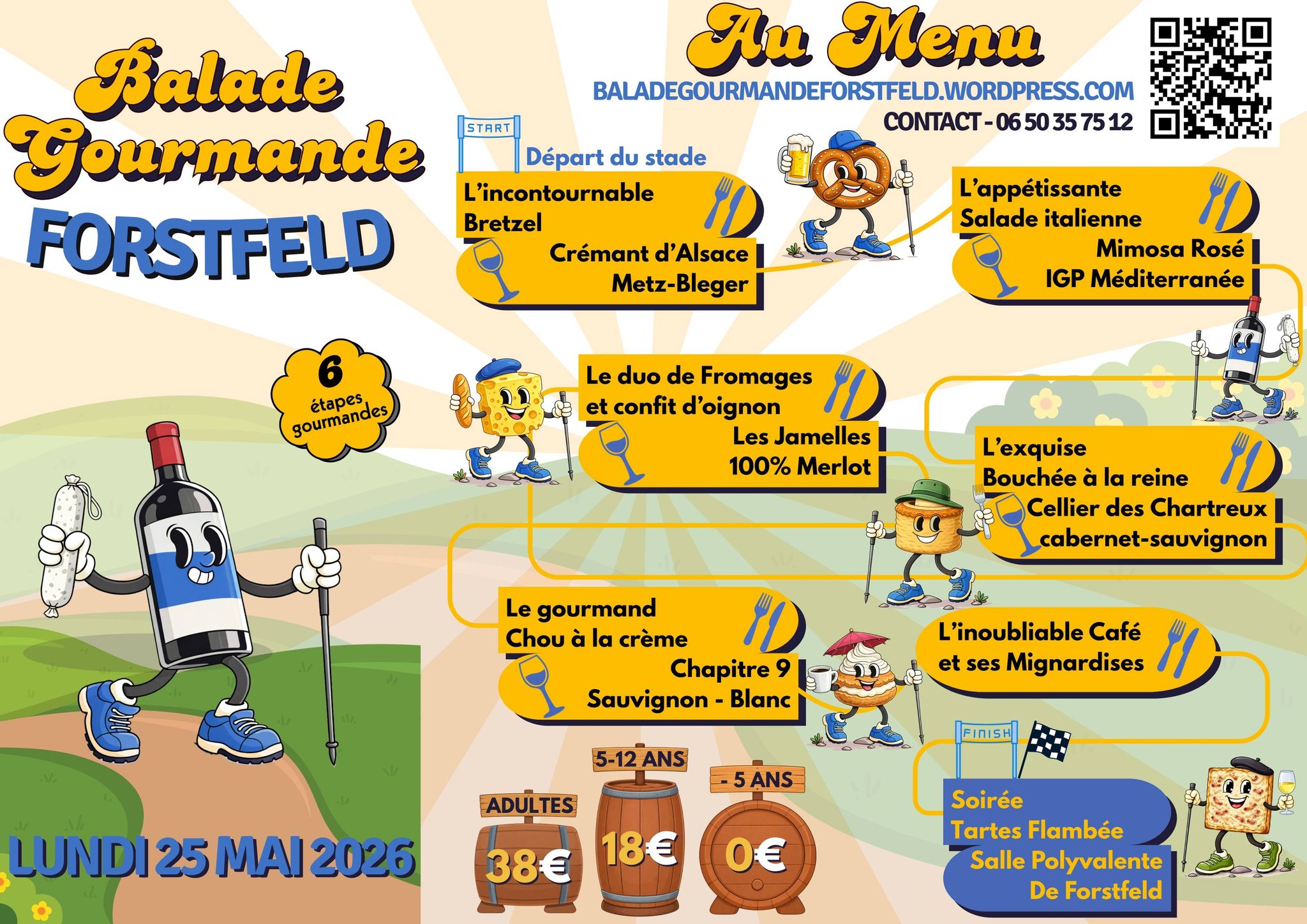 L’Association Sportive de Forstfeld organise, le lundi 25 mai prochain, une balade gourmande au départ du stade. Cette balade se fera en six étapes avant qu’une soirée tartes flambées ne se tienne dans la salle polyvalente du village situé à côté du club house. Le prix de la participation est fixée à 38€/Adulte (18€/enfant de 5 à 12 ans). Pour vous inscrire, veuillez télécharger le formulaire d’inscription en cliquant sur ce lien. Pour valider votre participation, veuillez envoyer le formulaire accompagné de votre règlement (par chèque uniquement) à l’attention de Hervé Durand, 9 rue des Romains, 67480 Forstfeld. Plus de renseignements en composant le 0650357512.